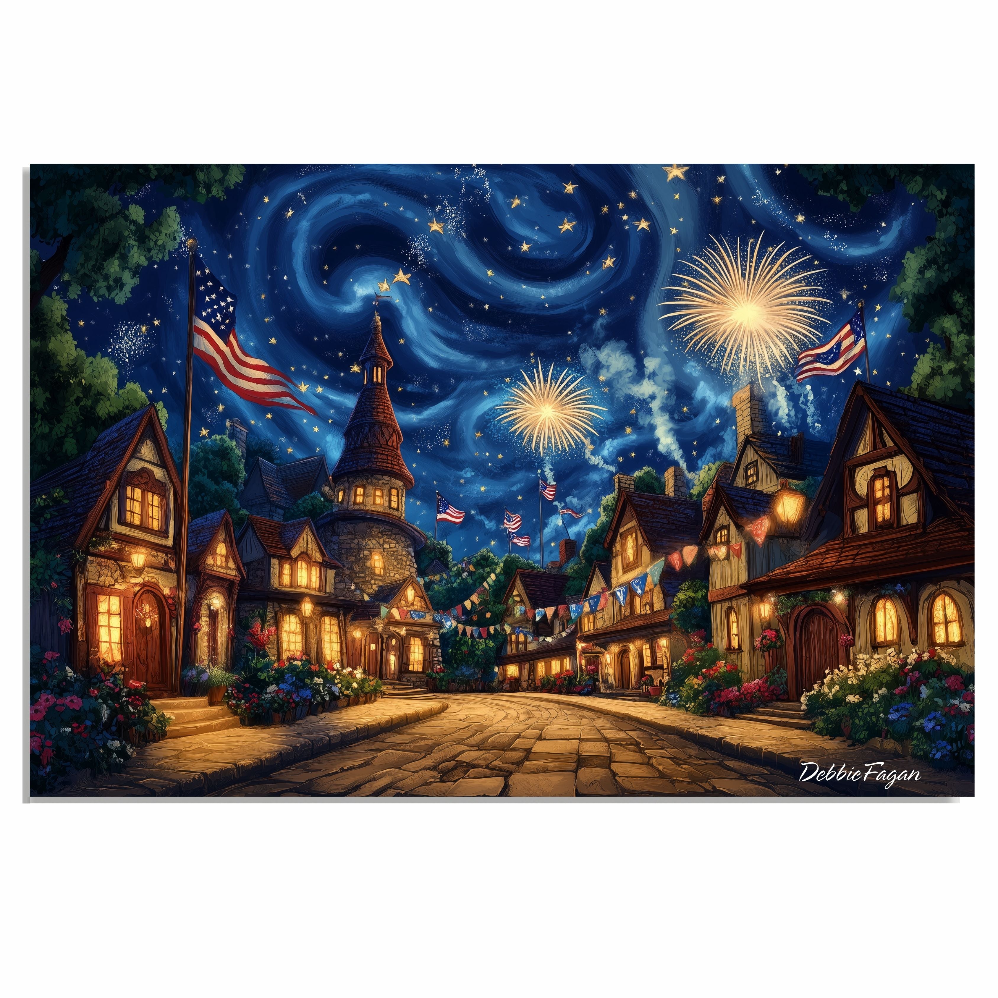 Celebrate American spirit with this vibrant folk art print featuring fireworks, waving flags, and a charming village under a swirling starry sky. Perfect for patriotic home décor, this festive artwork captures the warmth and wonder of Independence Day