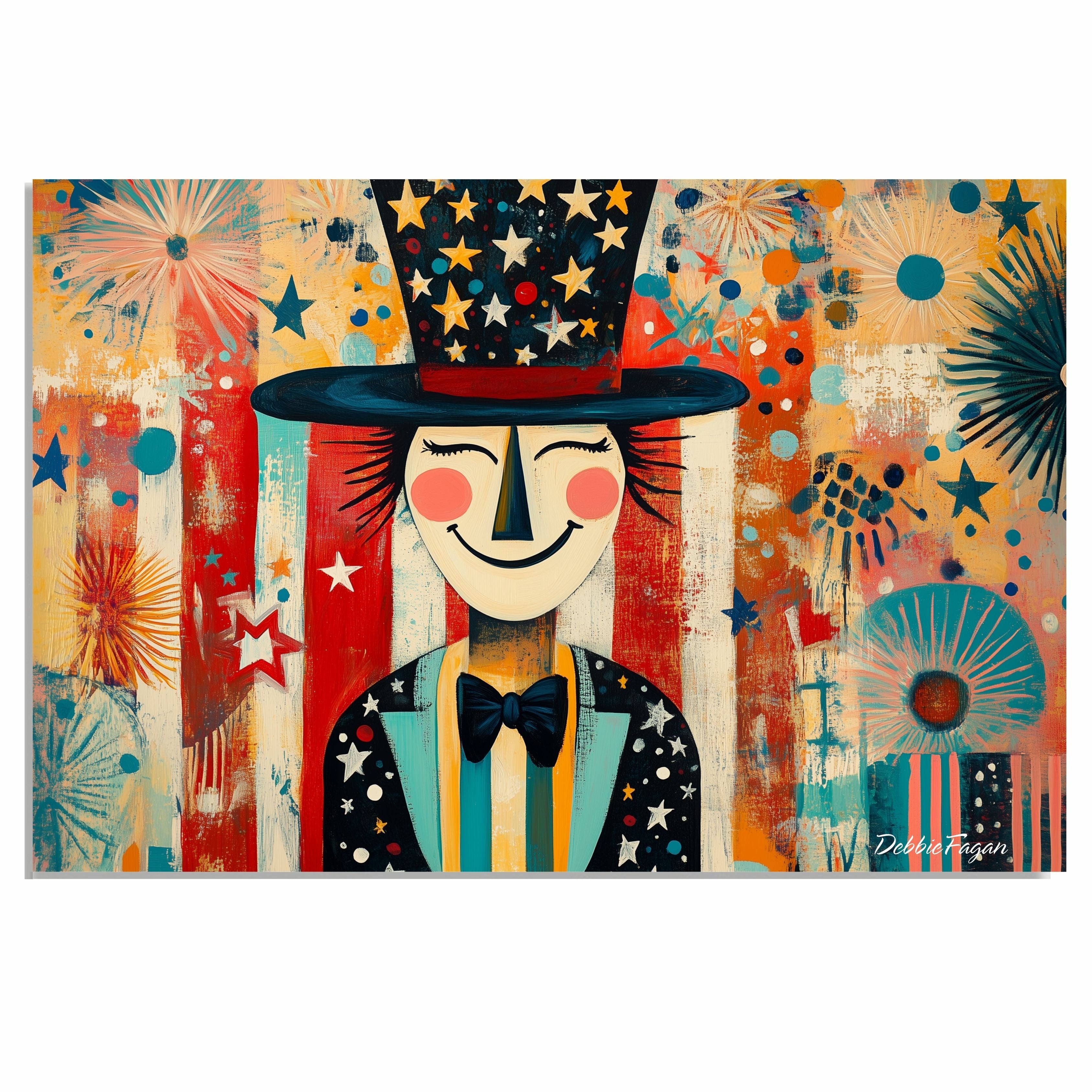 Celebrate American spirit with this vibrant folk art print featuring fireworks, waving flags, and a charming village under a swirling starry sky. Perfect for patriotic home décor, this festive artwork captures the warmth and wonder of Independence Day