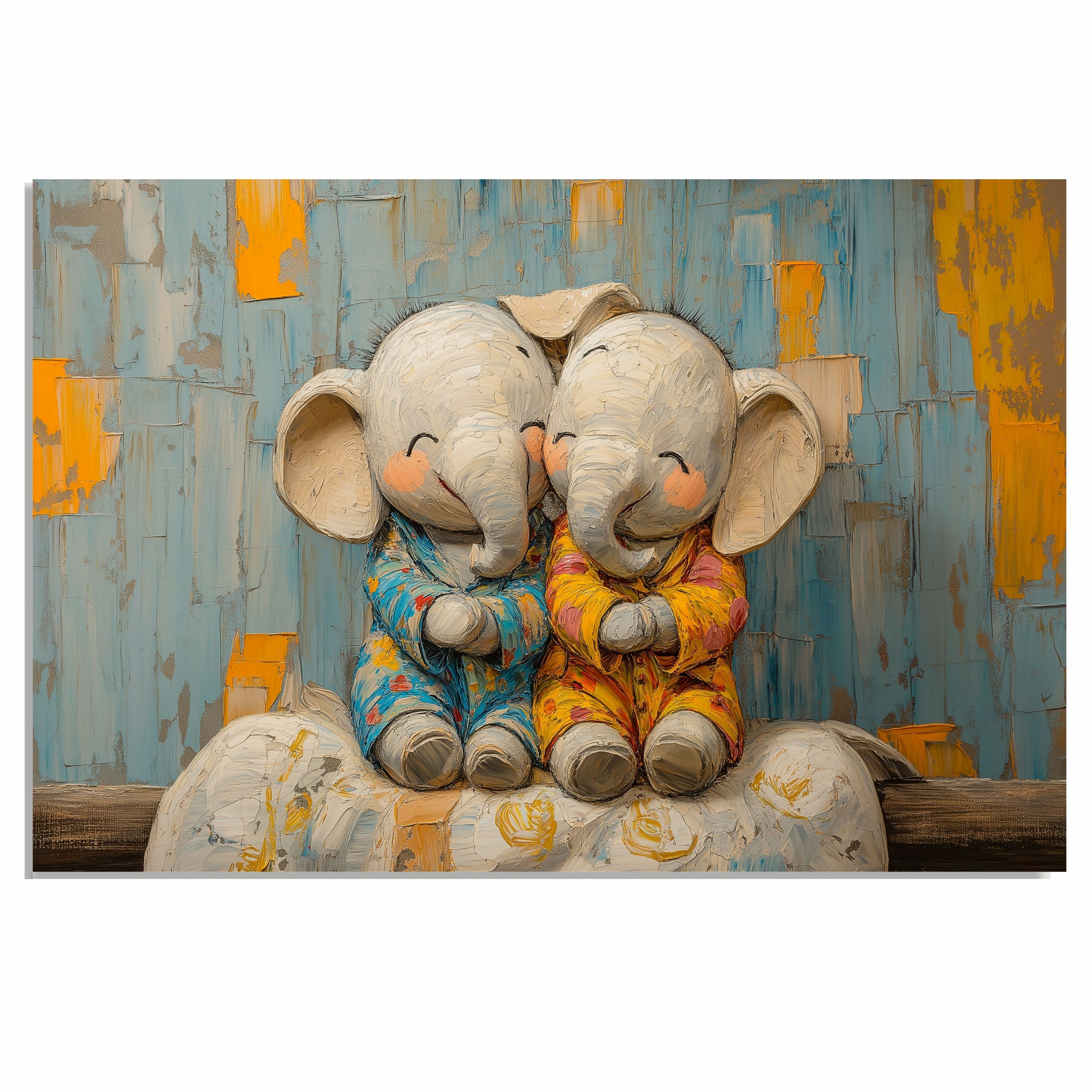 This heartwarming painting shows two baby elephants snuggling close in bright, cozy pajamas. Their joyful expressions radiate love and innocence, set against a richly textured abstract background in blue and orange hues. A perfect gift for elephant lovers or as a cheerful addition to a nursery or child’s room.