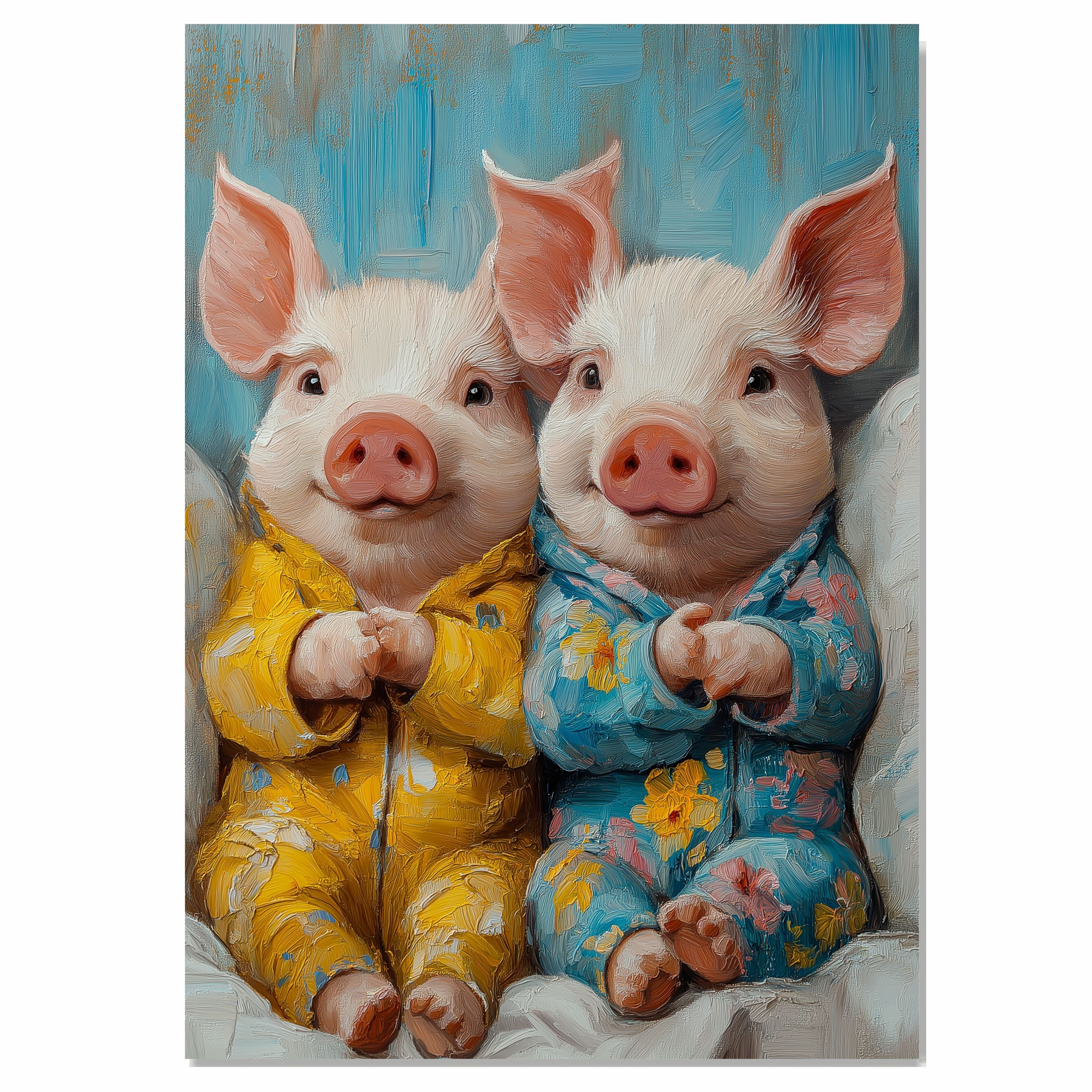 Bring charm and joy to your space with this delightful painting of two cheerful piglets dressed in vibrant floral pajamas. Captured in a whimsical and cozy pose, these little pigs radiate warmth and innocence. Perfect for animal lovers or anyone wanting to add a lighthearted touch to their surroundings. Ideal for nurseries, children’s rooms, or as a playful gift.