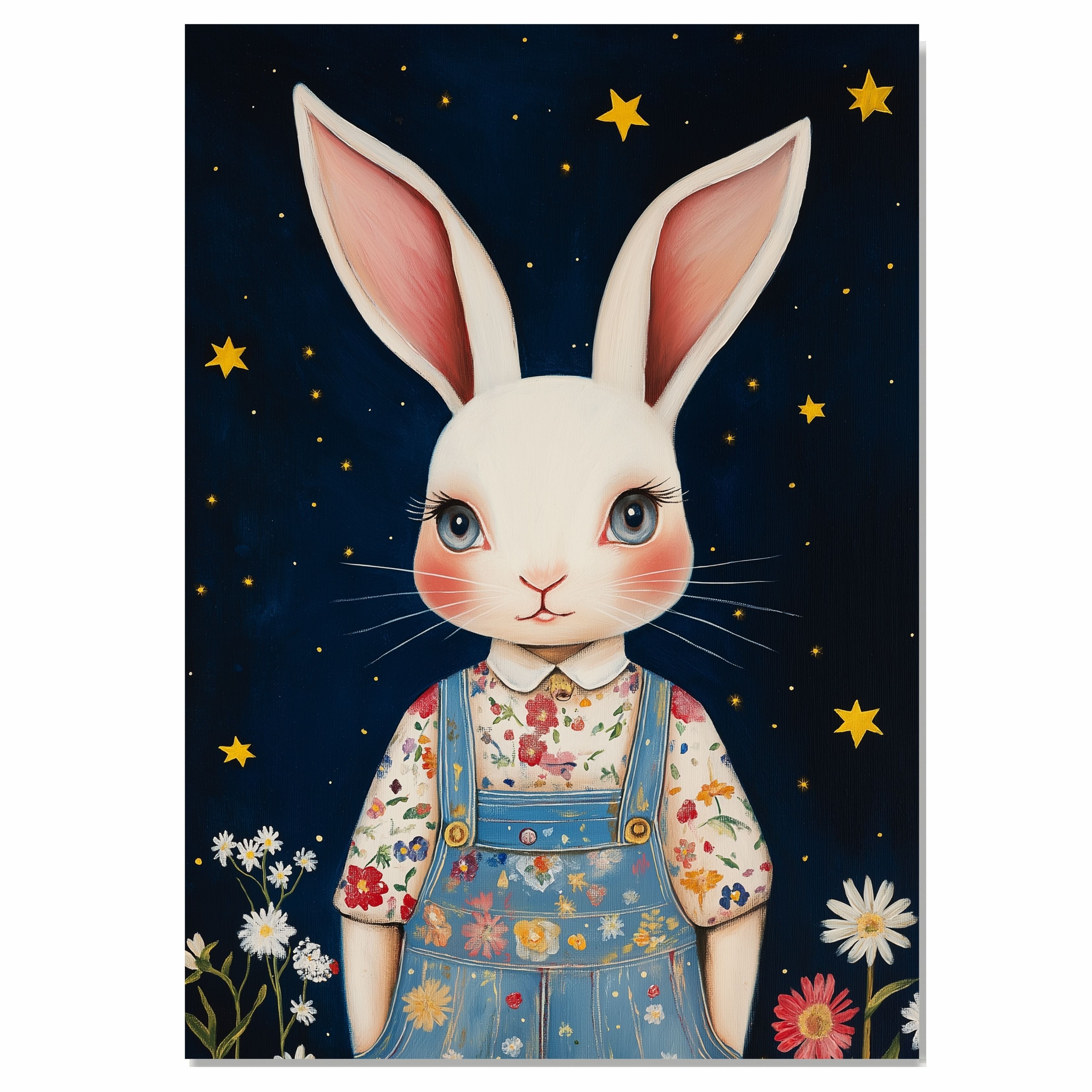 Brighten your space with this hand painted artwork featuring an adorable white bunny in floral overalls surrounded by flowers and stars A magical and colorful addition to nursery kids room or a thoughtful gift for bunny lovers and families.