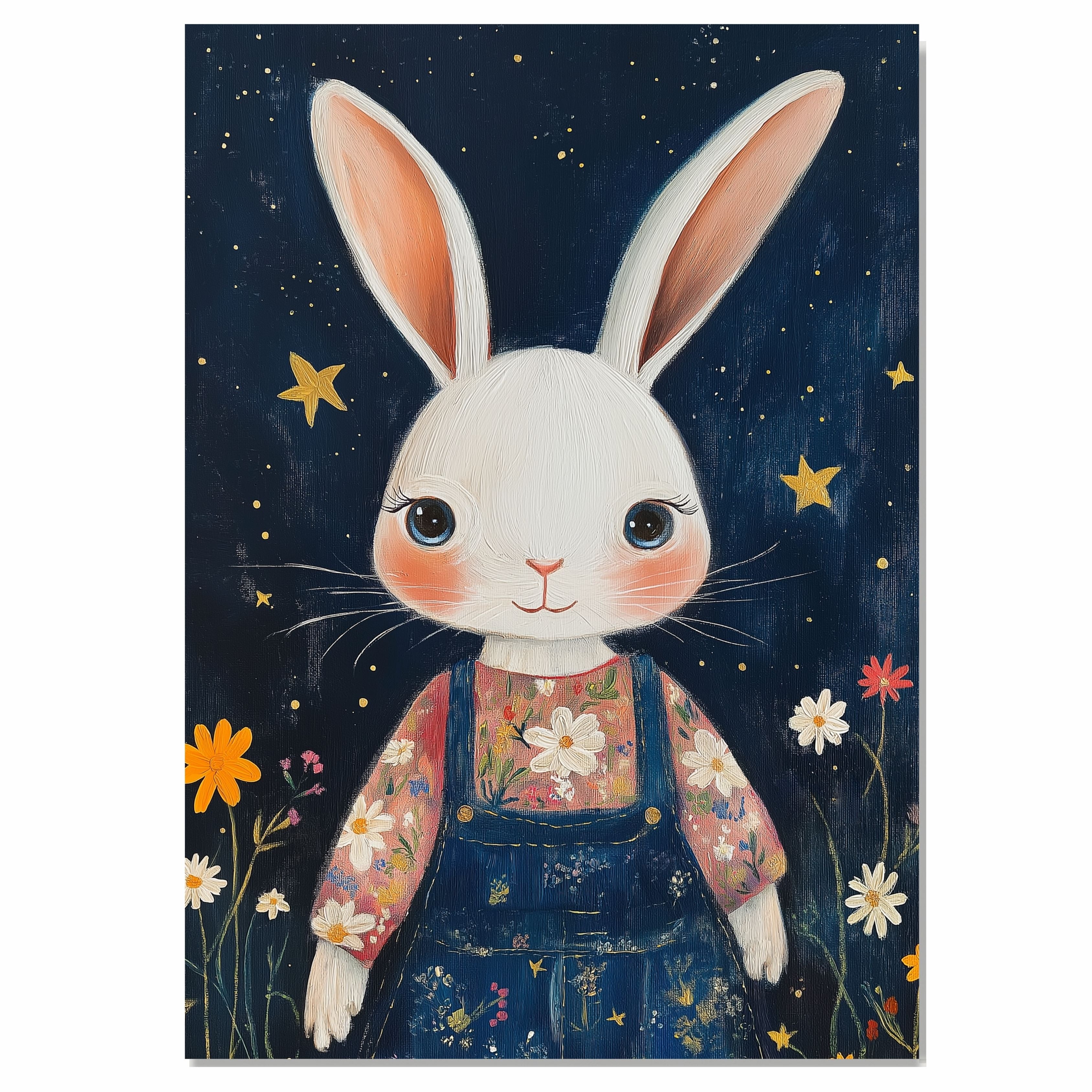 Bring pure charm to your space with this hand painted artwork featuring an adorable white bunny wearing floral overalls under a dreamy starry night sky A sweet and colorful addition to nursery kids room or a perfect gift for bunny lovers and families.