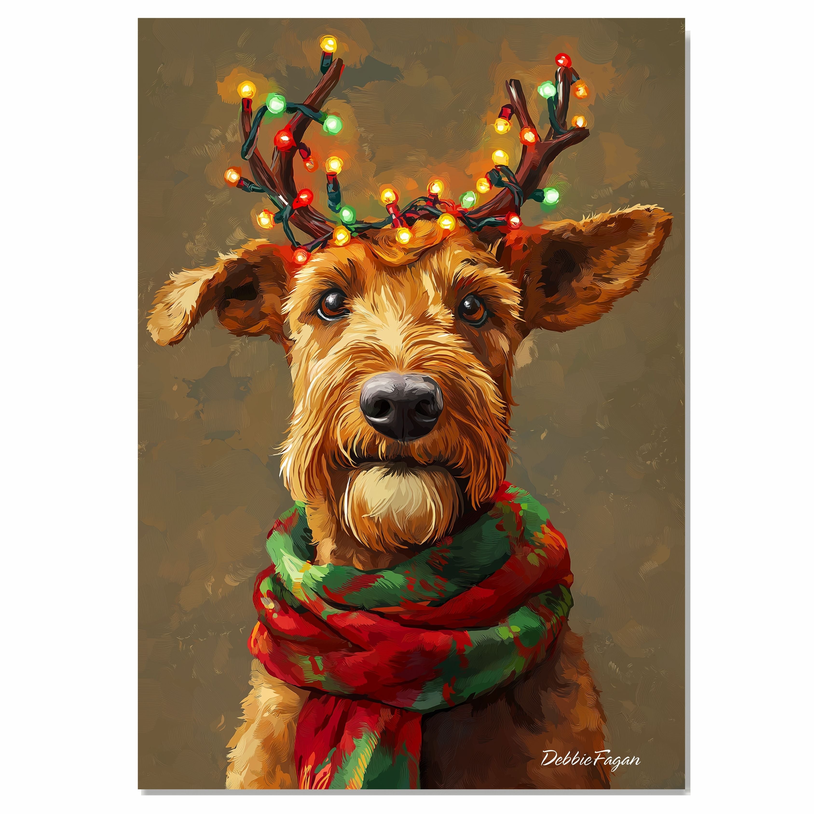 Airedale Christmas Glow - 'Yuletide Antlers' - Airedale Dog with Lighted Antlers and Festive Scarf on Rustic Canvas, Ready to Hang 1.5" Thick Canvas Wrap, Floating Framed Canvas, Flat Rolled Canvas