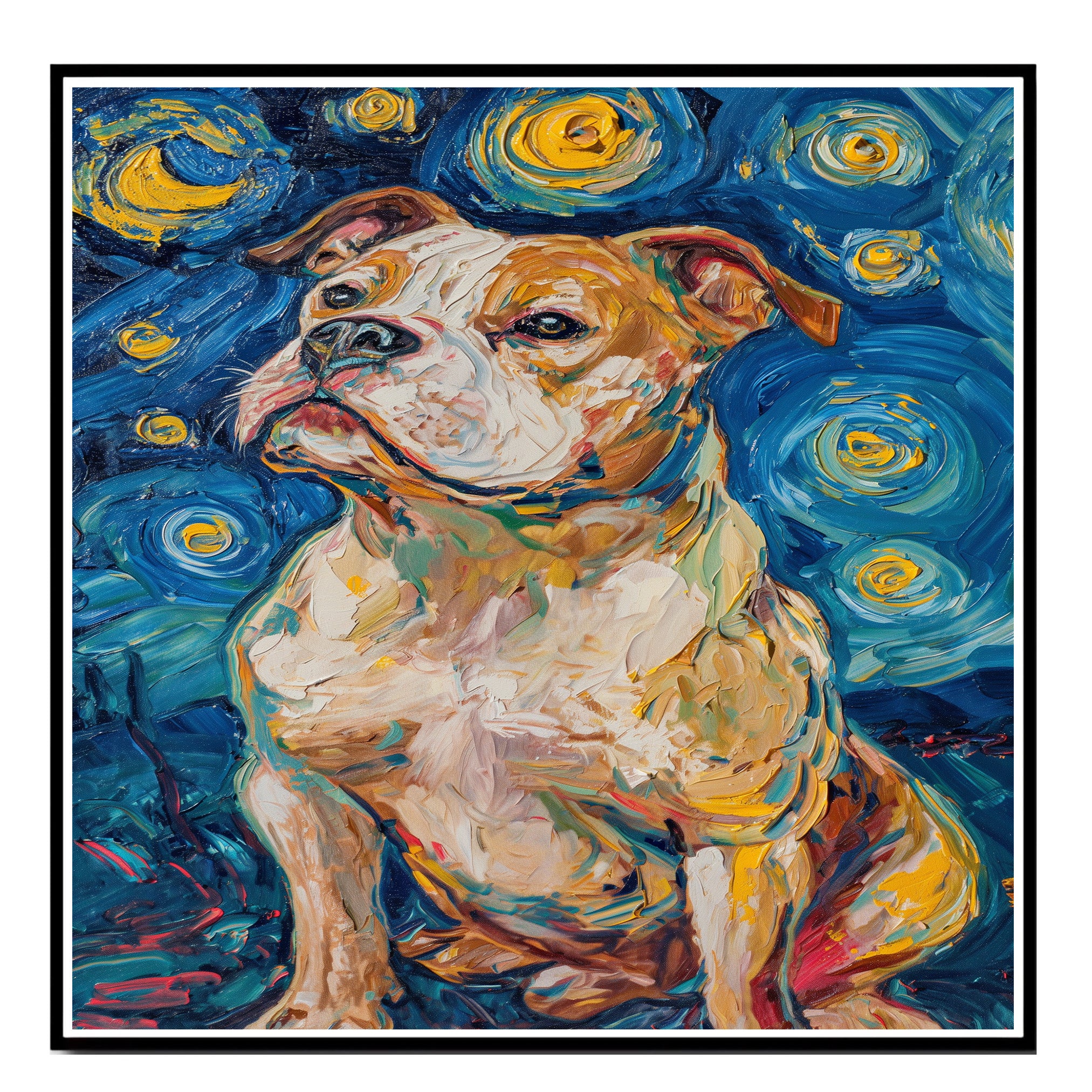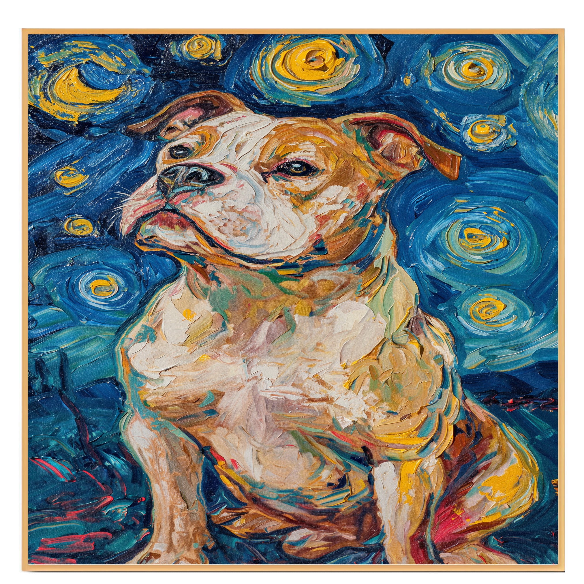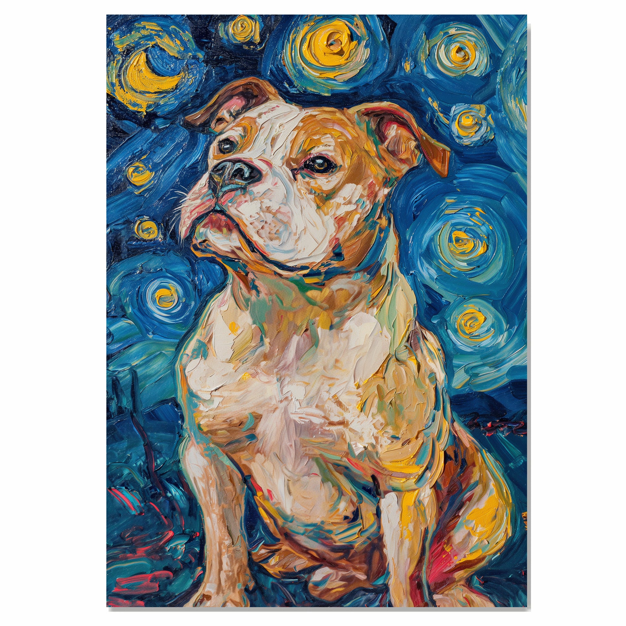 This unique American Bulldog artwork blends the charm of a loyal companion with Van Gogh’s iconic Starry Night style. Bold brushstrokes and vibrant swirling skies bring this expressive dog to life, creating a perfect statement piece for any room. Ideal for dog lovers, art collectors, and fans of impressionism, this piece adds whimsy and warmth to any wall.