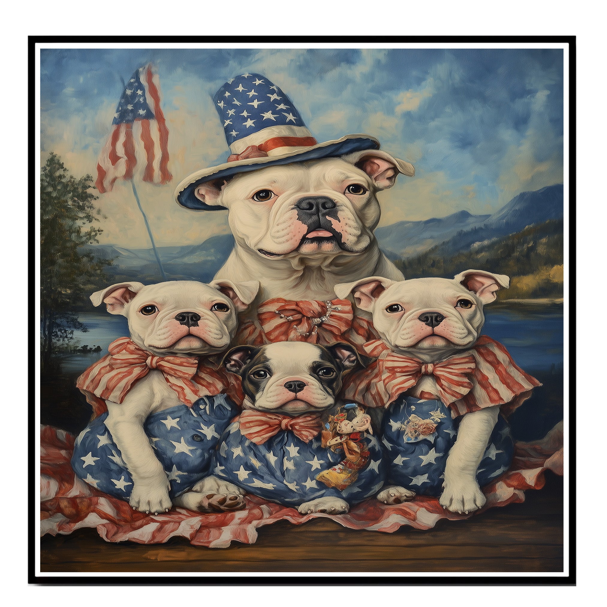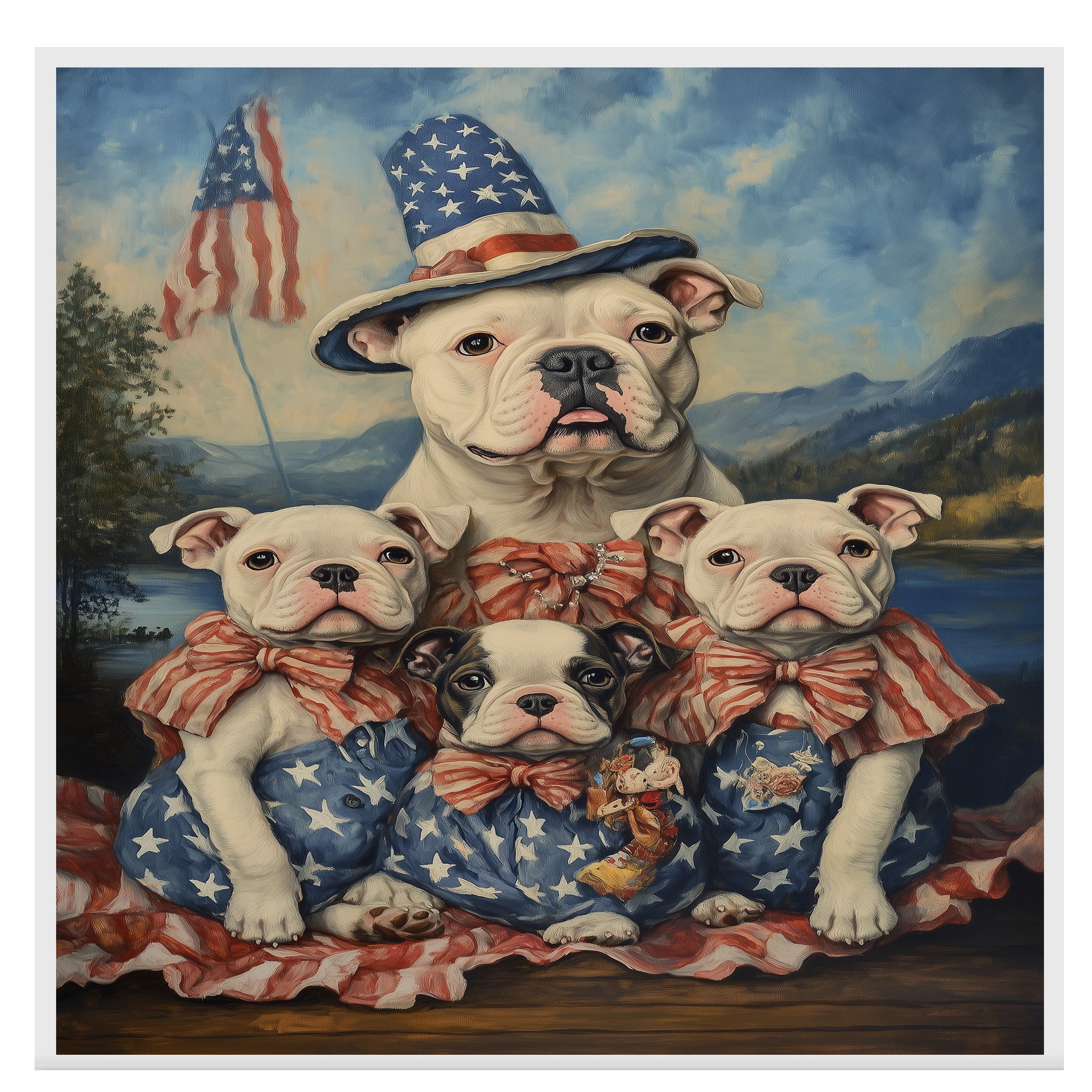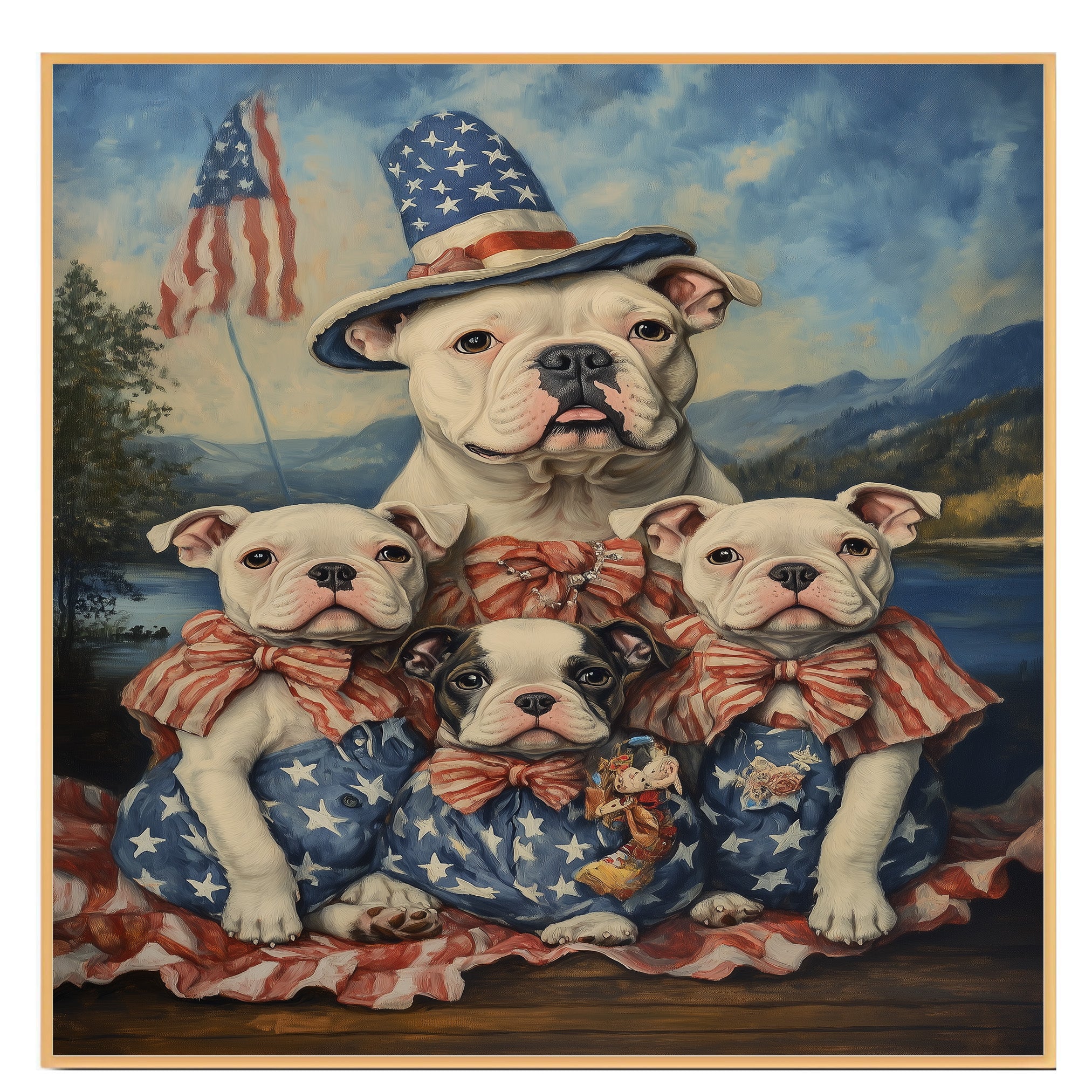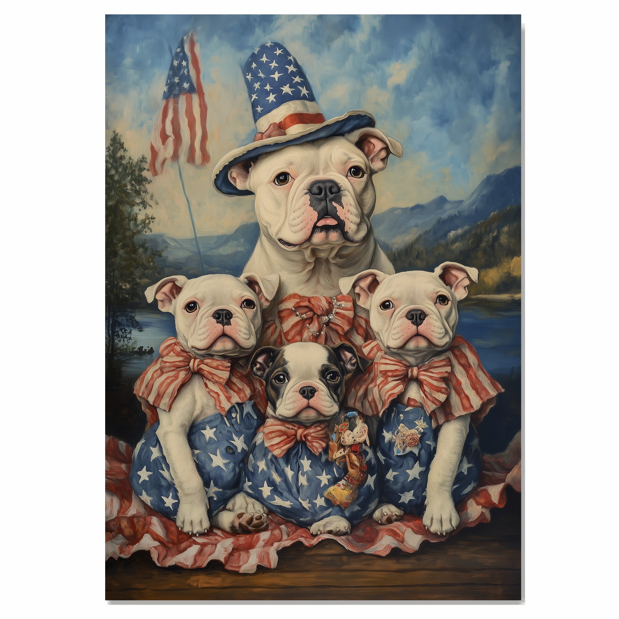Capture the essence of American pride and family love with this stunning oil painting of an American Bulldog mother and her four pups. Dressed in vintage-style red and white striped bows and star-spangled outfits, they sit proudly before a peaceful mountain lake with waving American flags in the distance. This nostalgic and heartwarming artwork is perfect for Fourth of July, Memorial Day, or any dog lover’s space celebrating tradition, loyalty, and freedom.