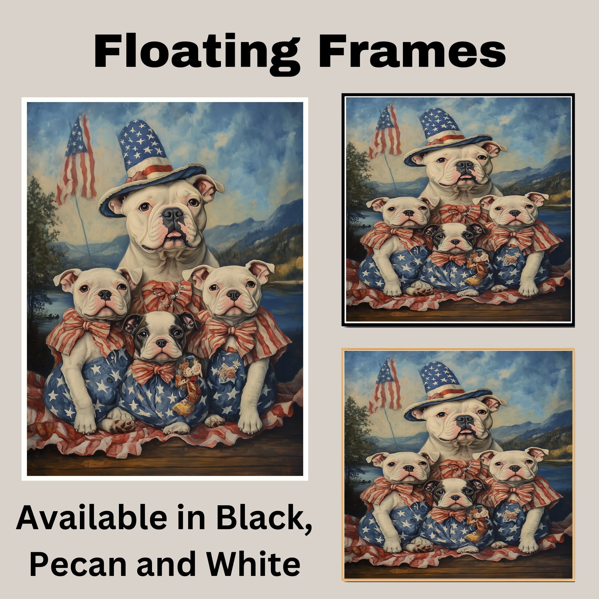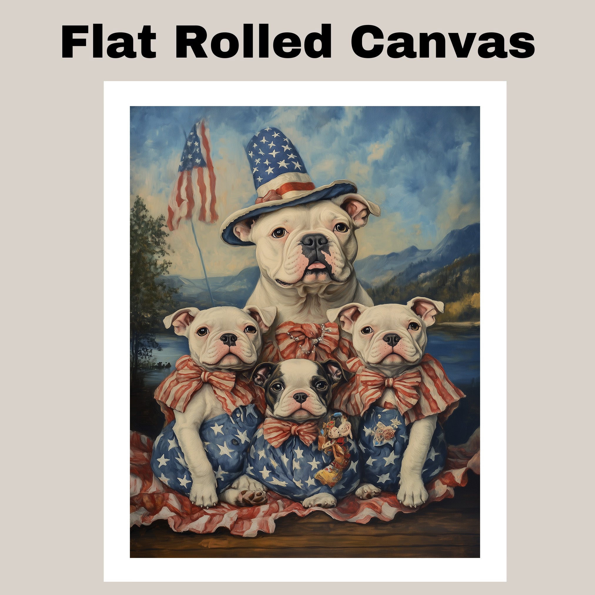 American Bulldog Mom and Puppies in Patriotic Outfits with Flags and Mountain Lake Background in Vintage Oil Painting Style on Ready to Hang 1.5" Thick Canvas Wrap, Floating Framed Canvas, Flat Rolled Canvas