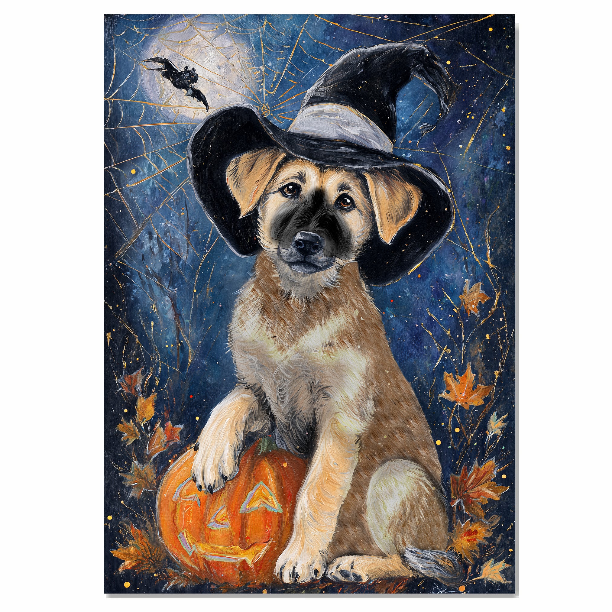 Bring festive Halloween charm into your home with this Anatolian Shepherd Puppy Halloween Canvas. Featuring a playful Anatolian Shepherd puppy wearing a witch hat and sitting beside a carved jack o lantern, this artwork is set under a full moon with bats, cobwebs, and autumn leaves. Perfect for Halloween enthusiasts, dog lovers, and seasonal home decorators, this canvas adds a magical and cozy spooky touch to your living room, entryway, or party space. It also makes a thoughtful Halloween gift for fans of Anatolian Shepherds and pet art collectors.