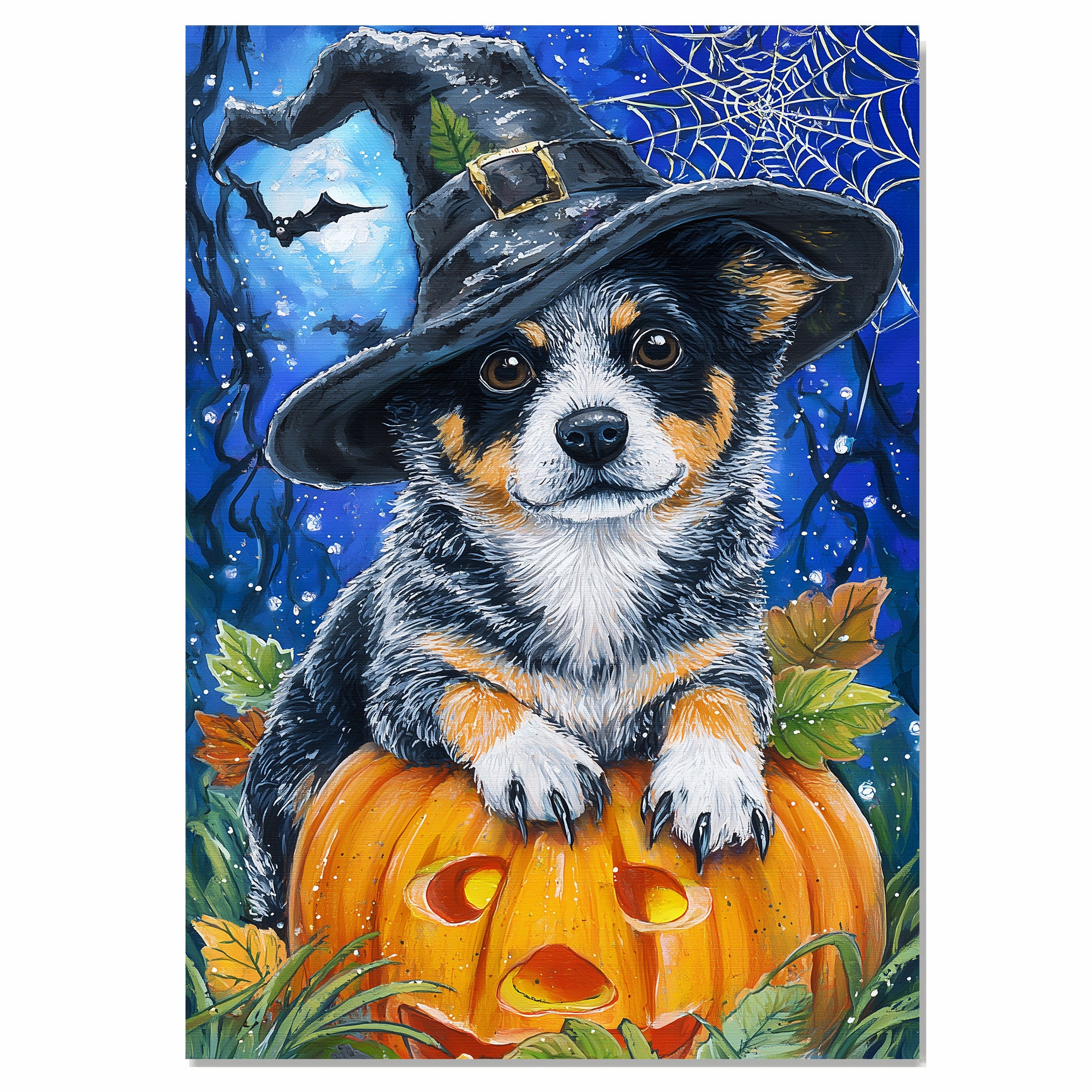 Celebrate Halloween with this Australian Cattle Dog Puppy Halloween Canvas. Featuring a Blue Heeler style puppy in a witch hat sitting on a carved jack o lantern under a moonlit sky with bats and cobwebs, this artwork blends cute charm with spooky fun. Perfect for dog lovers, Halloween fans, and seasonal home decorators, it makes a playful accent for your living room, entryway, or Halloween party display. A thoughtful gift for Australian Cattle Dog owners and pet lovers who enjoy whimsical holiday art.