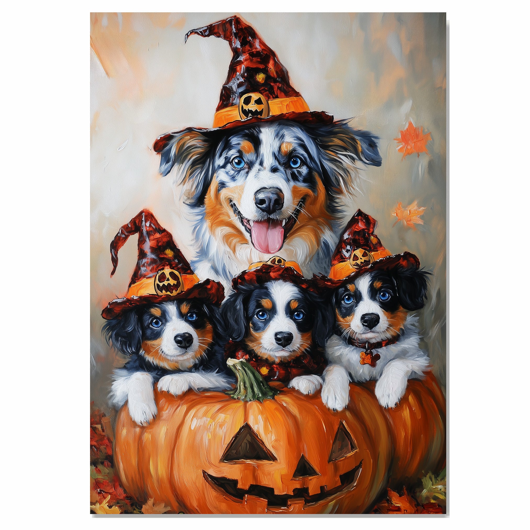 Australian Shepherd Dog Halloween Canvas Wall Art with Pumpkins and Witch Hats Rustic Fall Accent for Cozy Autumn Homes on Ready to Hang 1.5" Thick Canvas Wrap, Floating Framed Canvas, Flat Rolled Canvas