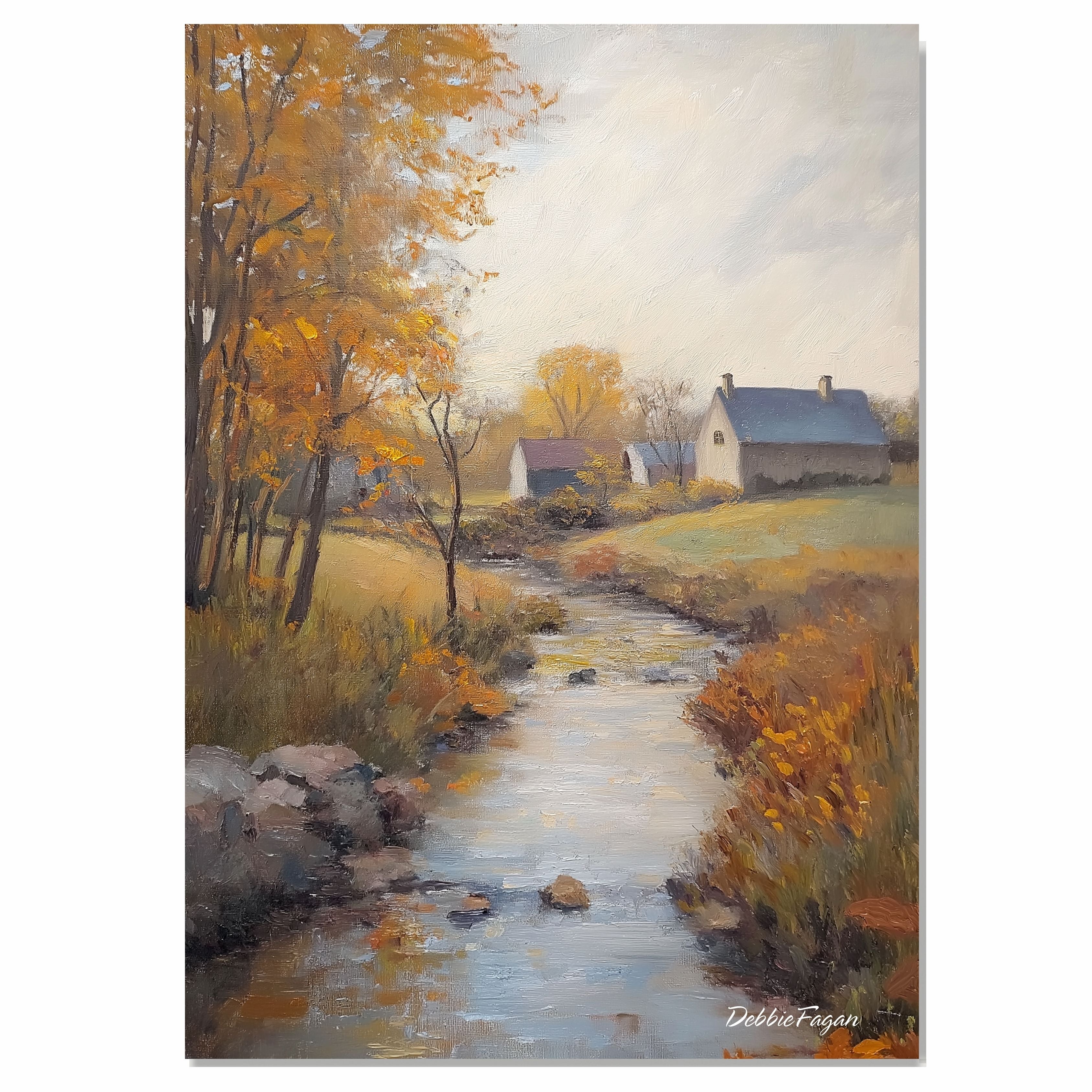 A peaceful autumn scene featuring a winding country road, flowing stream, and cozy cottages surrounded by fall foliage. This oil painting-style print brings warmth and rustic charm to any home.