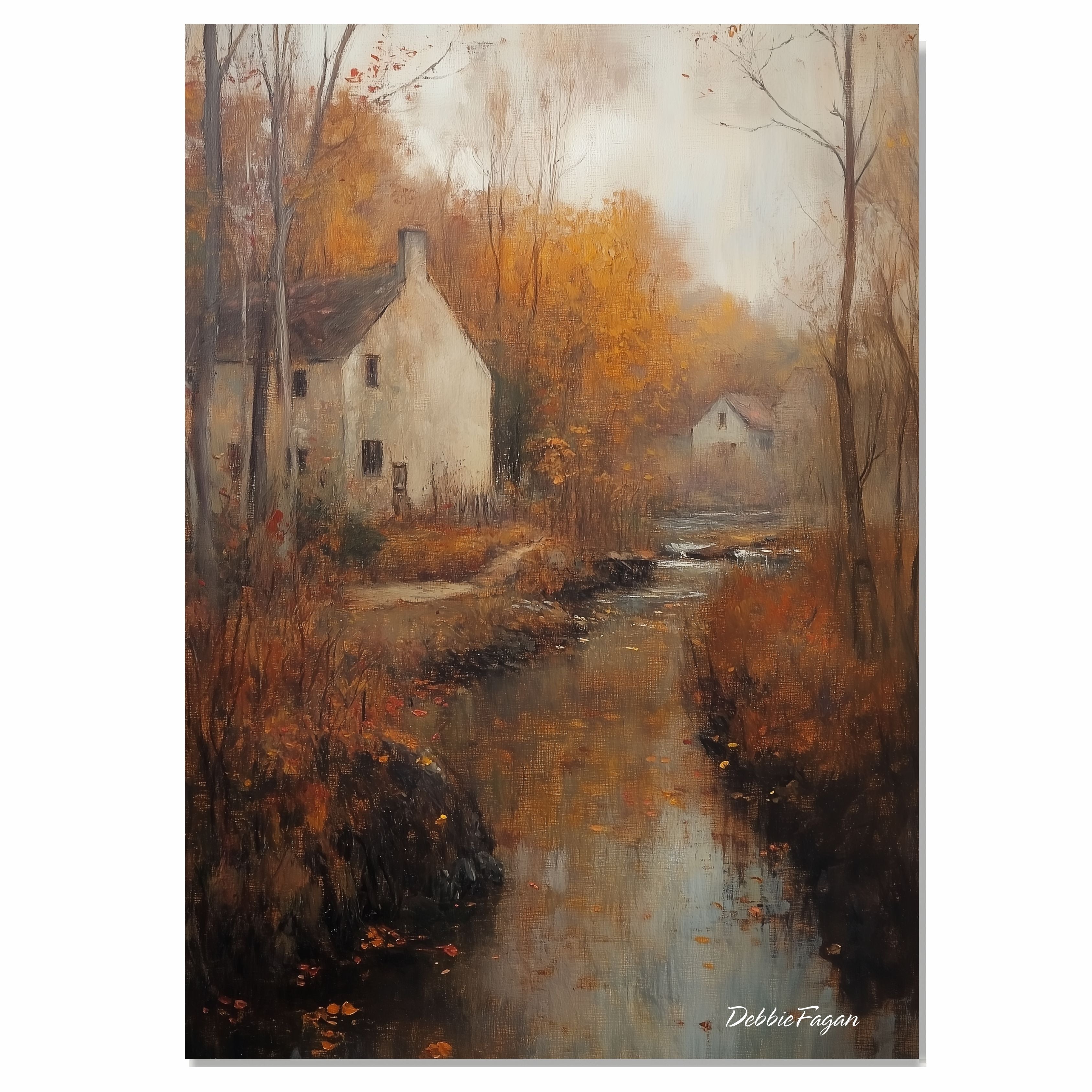 A peaceful autumn scene featuring a winding country road, flowing stream, and cozy cottages surrounded by fall foliage. This oil painting-style print brings warmth and rustic charm to any home.