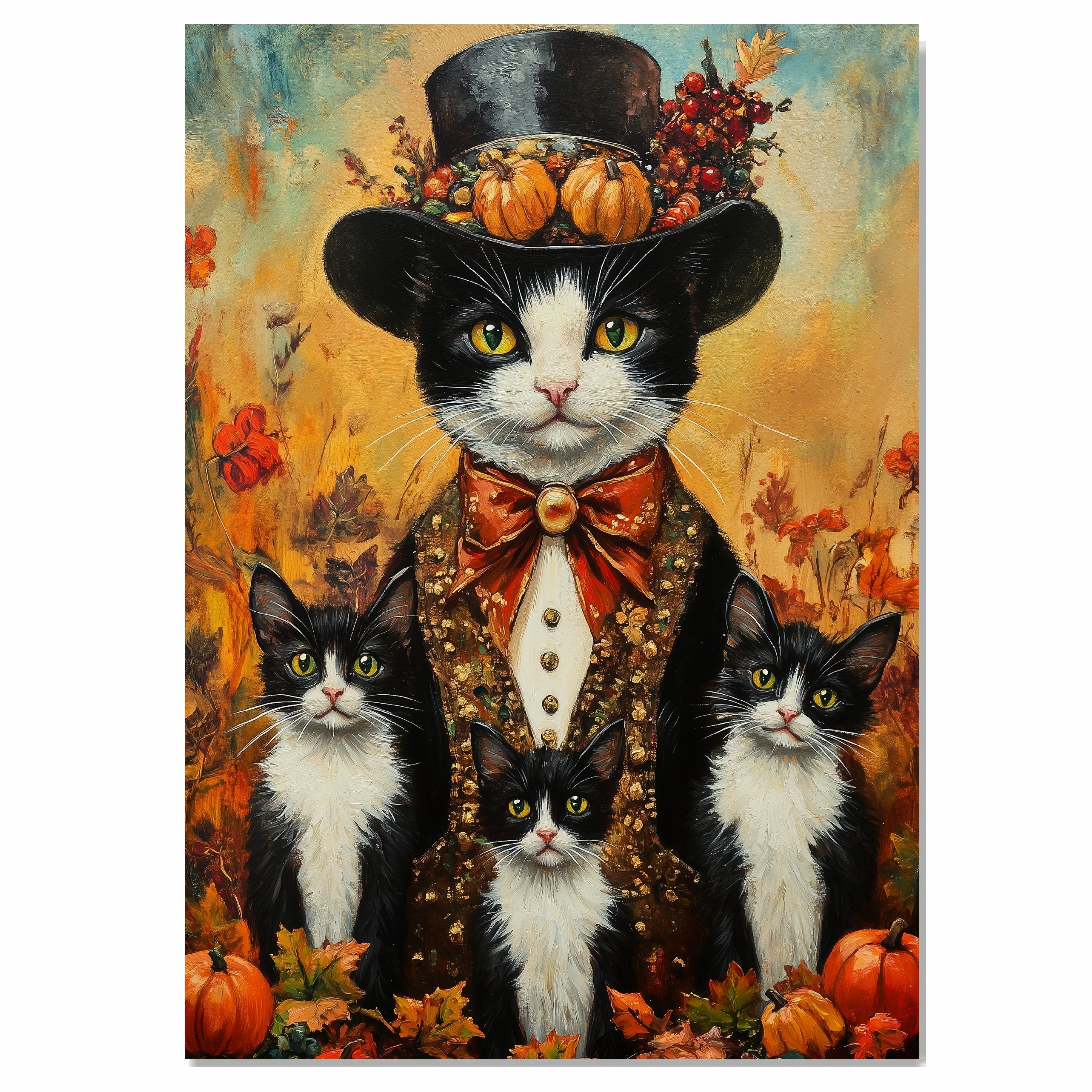 Our "Autumn Whispers" Canvas captures a cozy, heartwarming scene of a tuxedo cat mom and her three playful kittens nestled beside a rustic pumpkin. Set against a backdrop of crisp autumn leaves and golden hues, this enchanting artwork evokes the warmth and magic of fall. The soft textures and rich seasonal tones make it a perfect addition to your autumn decor. Available on a 1.5" thick canvas wrap, floating framed canvas, or flat rolled canvas, this charming piece is an ideal gift for cat lovers and those who cherish the beauty of the harvest season.