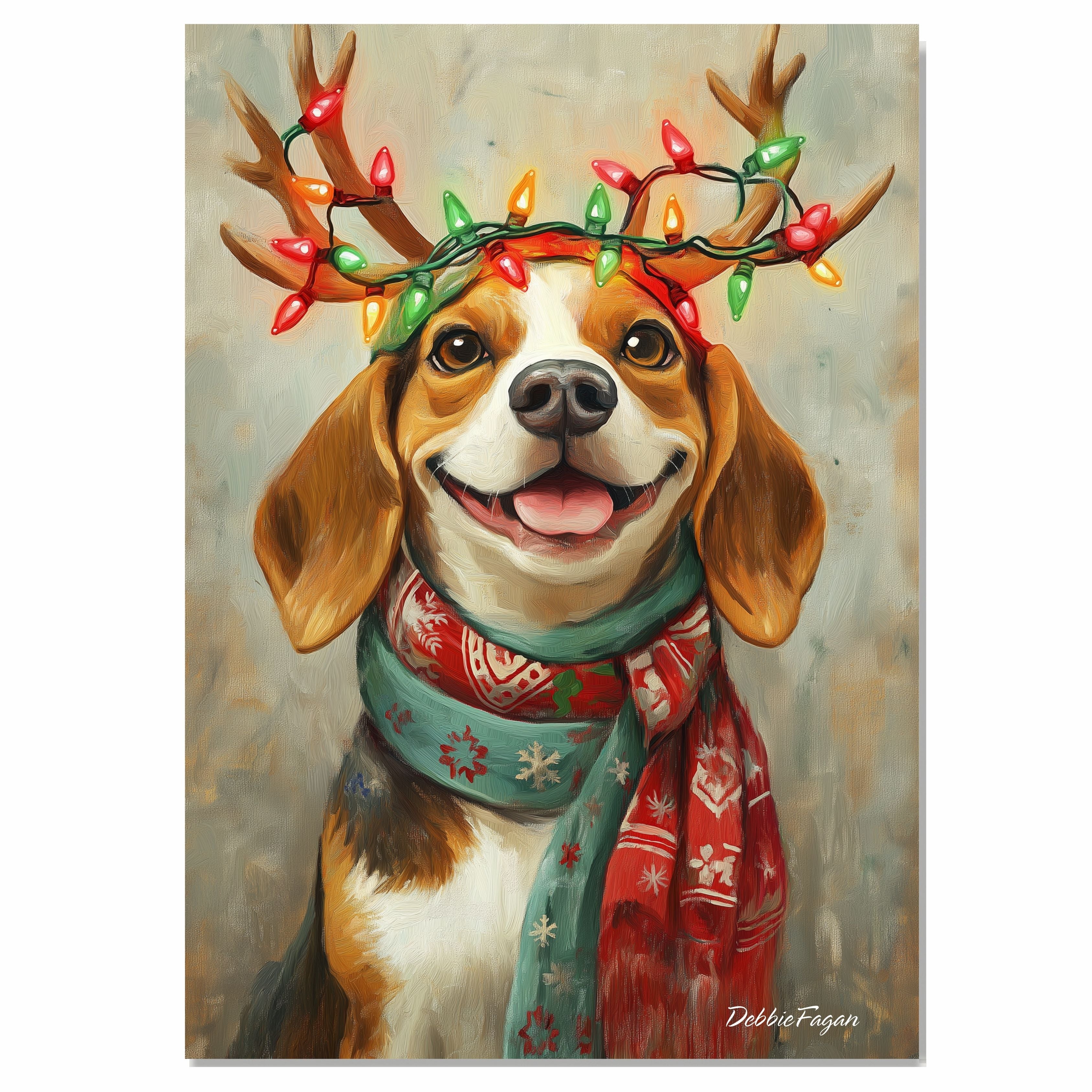 Our Beagle Christmas Charm Canvas adds a touch of rustic warmth and festive cheer to your home, featuring an adorable Beagle dog with lighted antlers and a cozy festive scarf. Set against a charming rustic backdrop, this heartwarming artwork titled Rustic Snuggles perfectly captures the joyful spirit of the holiday season. Available on a 1.5" thick canvas wrap, floating framed canvas, or as a flat rolled canvas, this delightful piece brings together a whimsical yet timeless aesthetic. Whether hung in the living room or nestled in a holiday nook, it serves as a fun and eye-catching focal point that adds cheer to your seasonal decor.