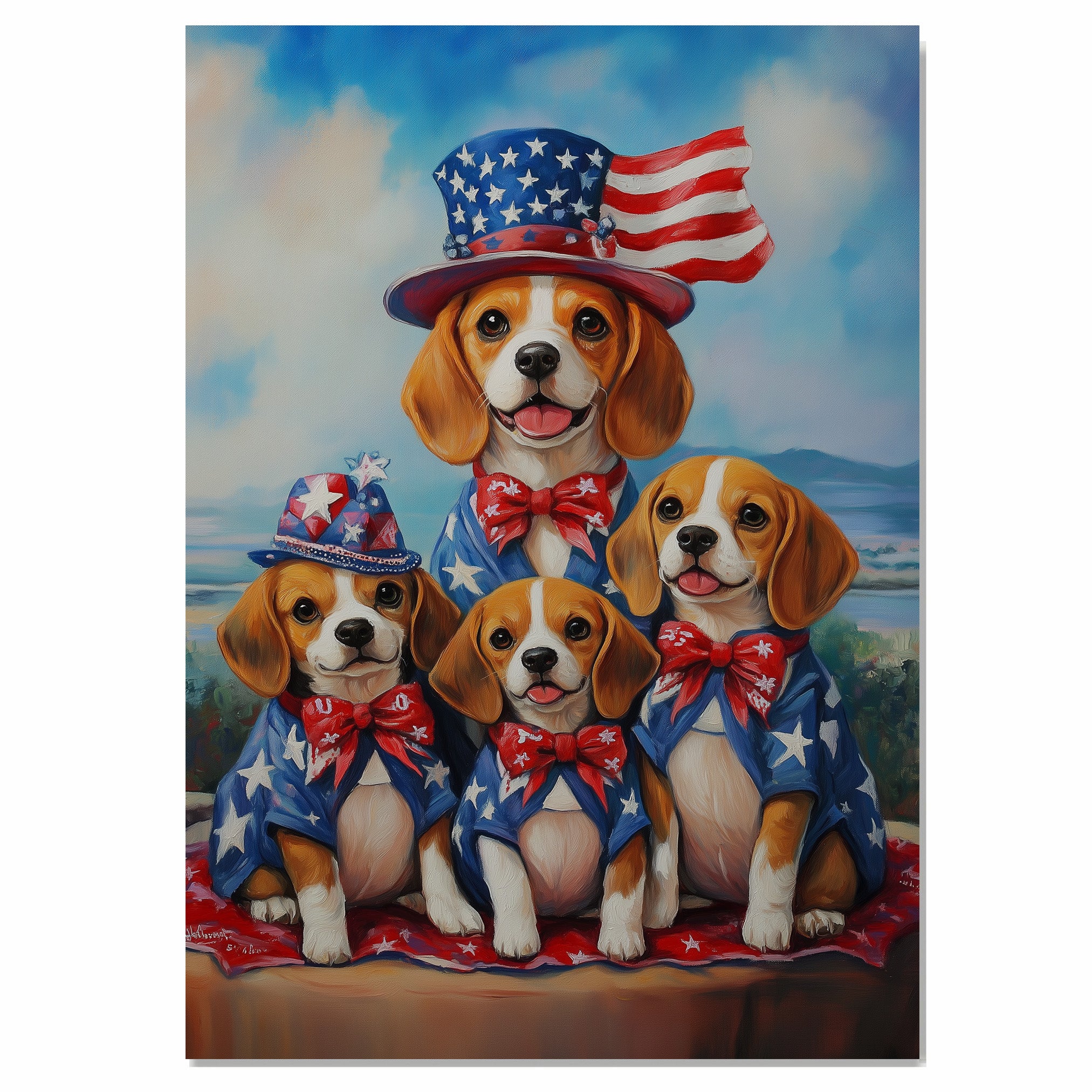 Capture the heart of American charm with this oil painting of a proud Beagle mother and her three puppies, dressed in red, white, and blue outfits complete with hats and bowties. Standing before a rustic American flag background, this endearing dog family brings warmth, pride, and a touch of nostalgia to any room. A perfect gift or decoration for Independence Day, dog lovers, or vintage Americana collectors.