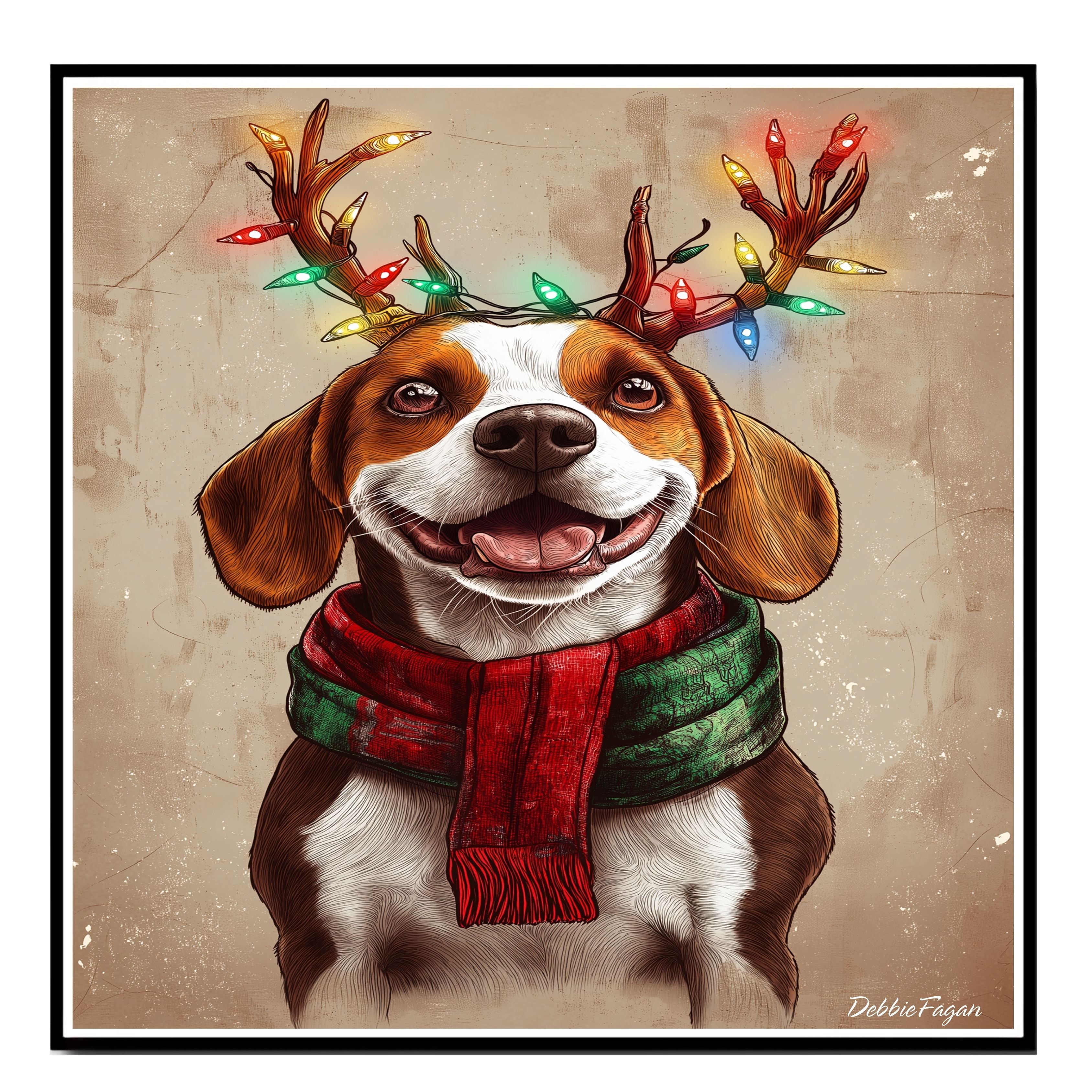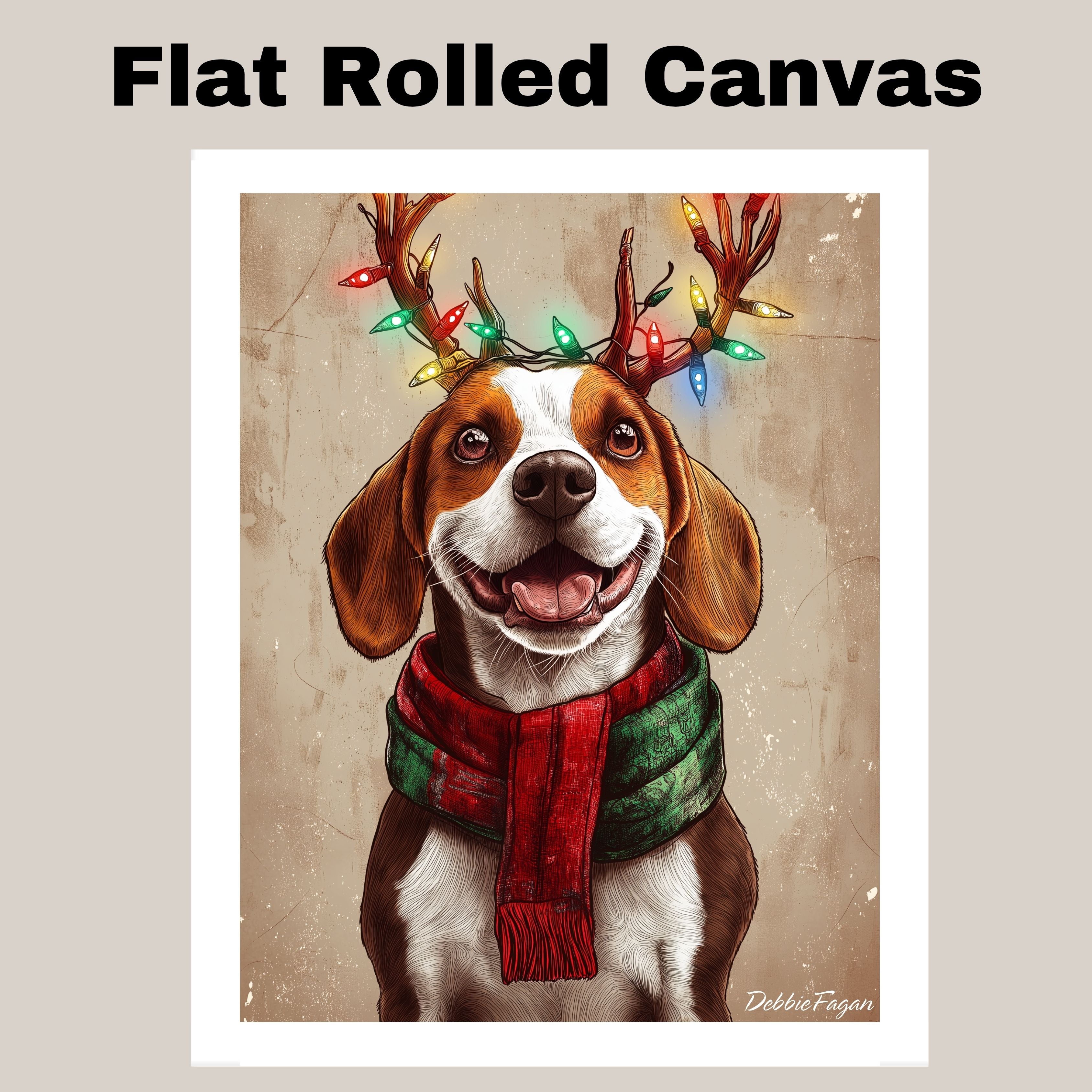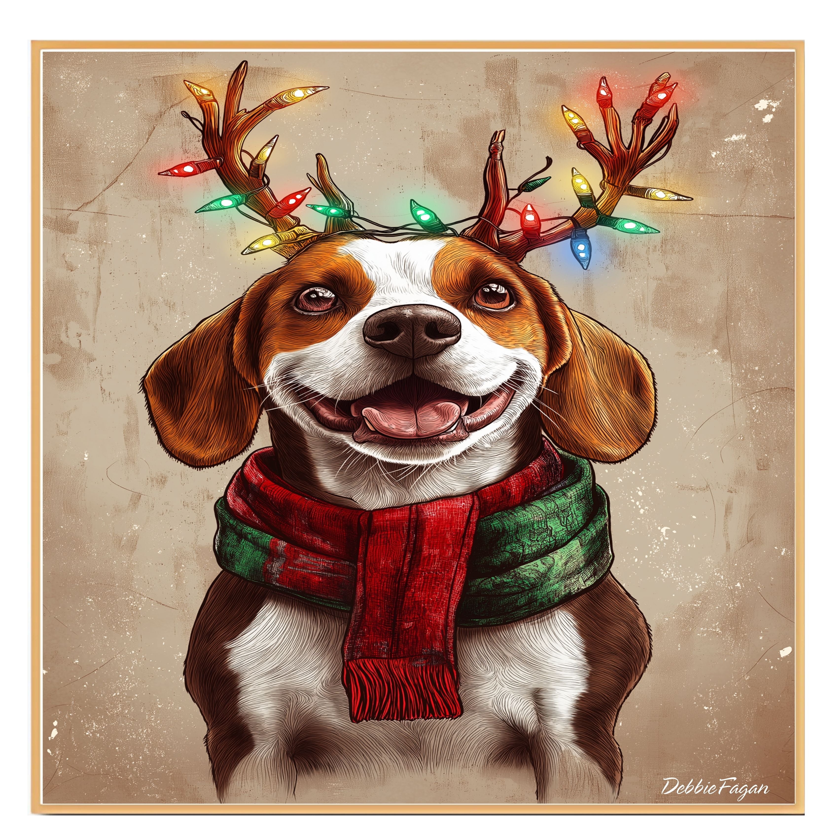 Our Beagle Holiday Joy Canvas adds a touch of festive warmth and rustic charm to your space, featuring an adorable Beagle dog adorned with lighted antlers and a cozy scarf, set against a charming rustic backdrop. Available on a 1.5" thick canvas wrap, floating framed canvas, or as a flat rolled canvas, this heartwarming artwork titled Beagle Holiday Joy perfectly captures the spirit of the holiday season. With its delightful combination of cozy charm and seasonal cheer, this enchanting piece makes a cheerful addition to your holiday decor and serves as a fun, eye-catching focal point in any room.