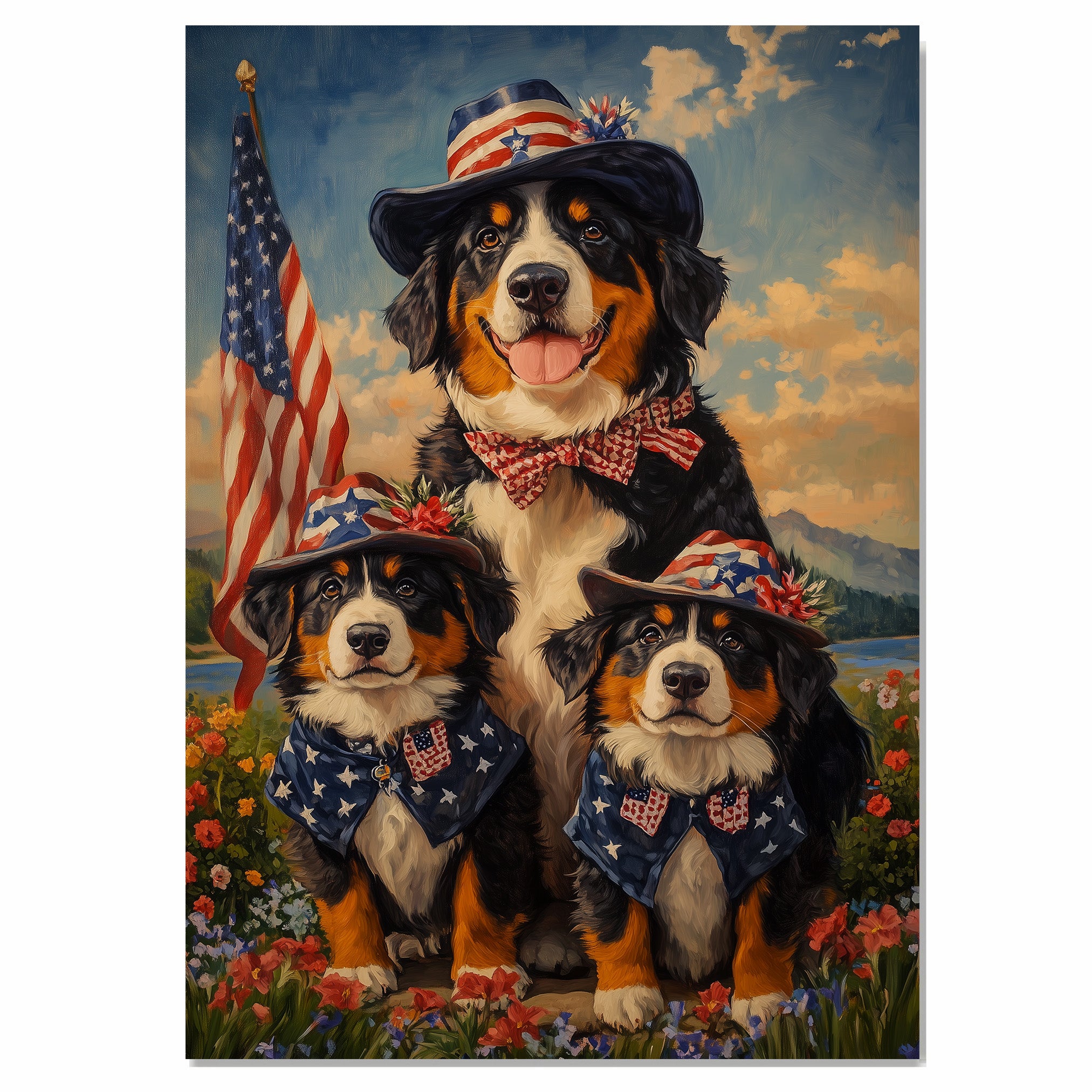 This delightful oil painting features a joyful Bernese Mountain Dog mother with her three adorable puppies, all dressed in festive red, white, and blue attire. Their star-spangled hats and bow ties radiate a patriotic spirit, set against a beautiful natural background filled with wildflowers. Ideal for dog lovers and collectors, this heartwarming piece captures the charm and loyalty of this beloved breed with a playful Americana twist.