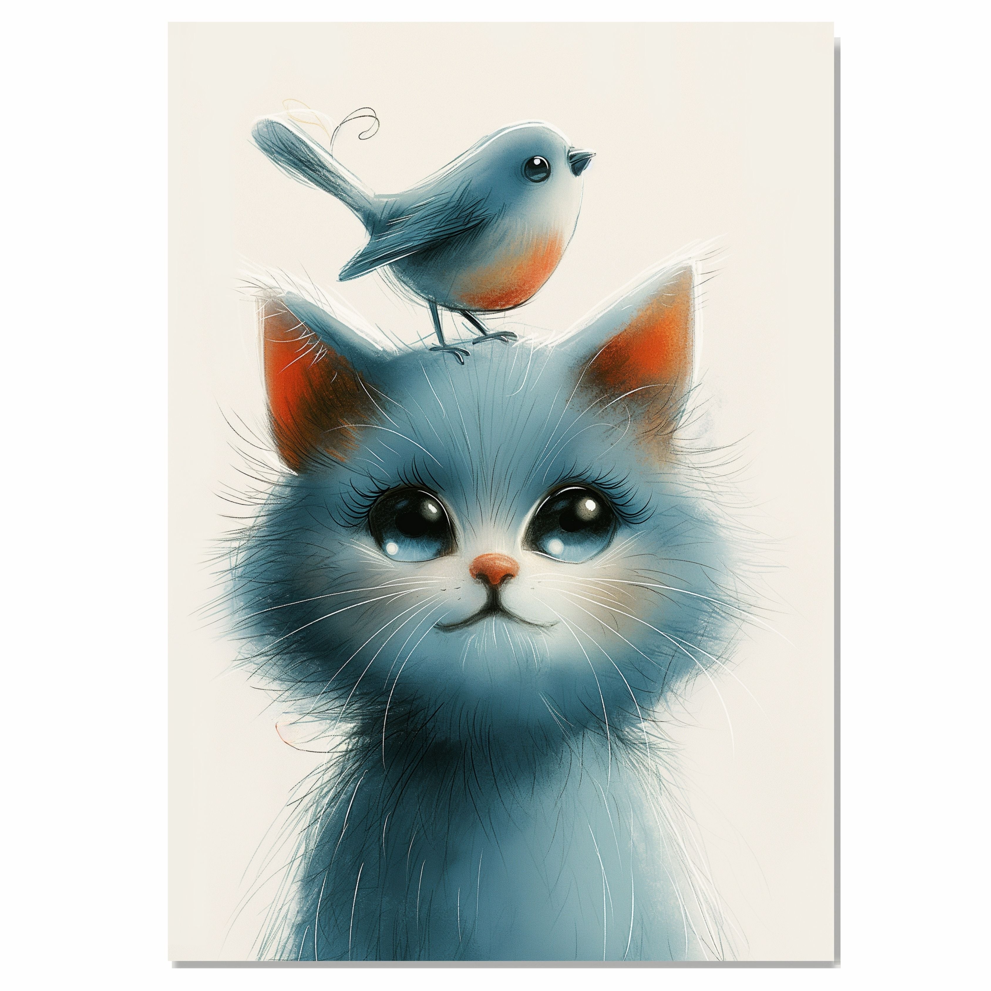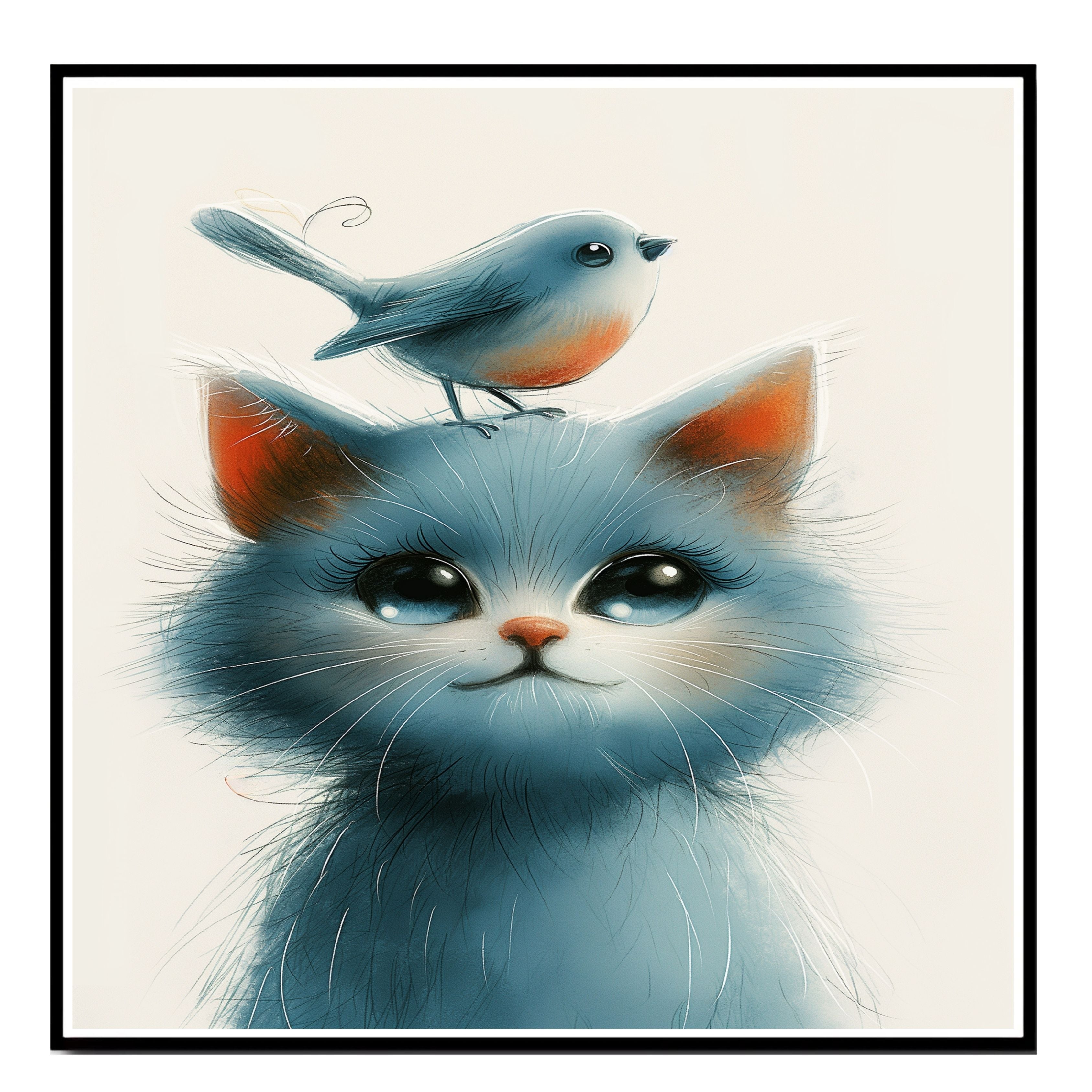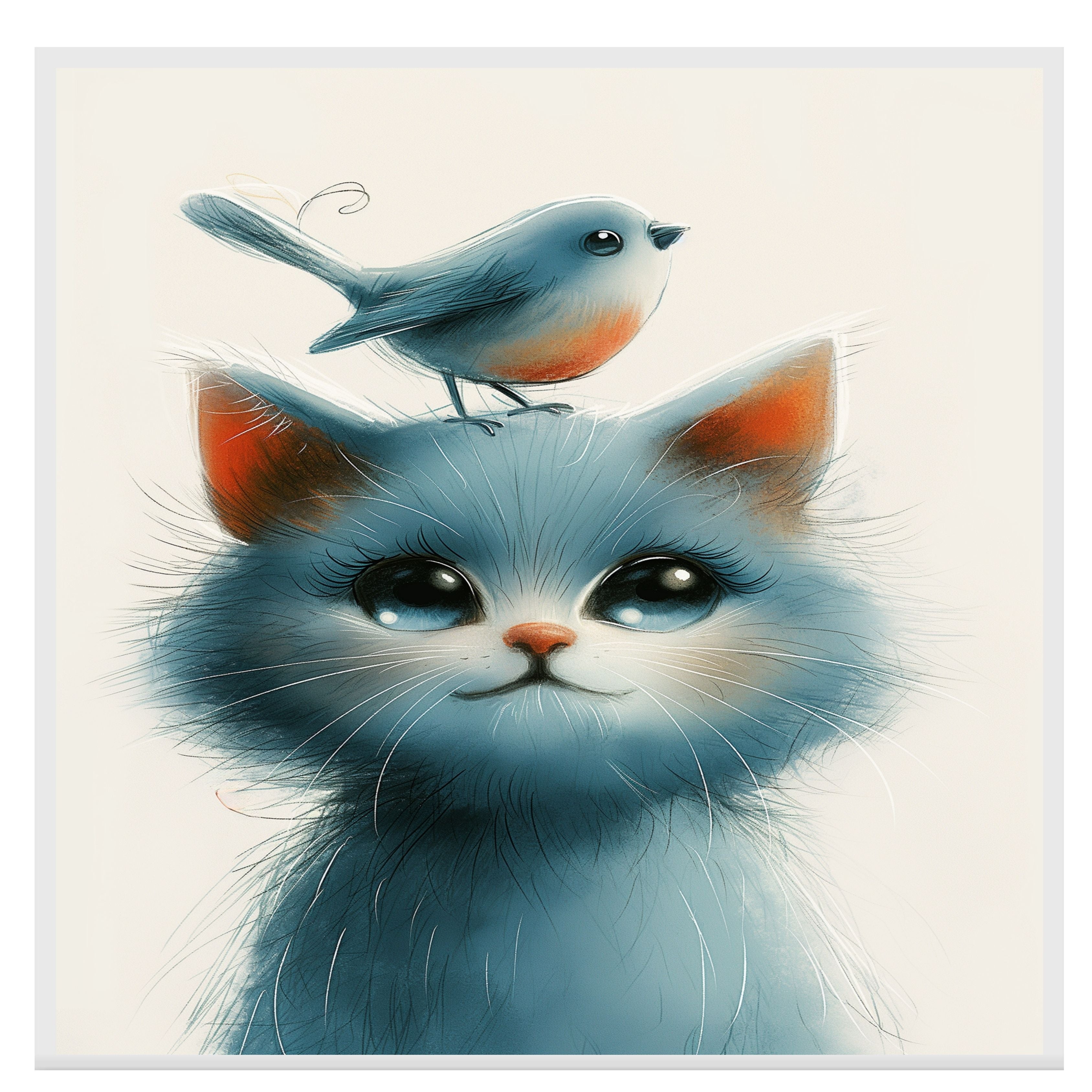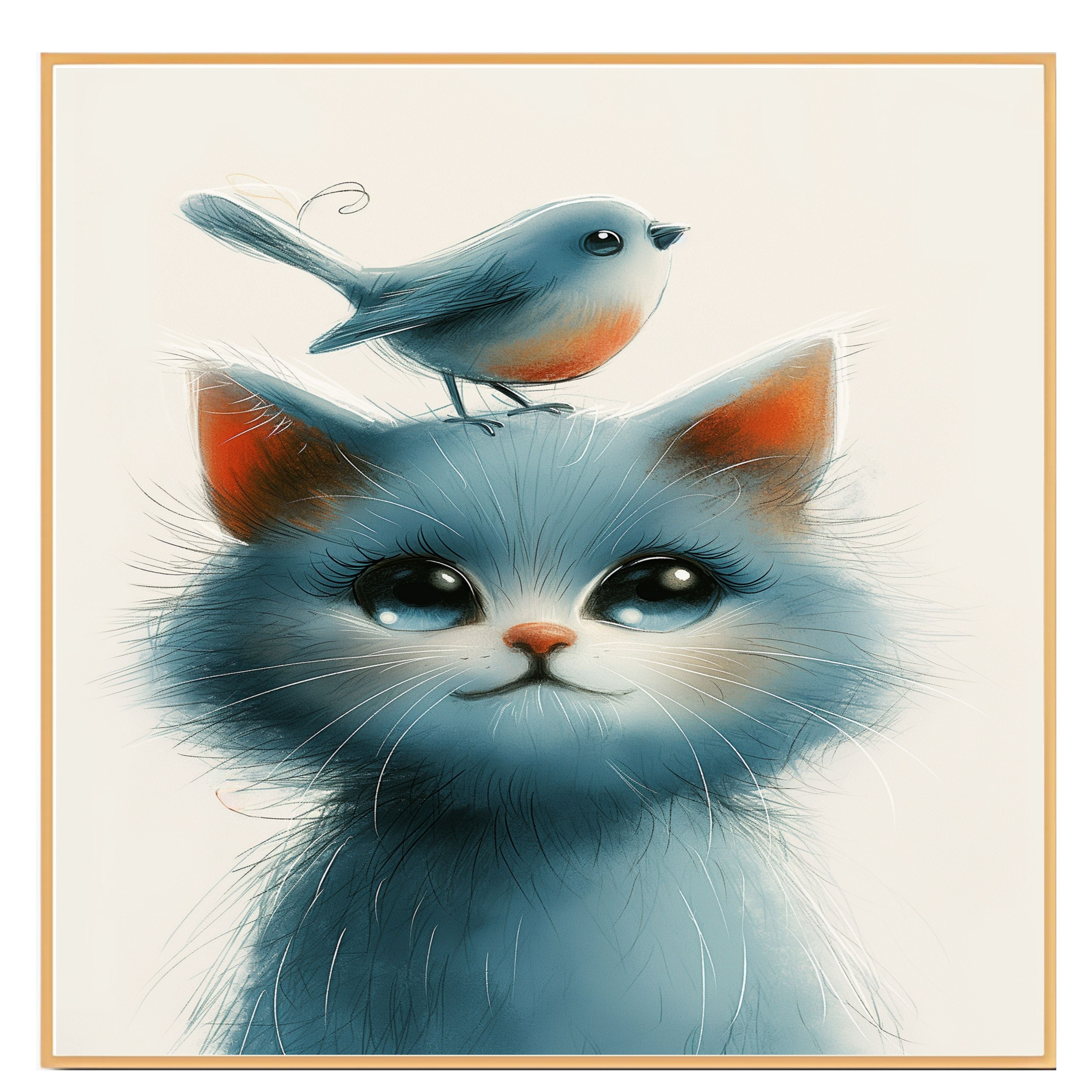 This touching artwork features a wide-eyed blue kitten with a soft, fluffy coat and a tiny orange-breasted bird perched gently on its head. The gentle palette and endearing expressions evoke warmth and innocence, making it an ideal choice for nurseries, children’s rooms, or animal-themed spaces. A perfect piece for cat lovers, bird enthusiasts, and fans of soft, heartfelt art.