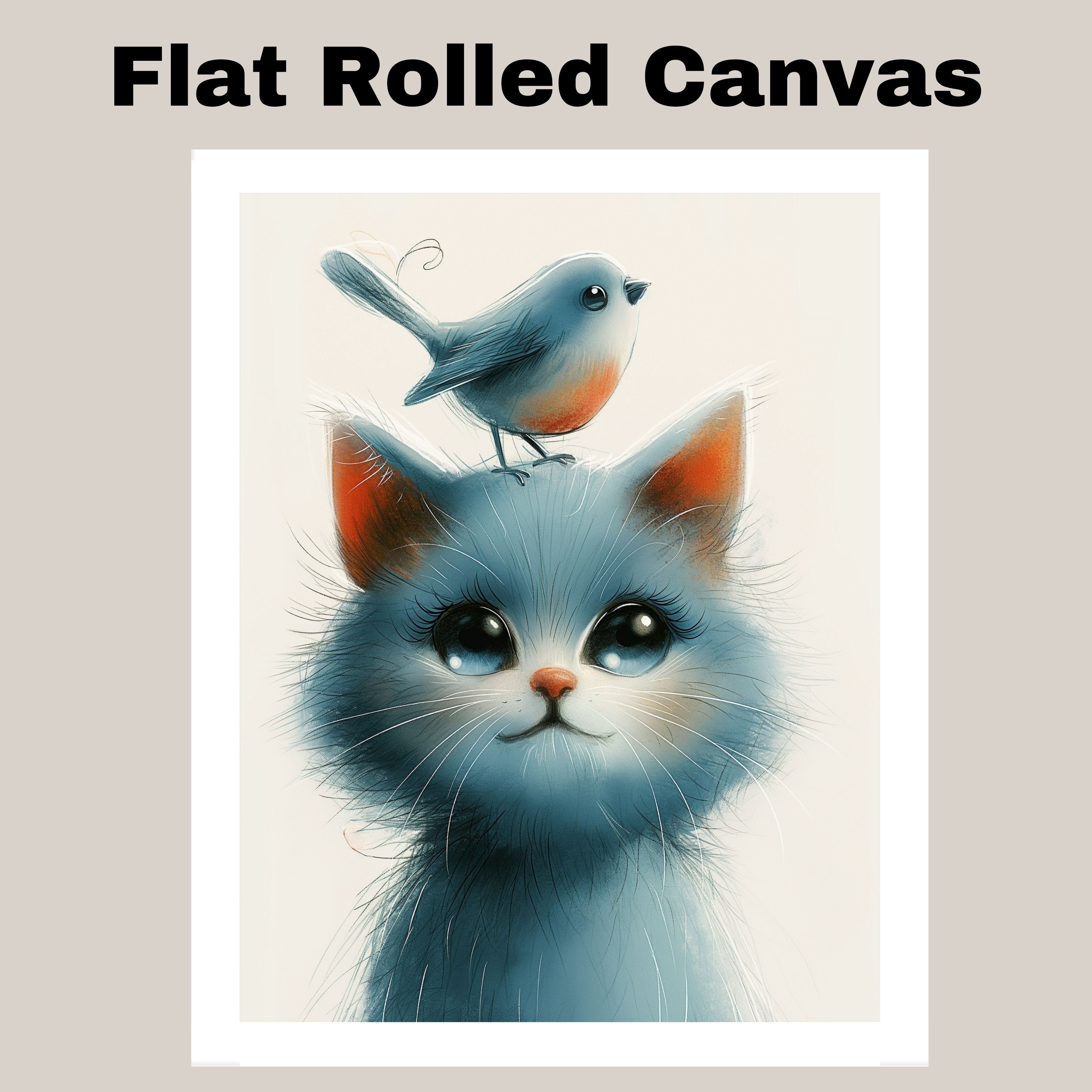 Big-Eyed Blue Kitten with Bird on Head Sweet and Whimsical Animal Illustration for Nursery or Kids Room Art Print Perfect for Cat and Bird Lovers on Ready to Hang 1.5" Thick Canvas Wrap, Floating Framed Canvas, Flat Rolled Canvas