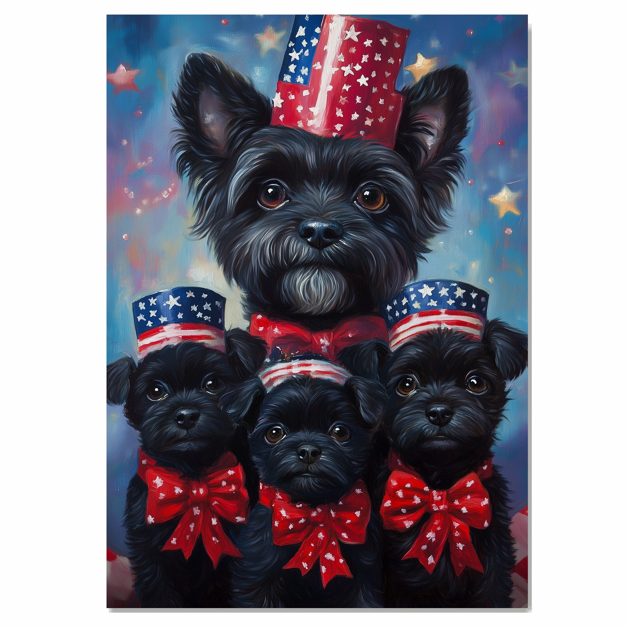 Celebrate patriotism with this adorable oil painting featuring a proud black Affenpinscher mother and her three charming puppies. All are dressed in matching red, white, and blue top hats and festive bows, set against a magical starry night sky. Their bright eyes and loving expressions capture the heart, making this a delightful piece for dog lovers, holiday enthusiasts, or anyone who appreciates playful Americana art.