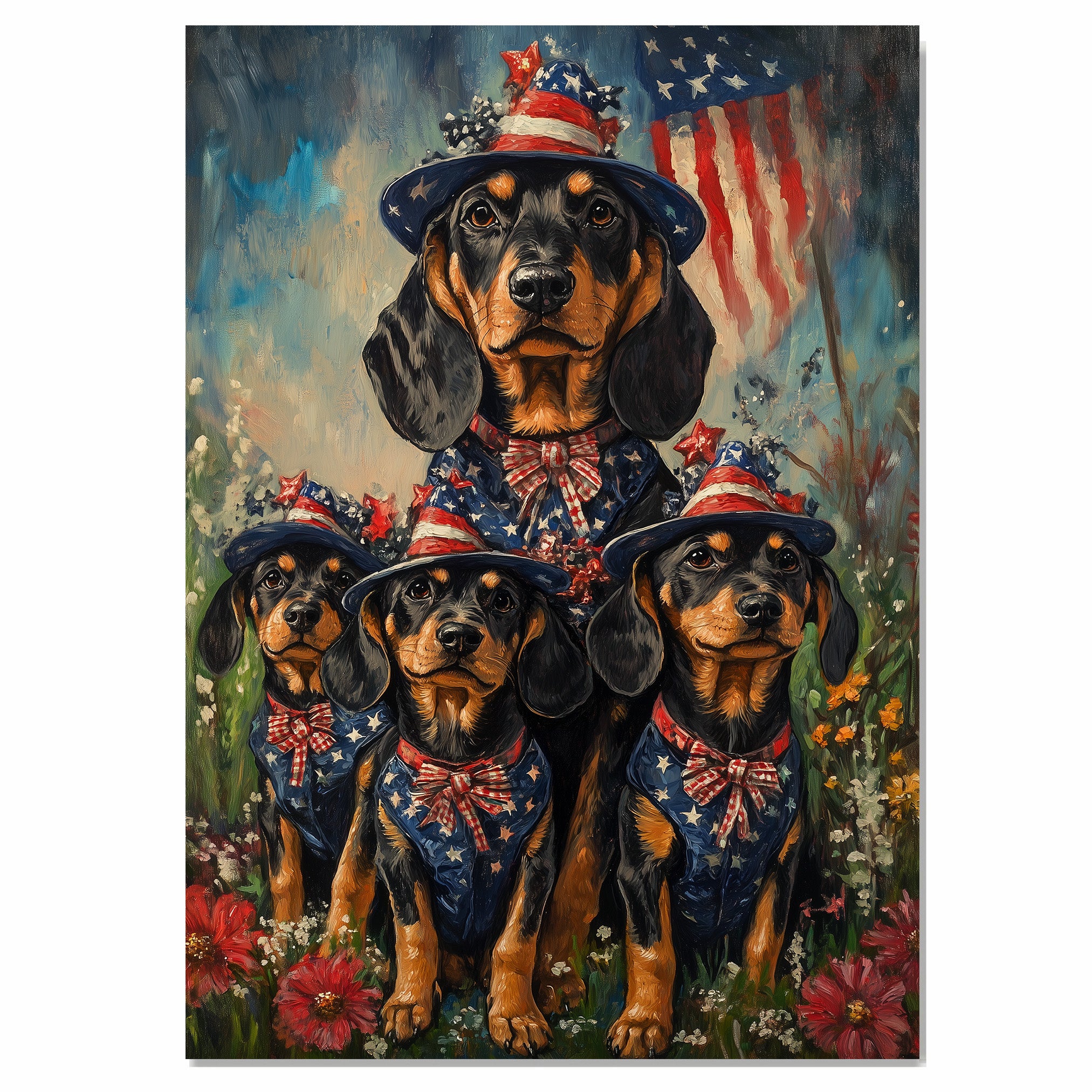 Celebrate Americana charm with this delightful oil painting of a black and tan Coonhound mother and her three pups, all dressed in patriotic red, white, and blue attire. Each wears a star-spangled hat and bow tie, posed proudly in a wildflower meadow with the American flag in the background. This heartwarming portrait is a perfect tribute to dog lovers and festive décor enthusiasts.