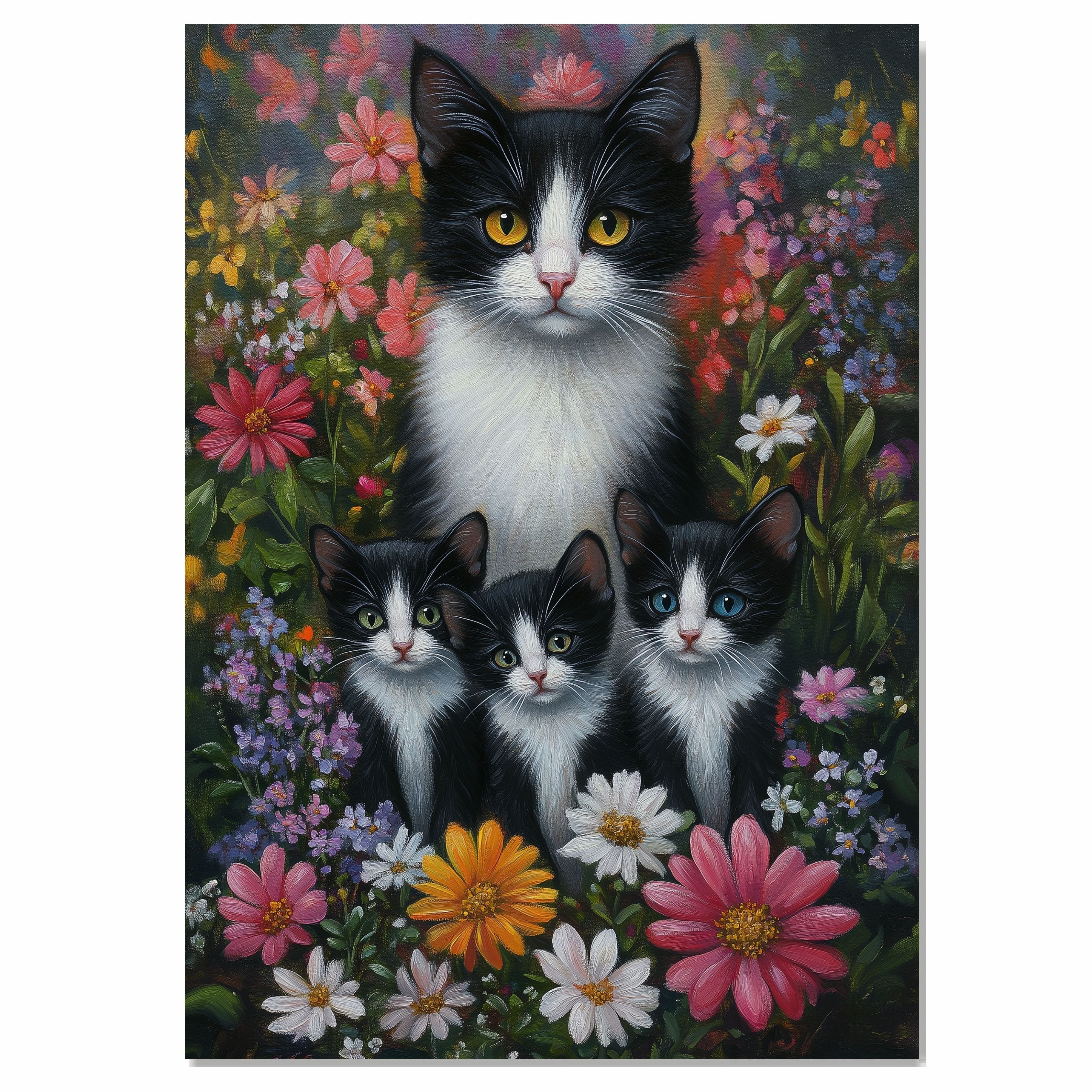 "Blooming Whiskers" showcases a tuxedo cat mom and her three playful kittens surrounded by a lush, vibrant spring meadow. With colorful blossoms in full bloom and warm sunlight casting a golden glow, this charming scene captures the essence of springtime joy and family warmth. Available on 1.5" thick canvas wrap, floating framed canvas, or flat rolled canvas.