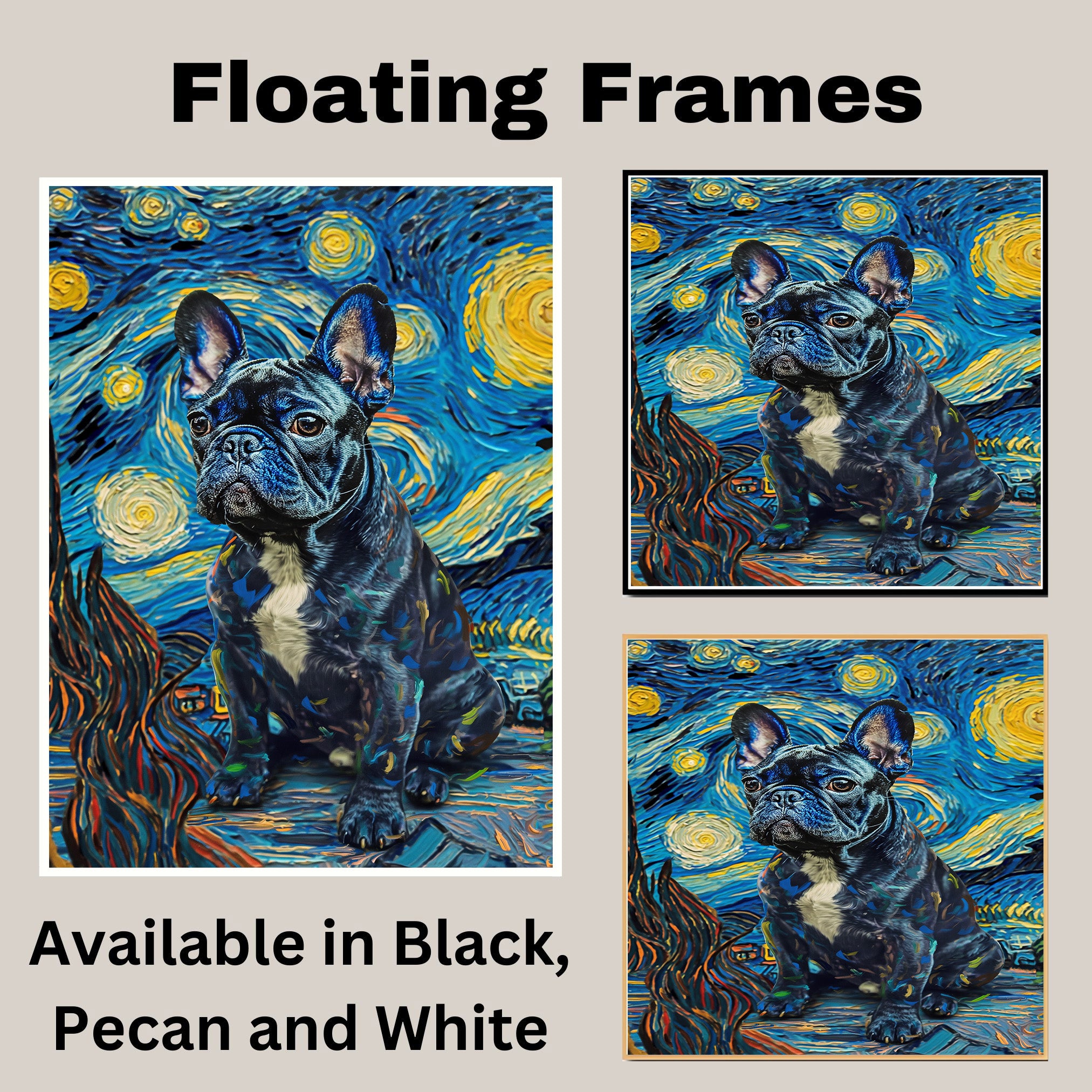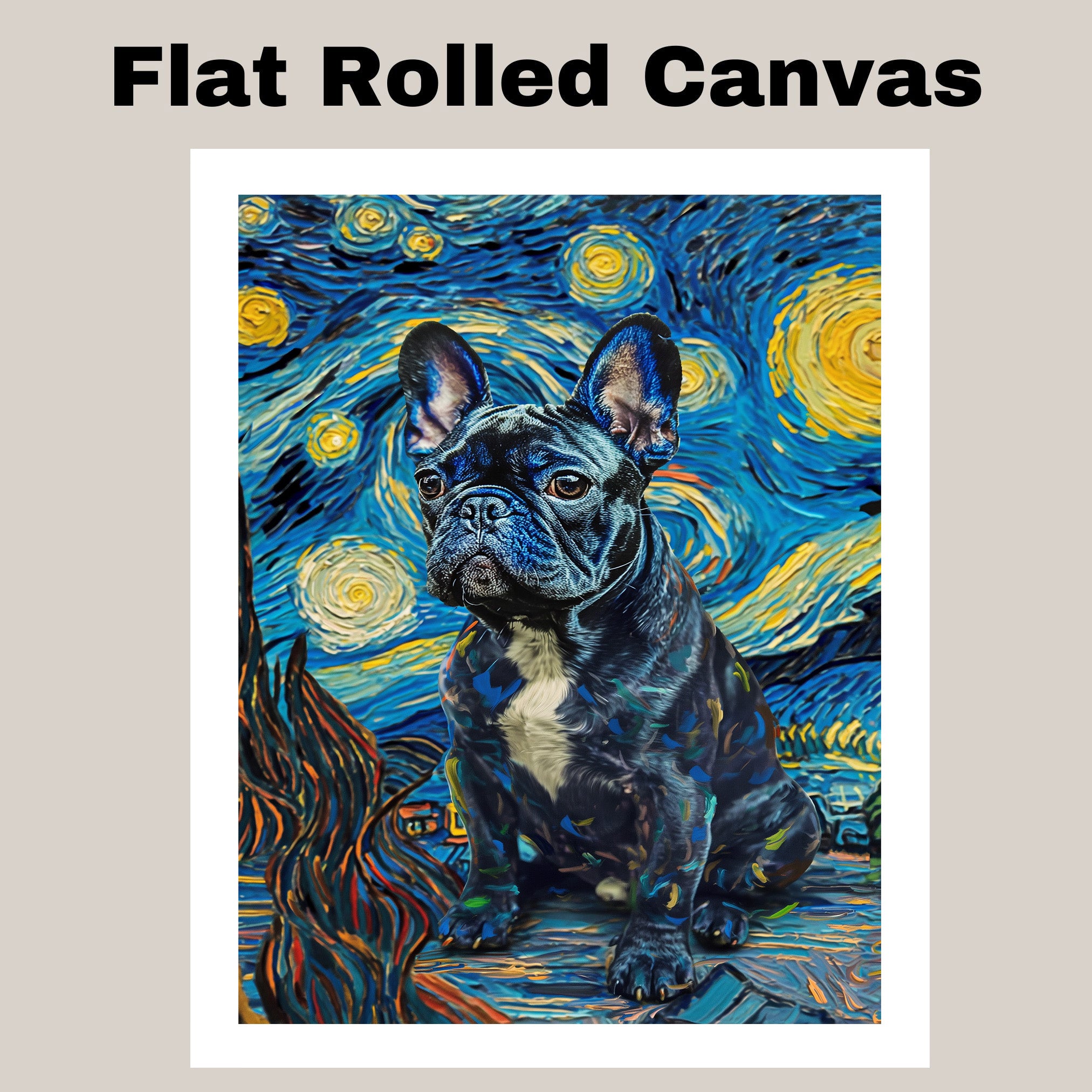Blue French Bulldog Portrait in Starry Night Style with Swirling Sky and Textured Brush Strokes Inspired by Van Gogh on Ready to Hang 1.5" Thick Canvas Wrap, Floating Framed Canvas, Flat Rolled Canvas