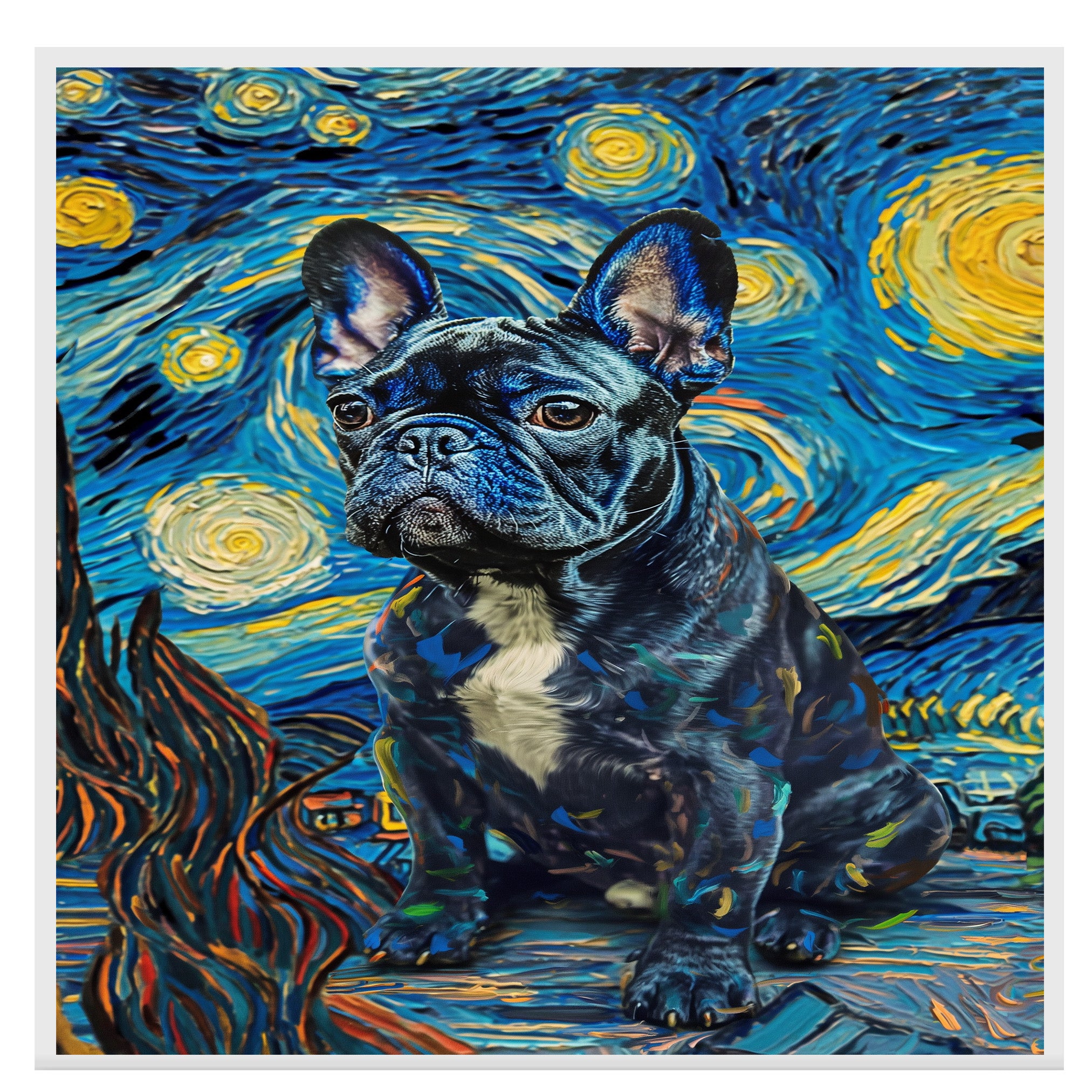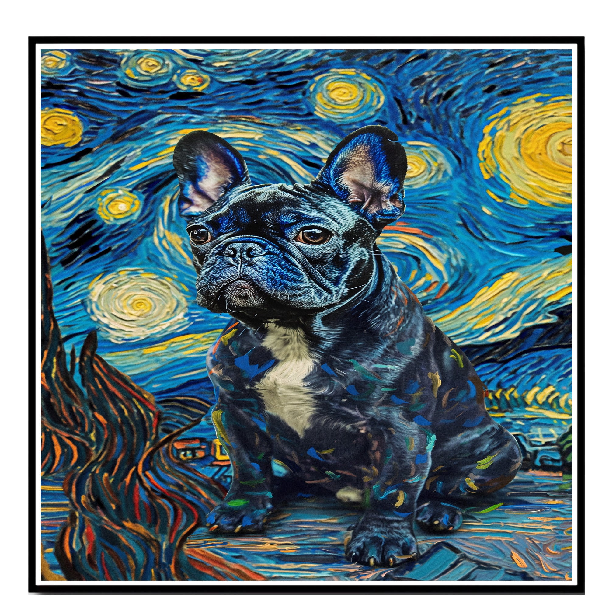 This stunning Blue French Bulldog portrait captures the breed’s signature attitude and charm, set against a Van Gogh-inspired swirling night sky. Bold textures and deep blue tones highlight the dog’s muscular stance, while the starry sky adds a dreamy, expressive backdrop. A perfect piece for Frenchie lovers and art enthusiasts alike, merging bold personality with iconic painterly style.