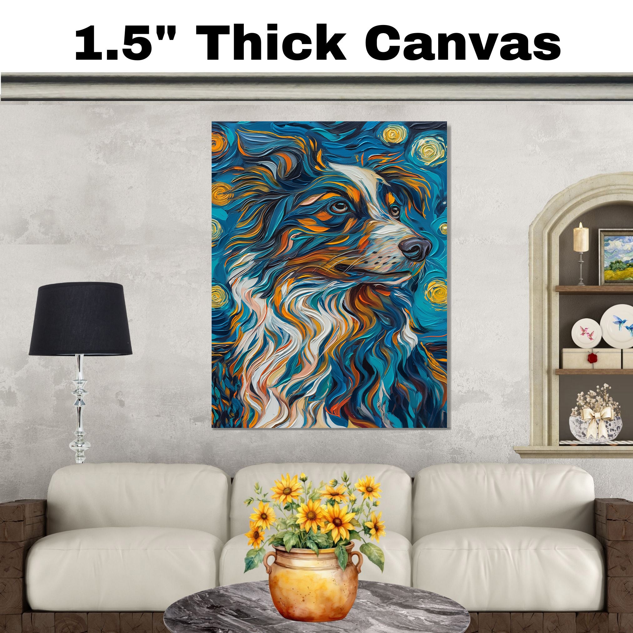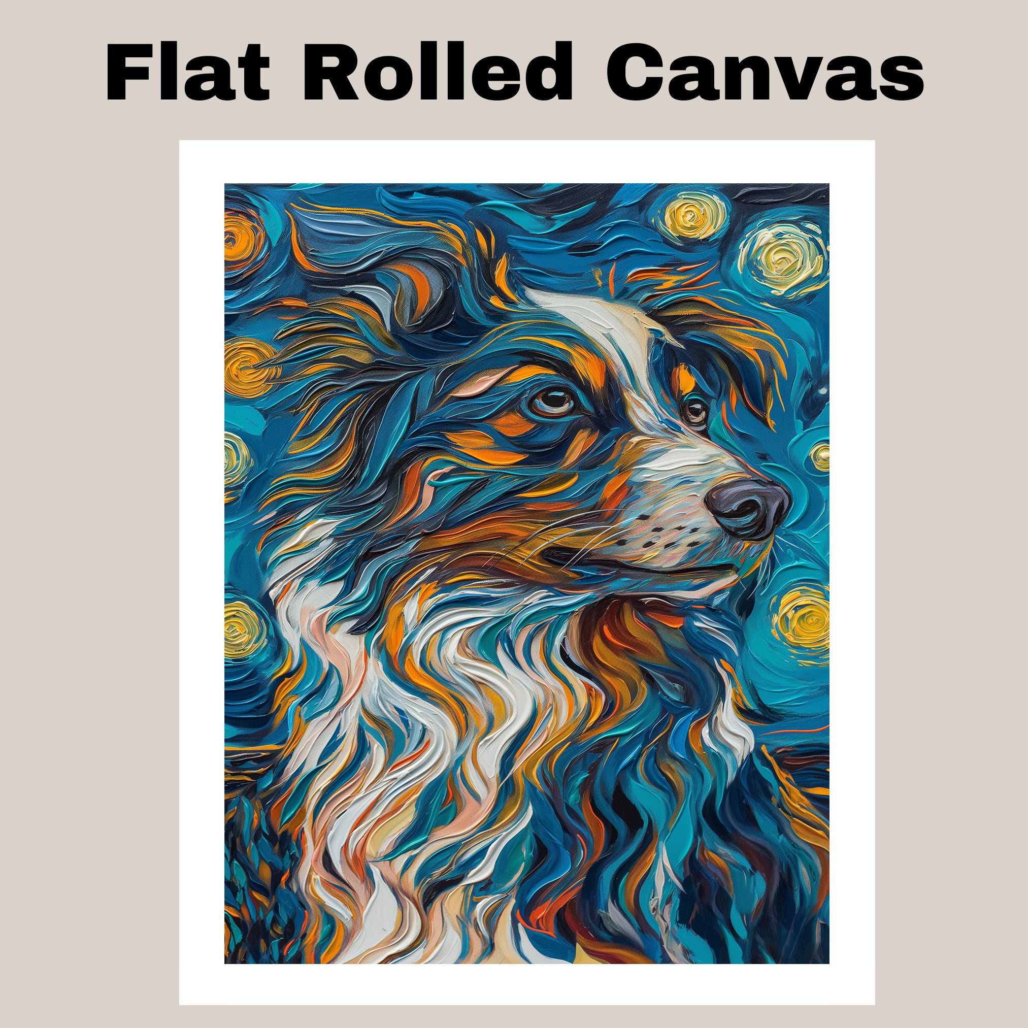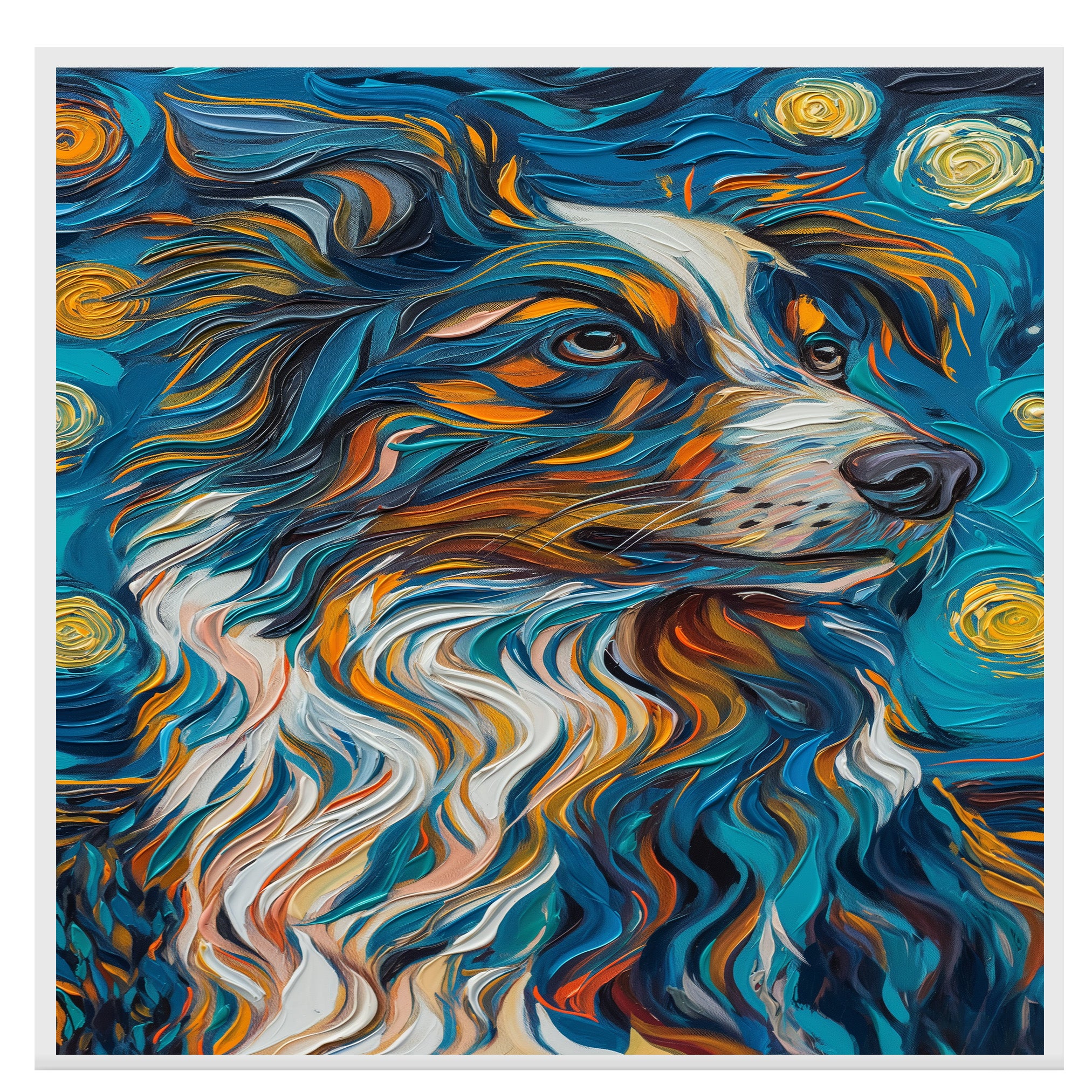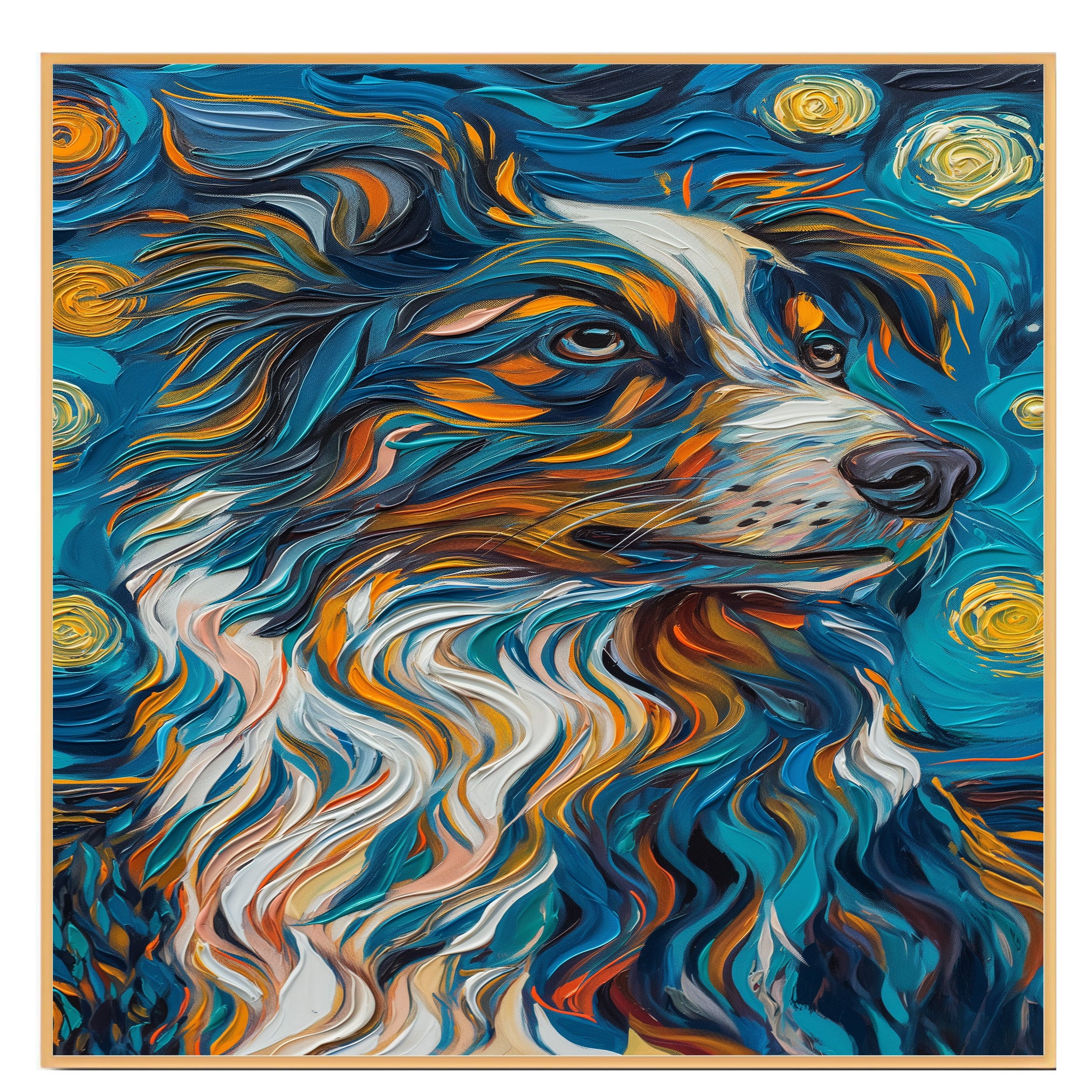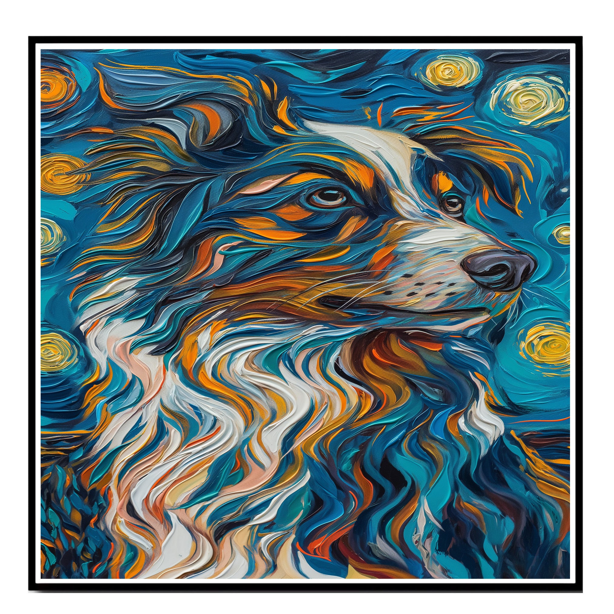 This mesmerizing Blue Merle Australian Shepherd portrait combines the elegance of fine art with the emotional depth of Van Gogh’s style. Flowing brushstrokes swirl around the expressive dog, capturing a sense of motion, loyalty, and quiet wonder. The dreamy background of stars and texture-rich fur make this piece a standout for art collectors, dog lovers, or anyone seeking vivid wall decor with heart.