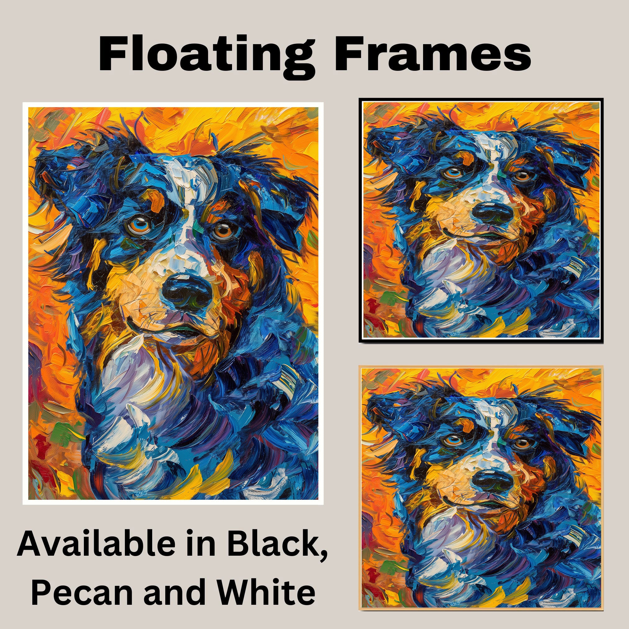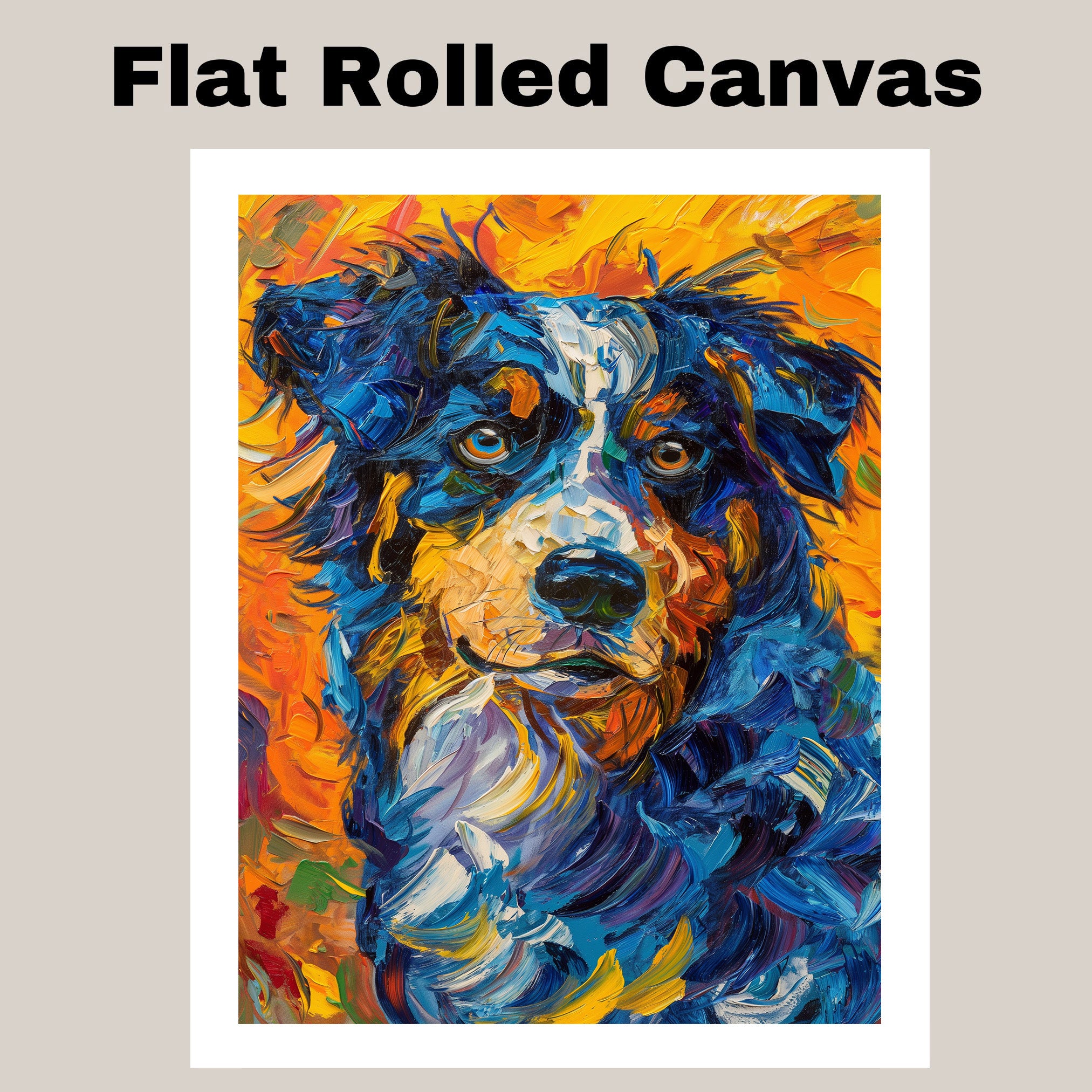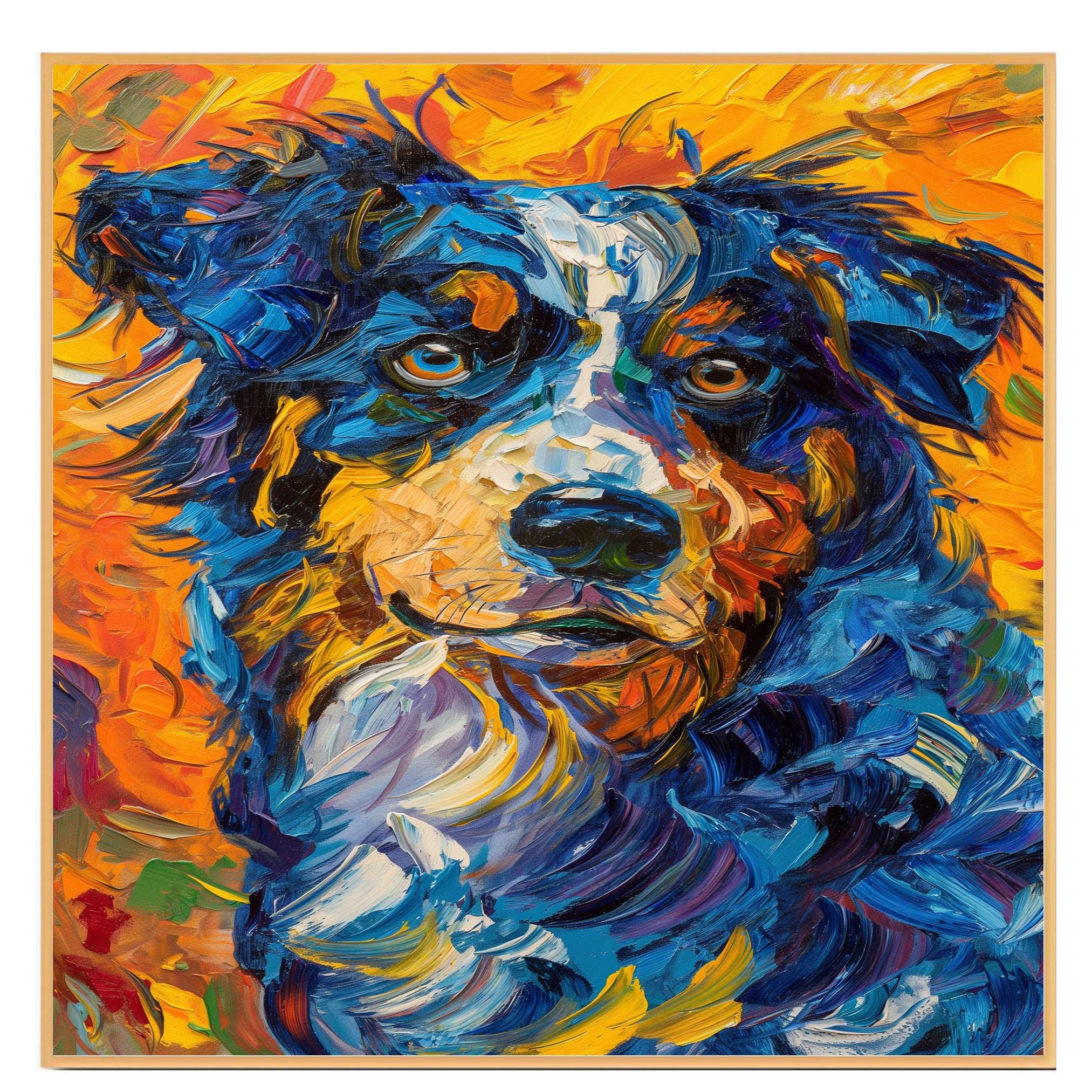 This striking Blue Merle Australian Shepherd painting channels the vivid brushwork and swirling textures of Van Gogh's signature style. The expressive dog portrait is alive with color—fiery oranges and deep blues collide in an emotional, textured rendering that celebrates both art and animal. Ideal for dog lovers, collectors, or anyone looking to add a bold, artistic statement to their space.