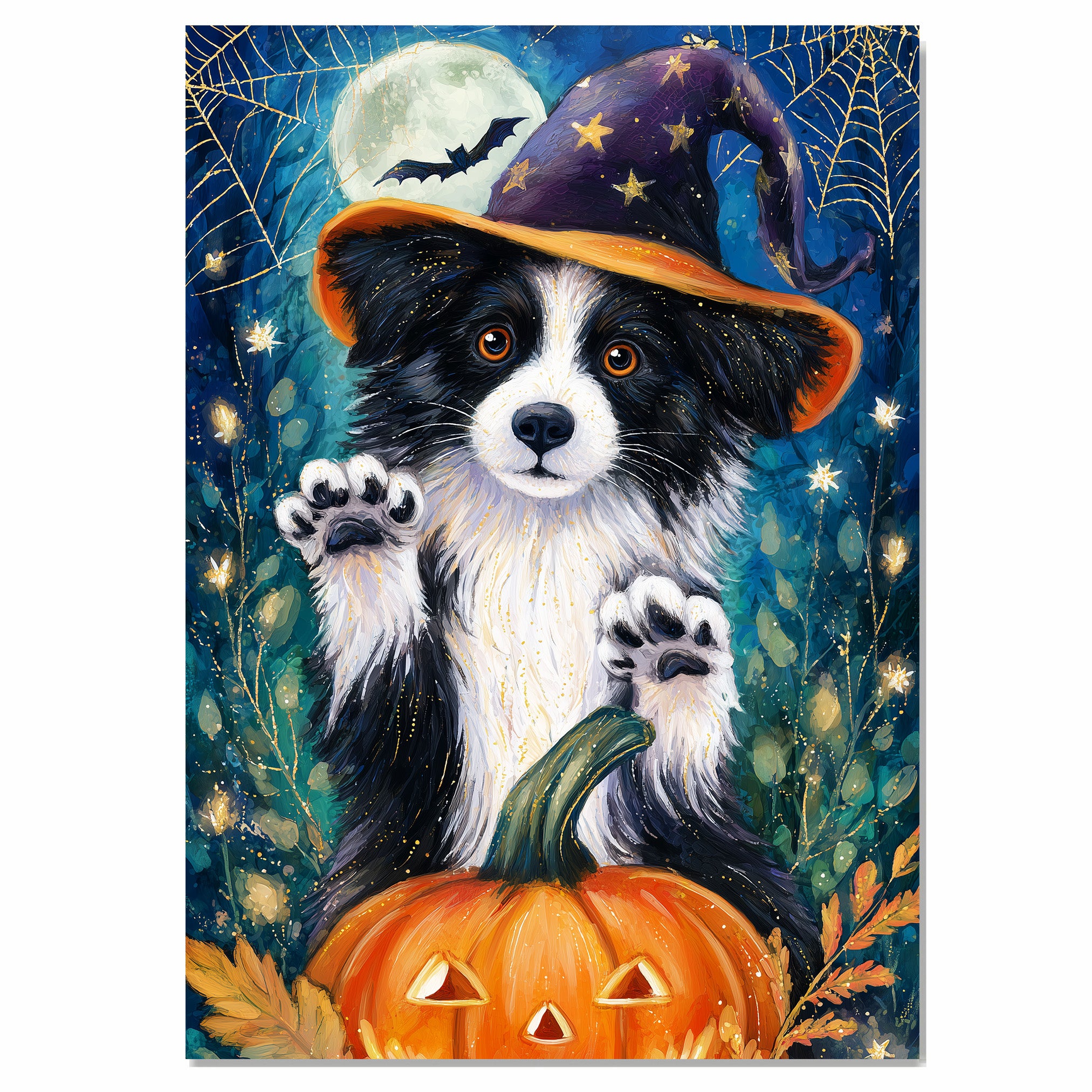 Celebrate Halloween with this enchanting Border Collie puppy canvas wall art. Featuring a playful Border Collie dressed in a witch hat with a glowing jack o lantern, this artwork blends festive charm with the intelligent spirit of this beloved herding breed. Perfect for Border Collie owners, dog lovers, and anyone wanting unique seasonal wall decor, this piece adds warmth and personality to your home or makes a thoughtful gift.