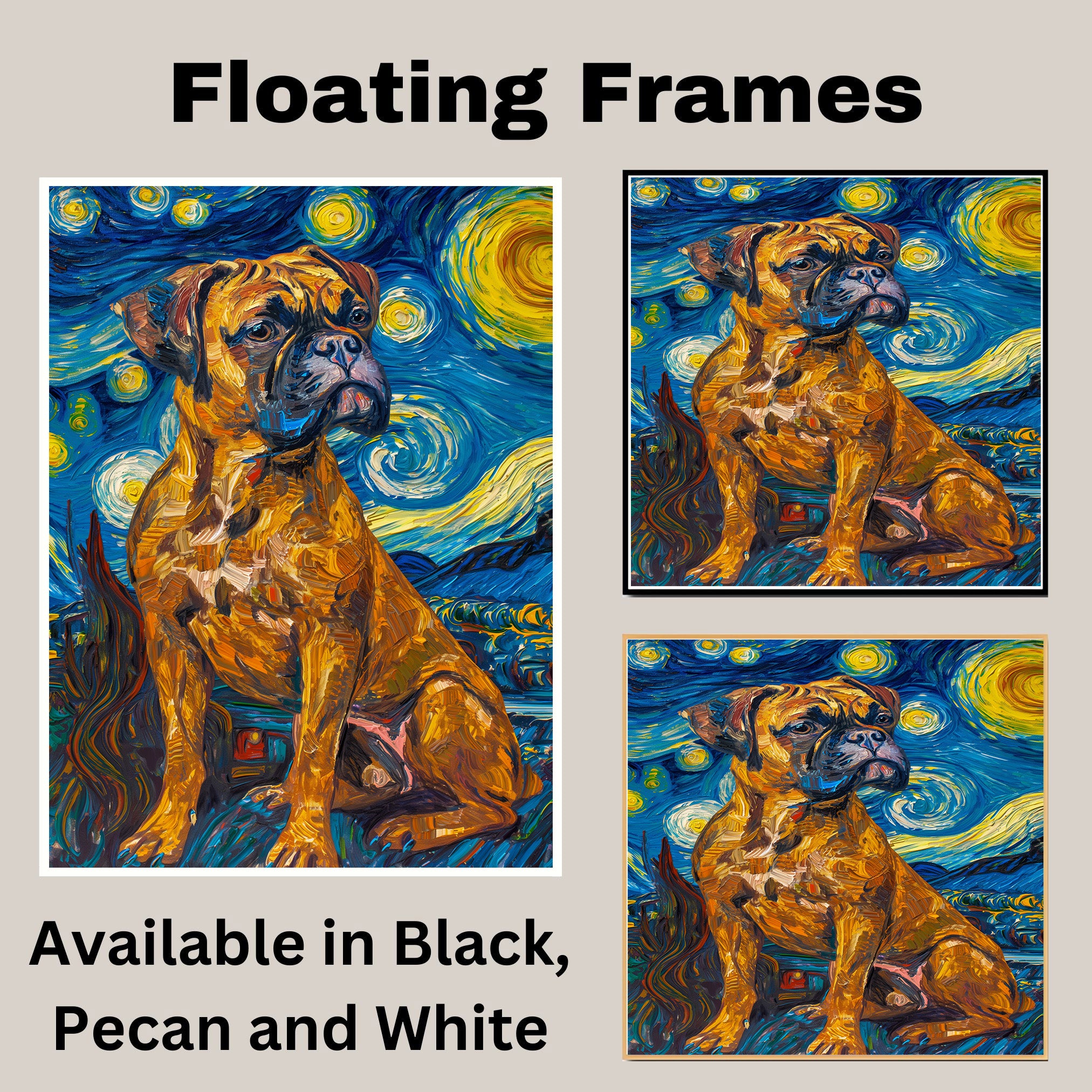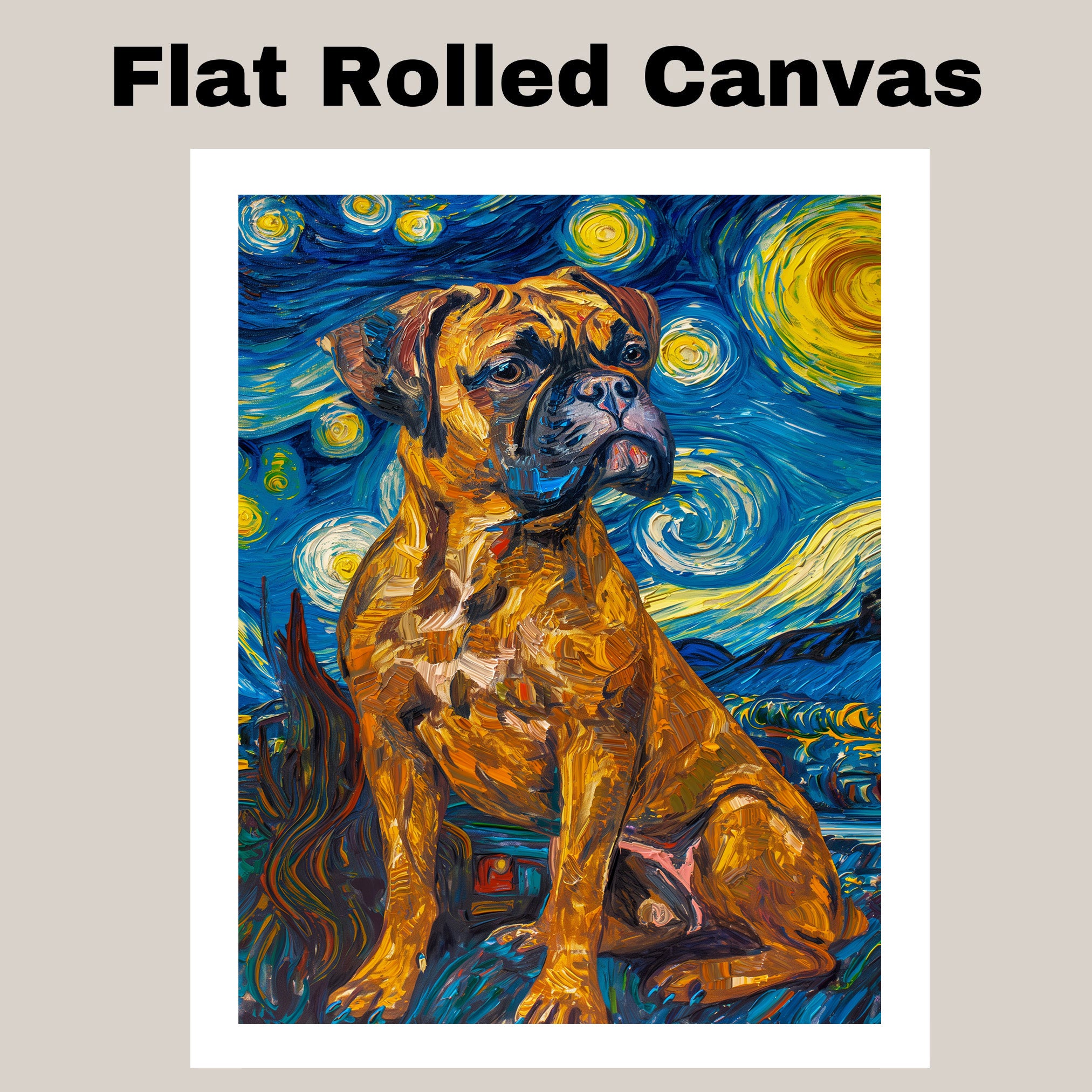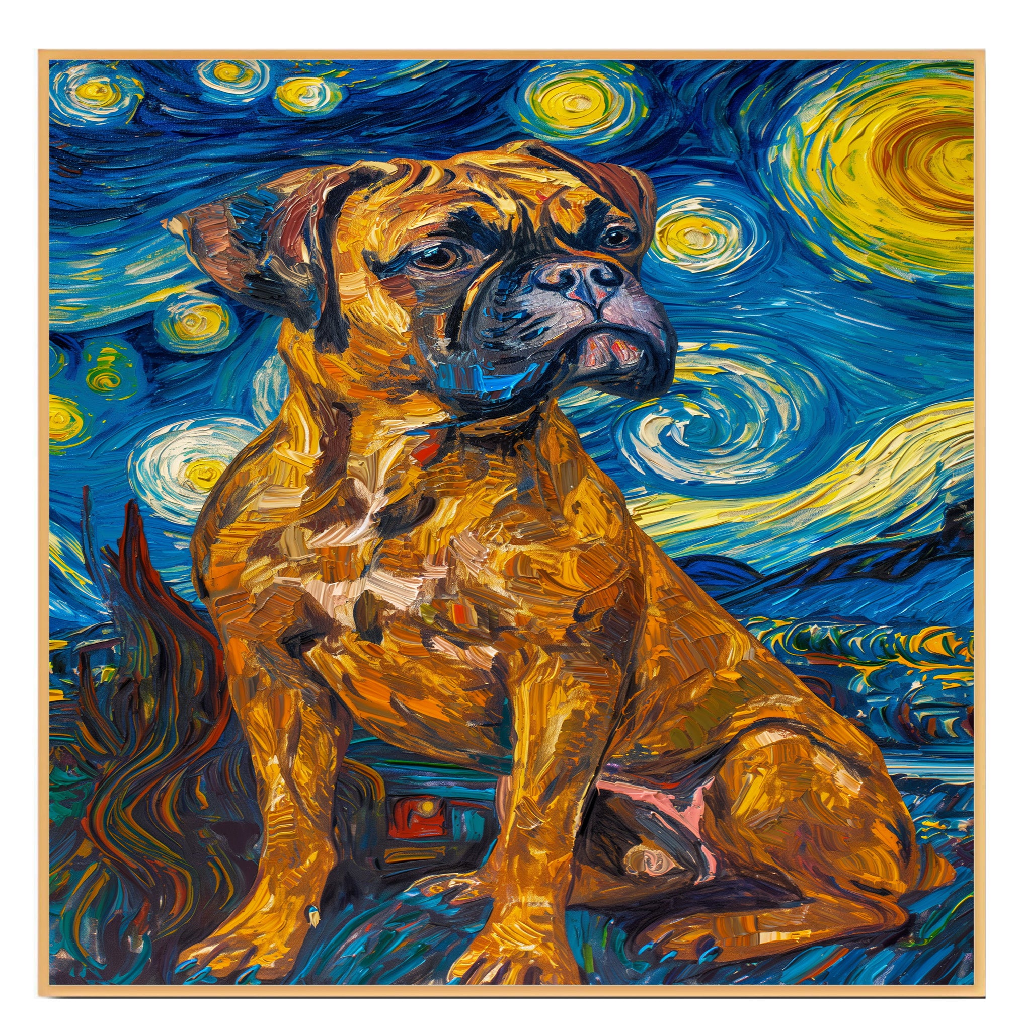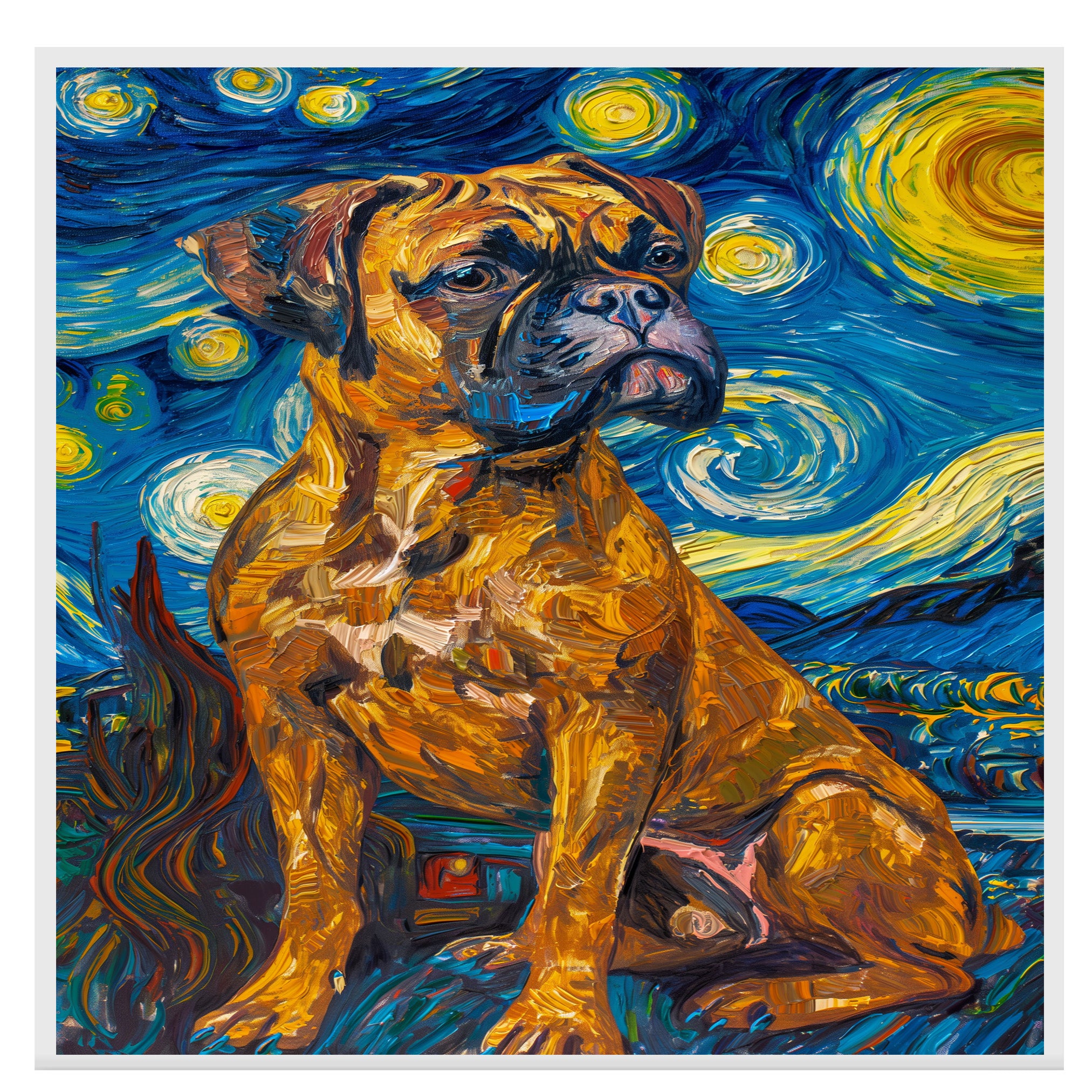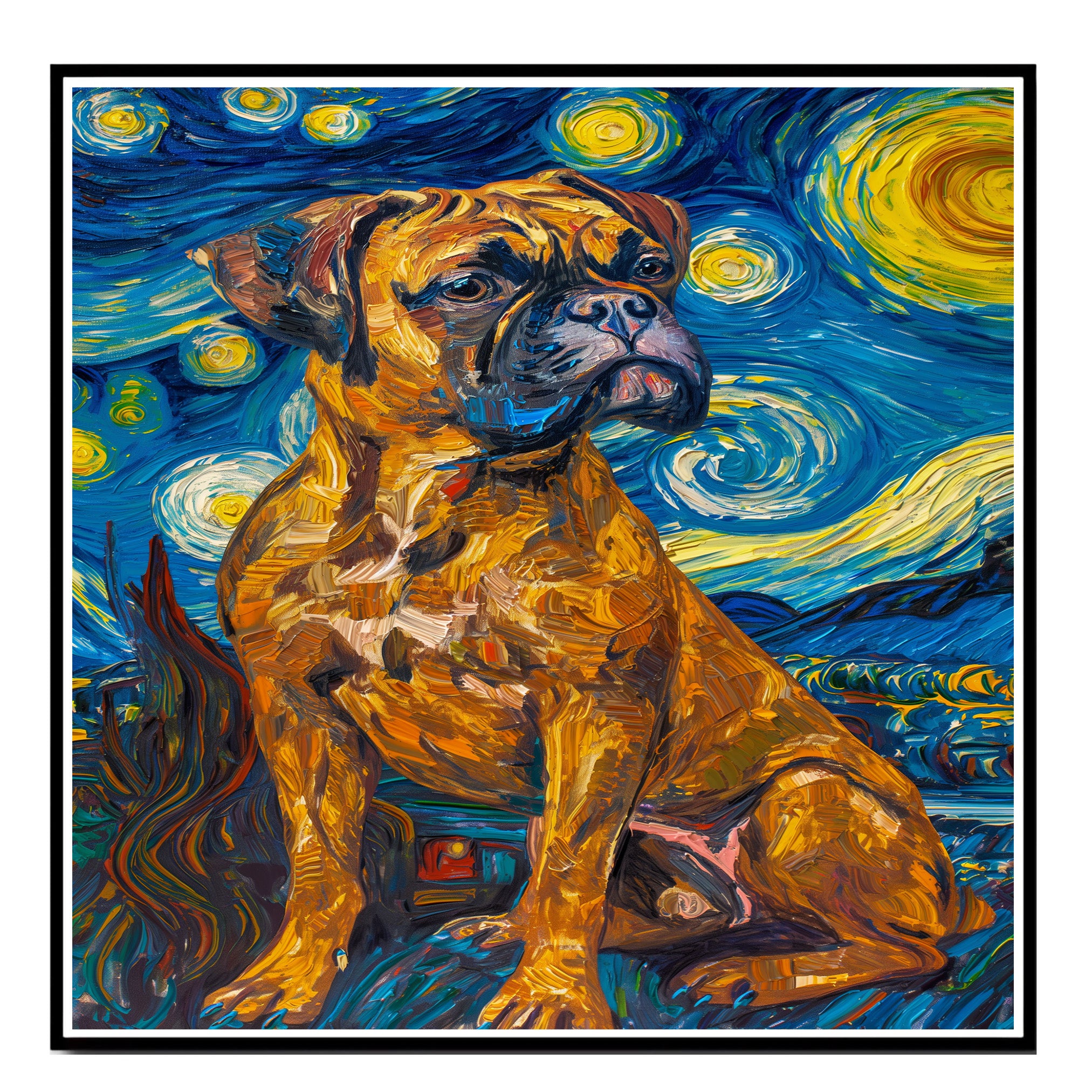 This full-body Boxer dog portrait combines the strength and loyal nature of the breed with the expressive charm of Van Gogh’s Starry Night. The swirling sky and vivid brush strokes radiate energy and emotion, while the Boxer’s serious expression adds depth and personality. A vibrant and imaginative piece ideal for dog lovers, art collectors, or anyone who appreciates expressive animal art.