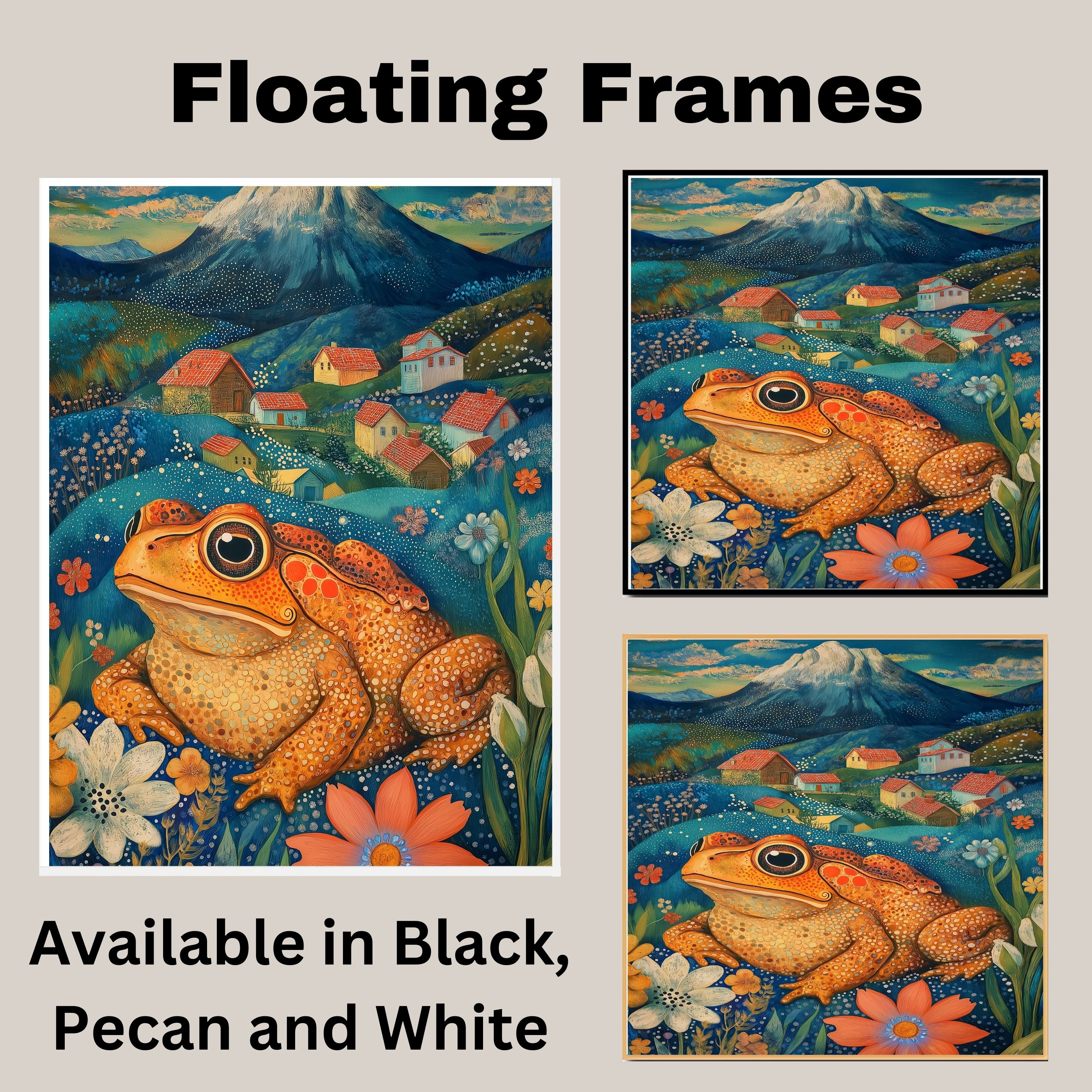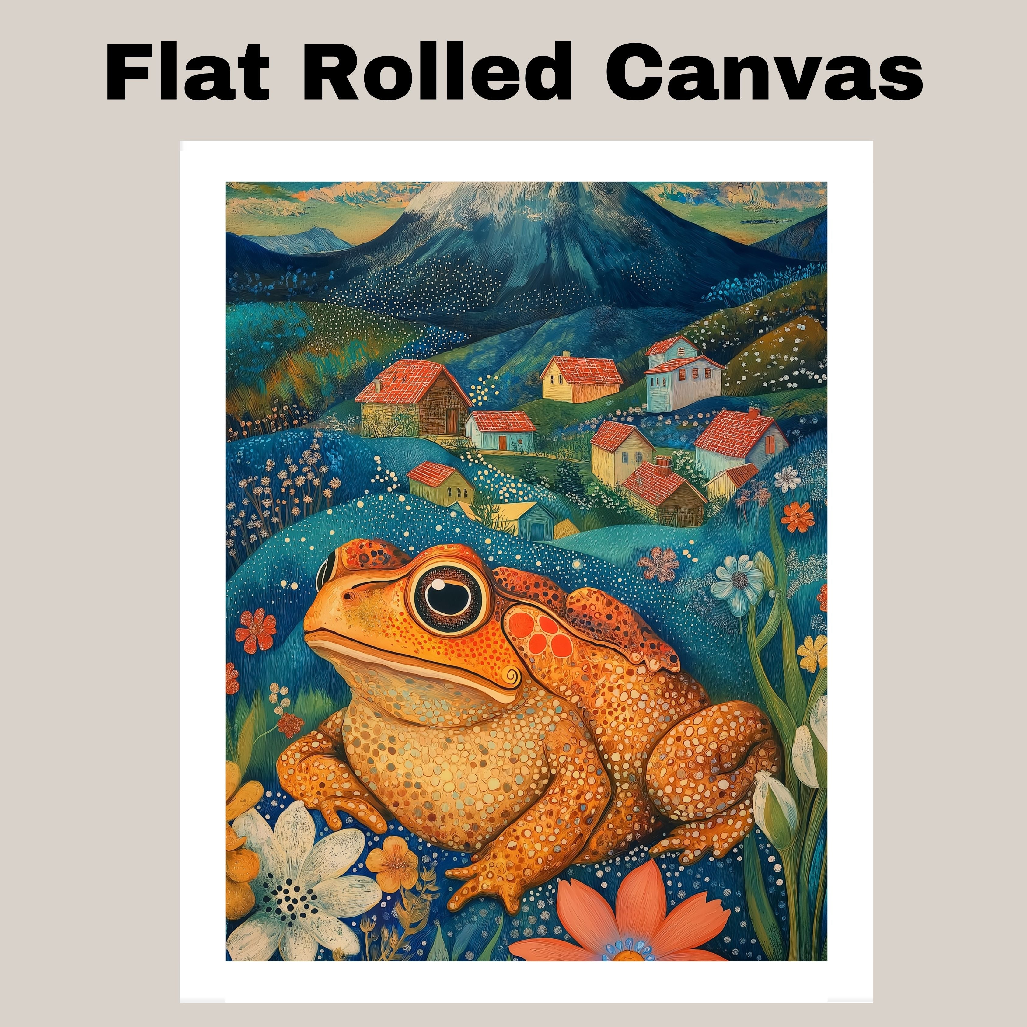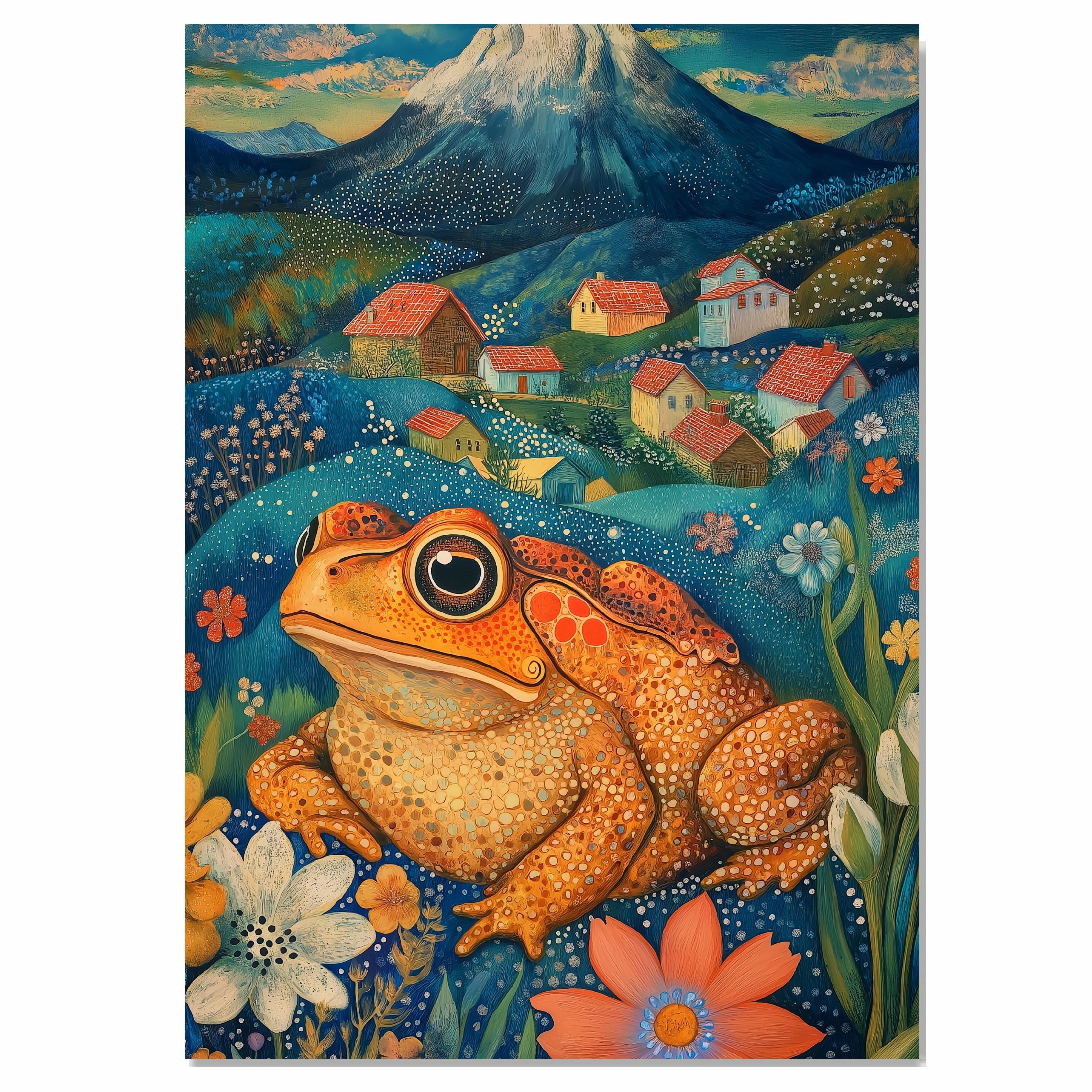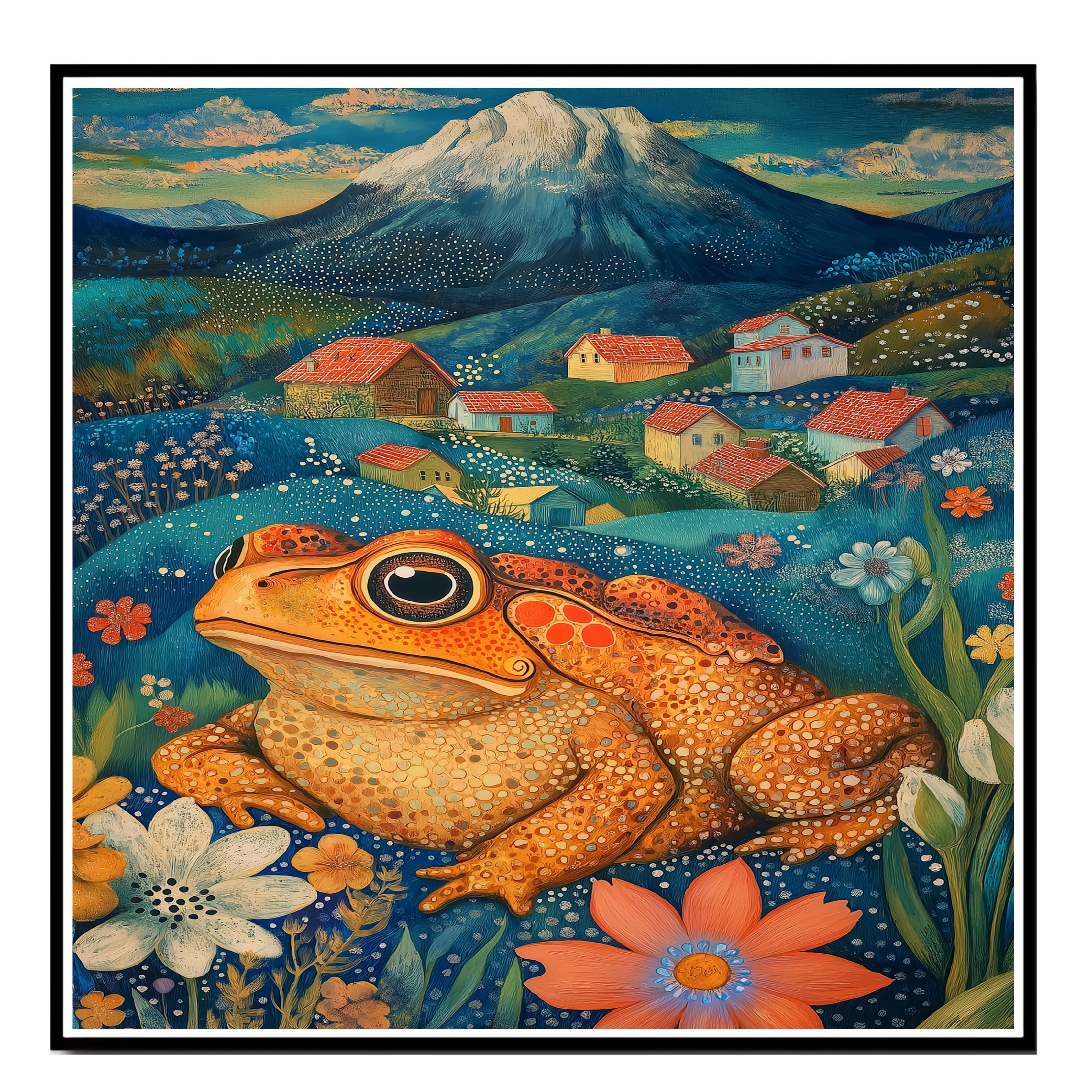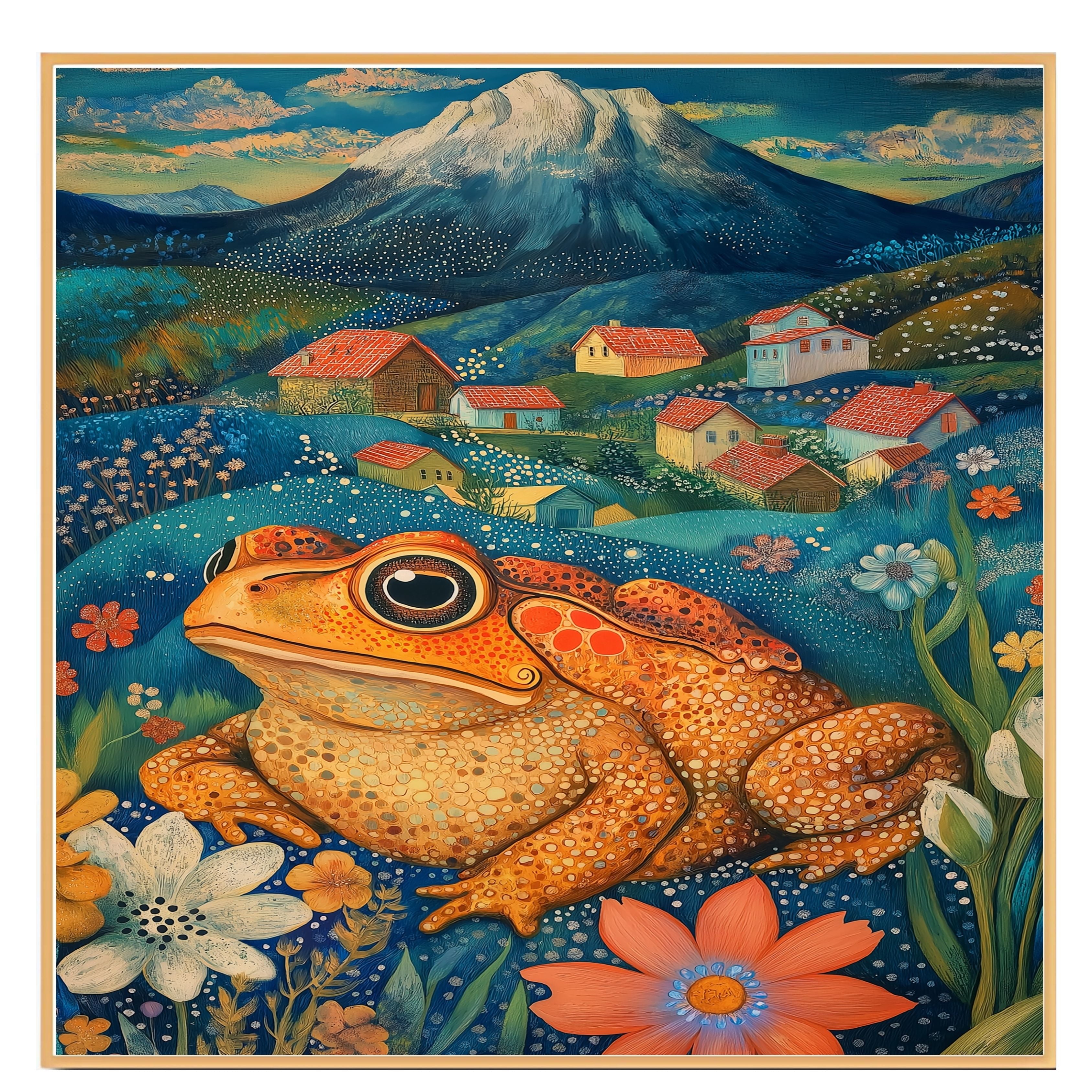 Fill your home with joy and color with this bright hand painted artwork featuring a whimsical toad among colorful flowers in a vibrant mountain village A cheerful nature inspired addition to home wall decor or a delightful gift for animal and art lovers.
