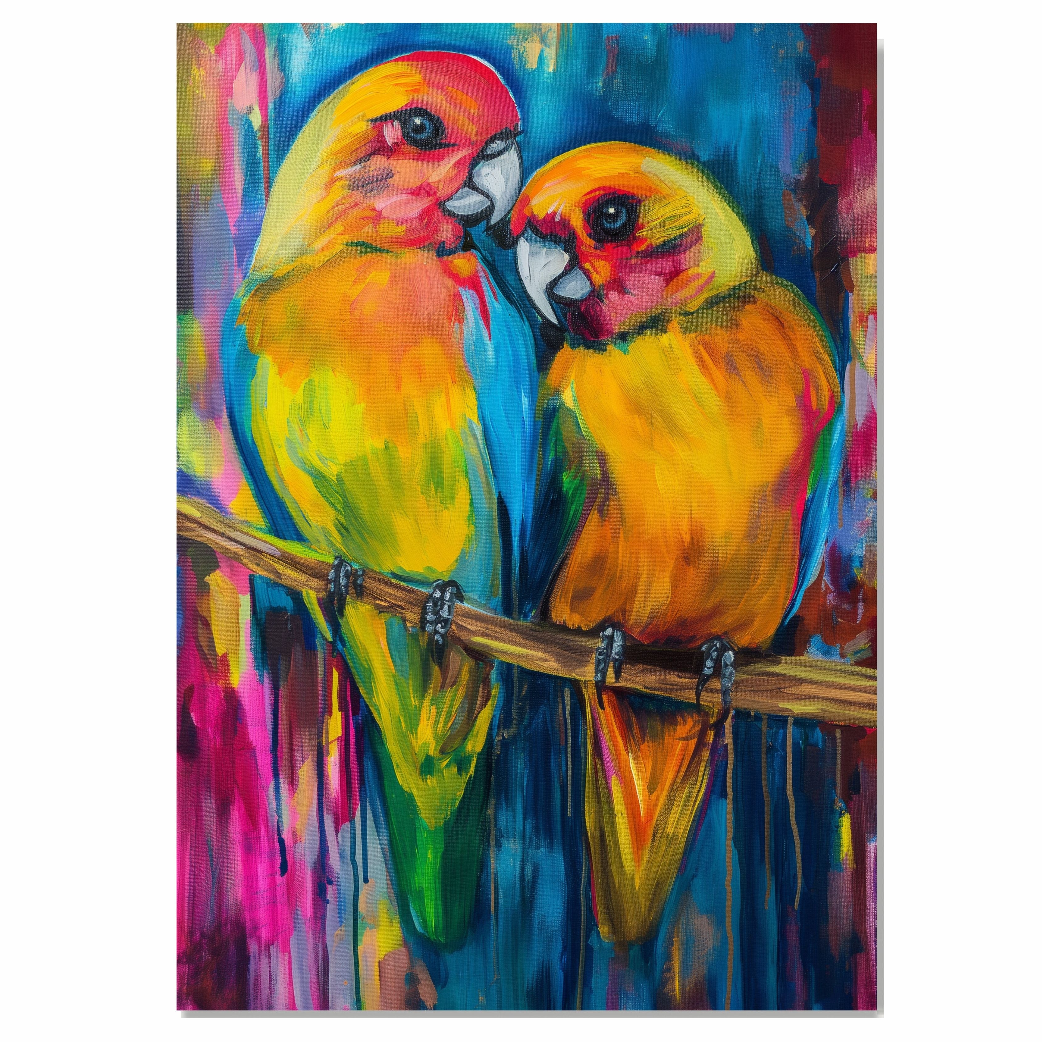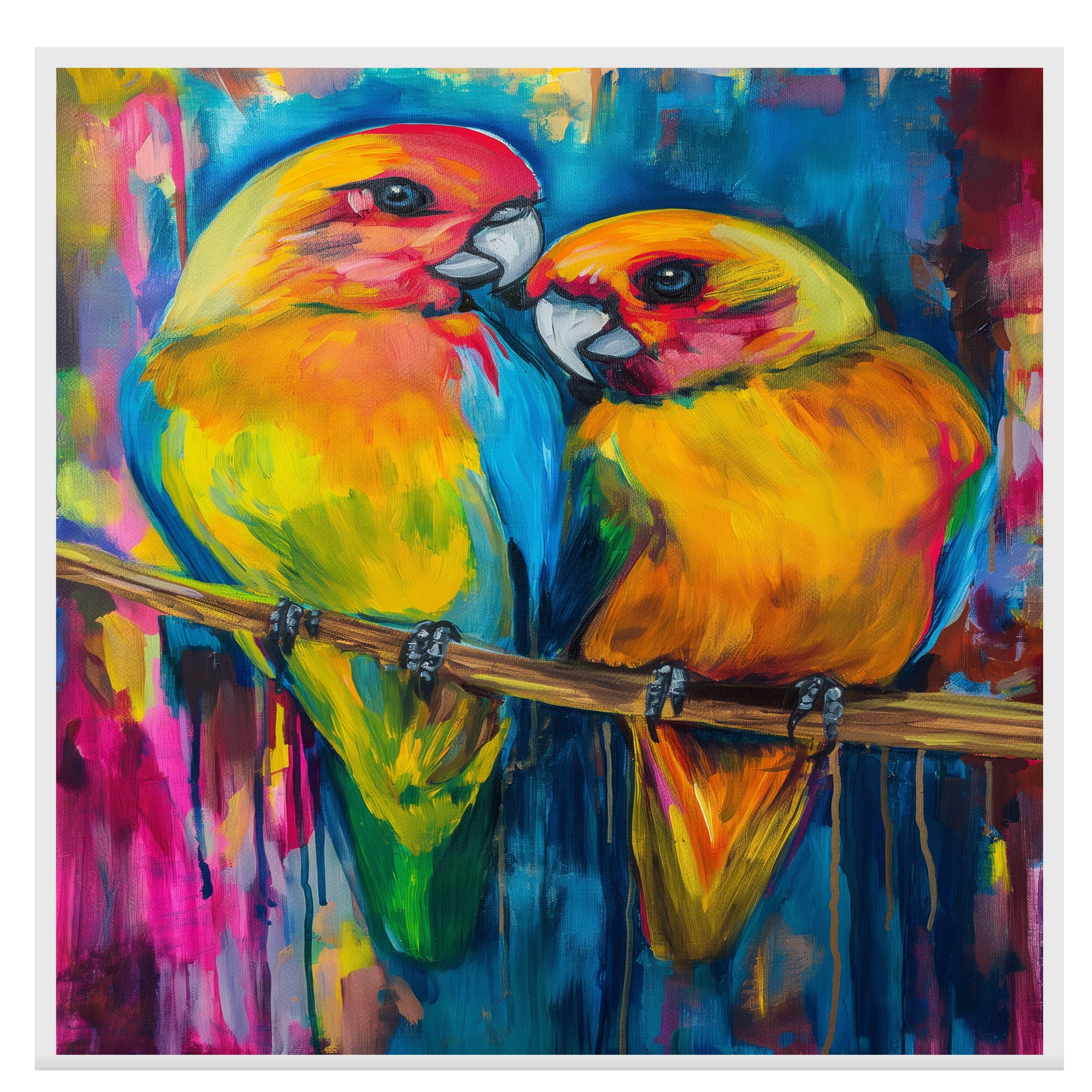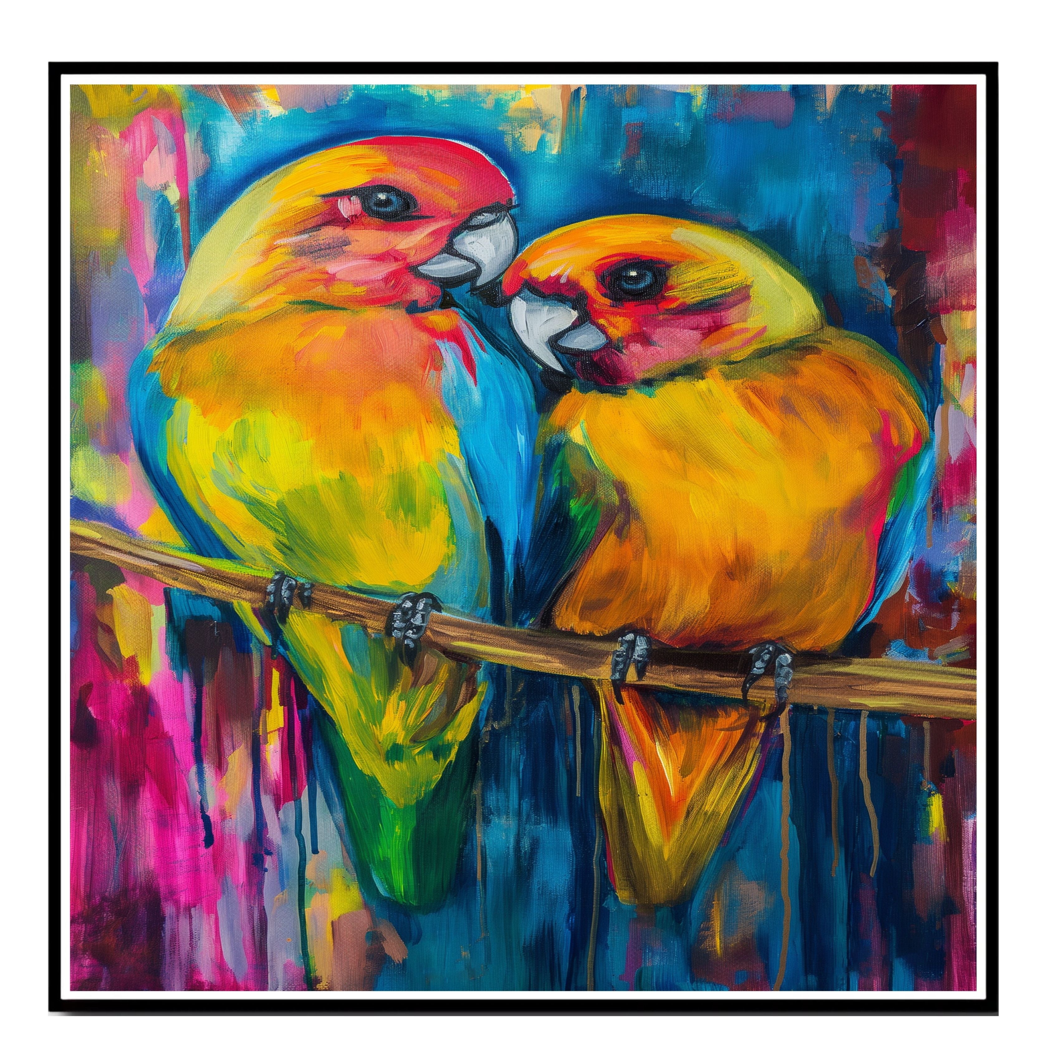 This expressive artwork captures two tropical lovebirds in a vibrant abstract style, full of colorful brushstrokes and emotional connection. The lively background blends blues, pinks, and yellows, enhancing the bold orange and green feathers of the birds. Ideal for modern art lovers and tropical bird enthusiasts, this piece brings personality and brightness to any interior.