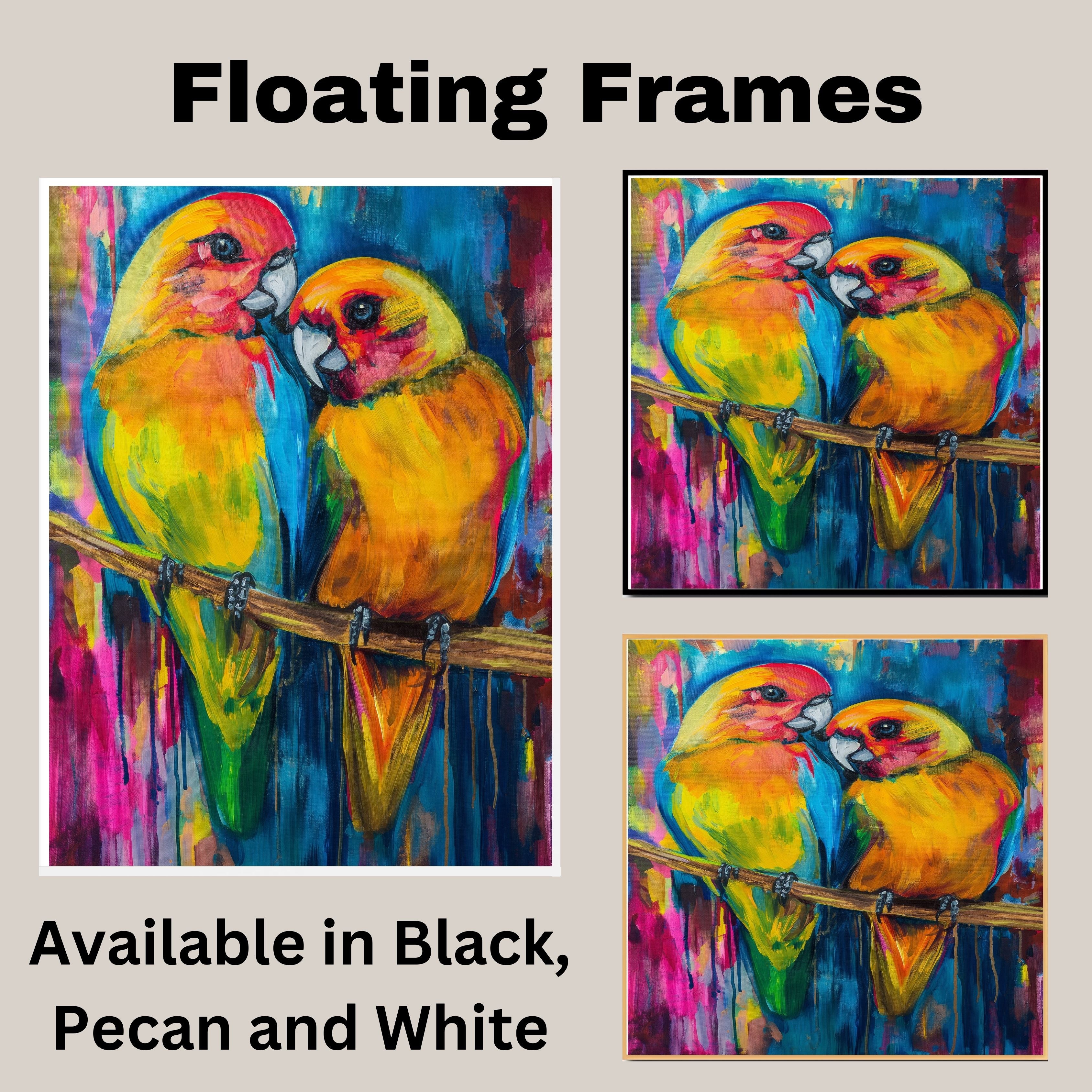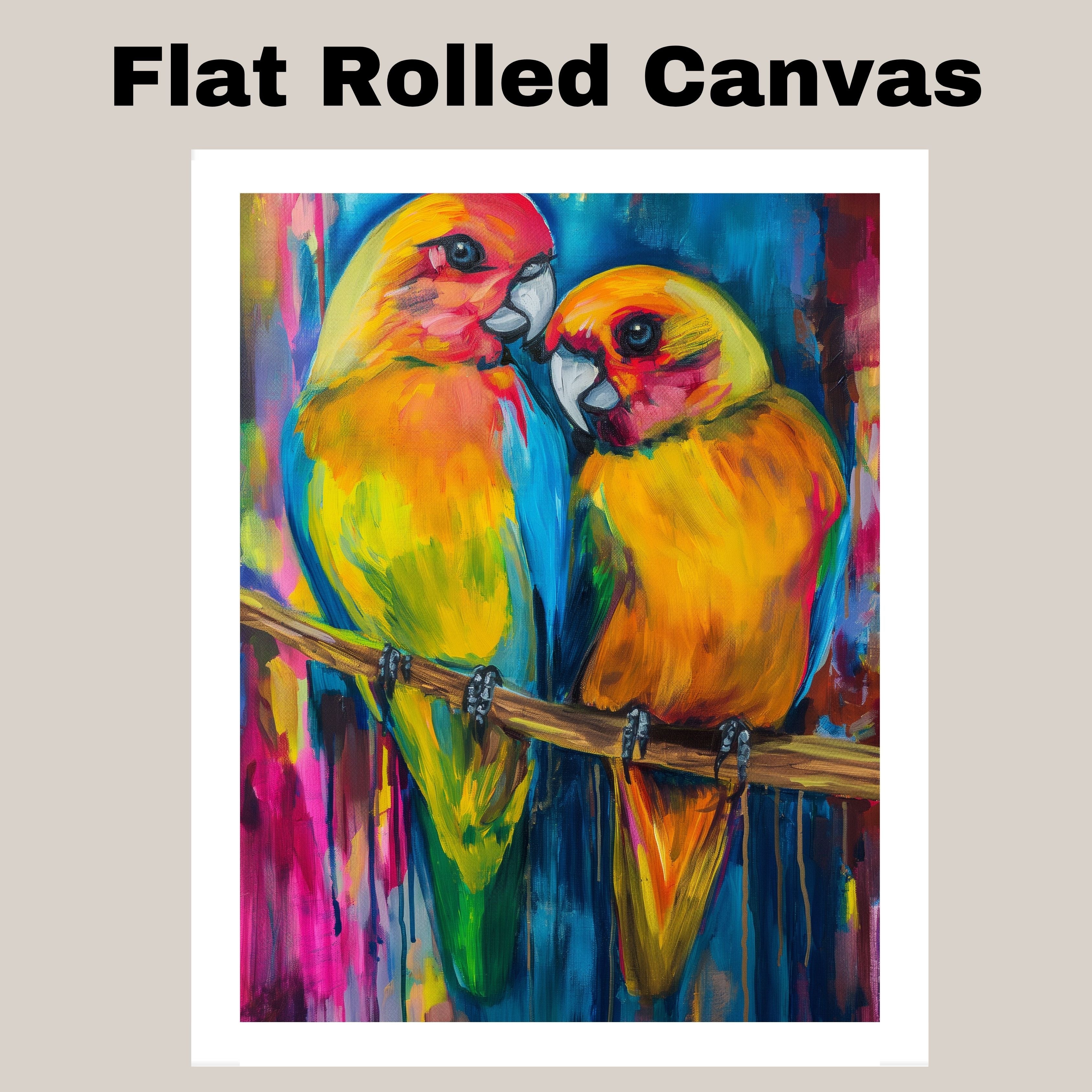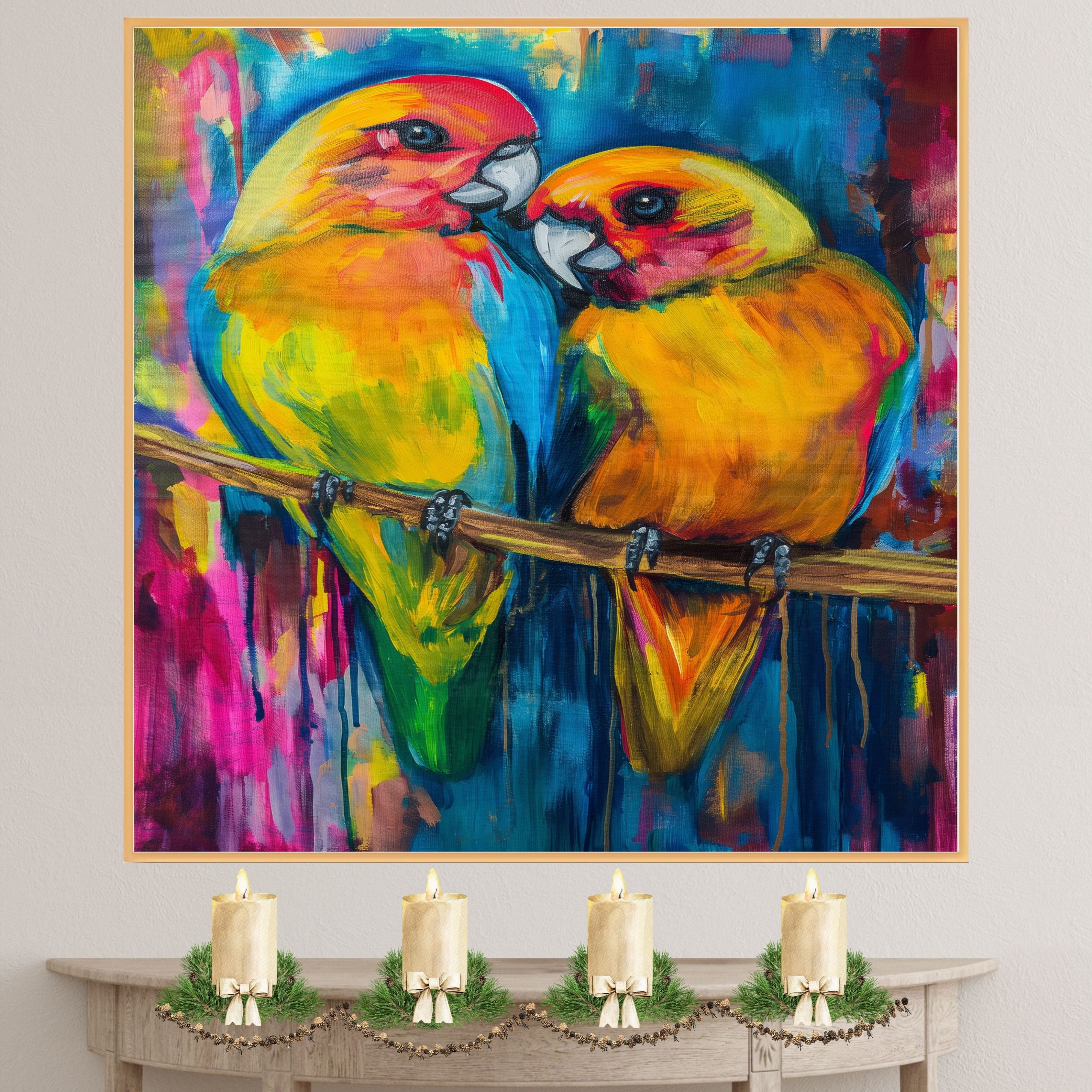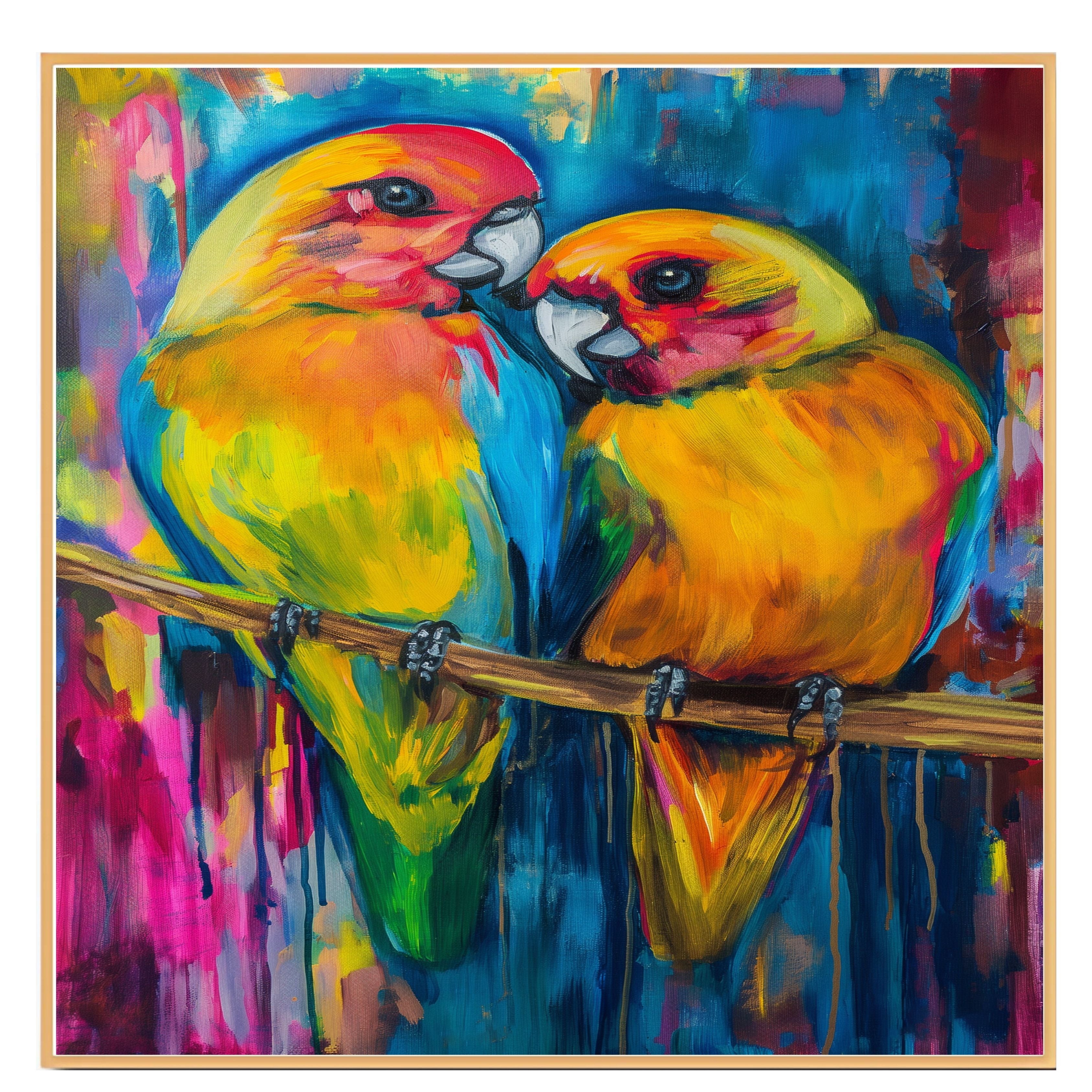This expressive artwork captures two tropical lovebirds in a vibrant abstract style, full of colorful brushstrokes and emotional connection. The lively background blends blues, pinks, and yellows, enhancing the bold orange and green feathers of the birds. Ideal for modern art lovers and tropical bird enthusiasts, this piece brings personality and brightness to any interior.