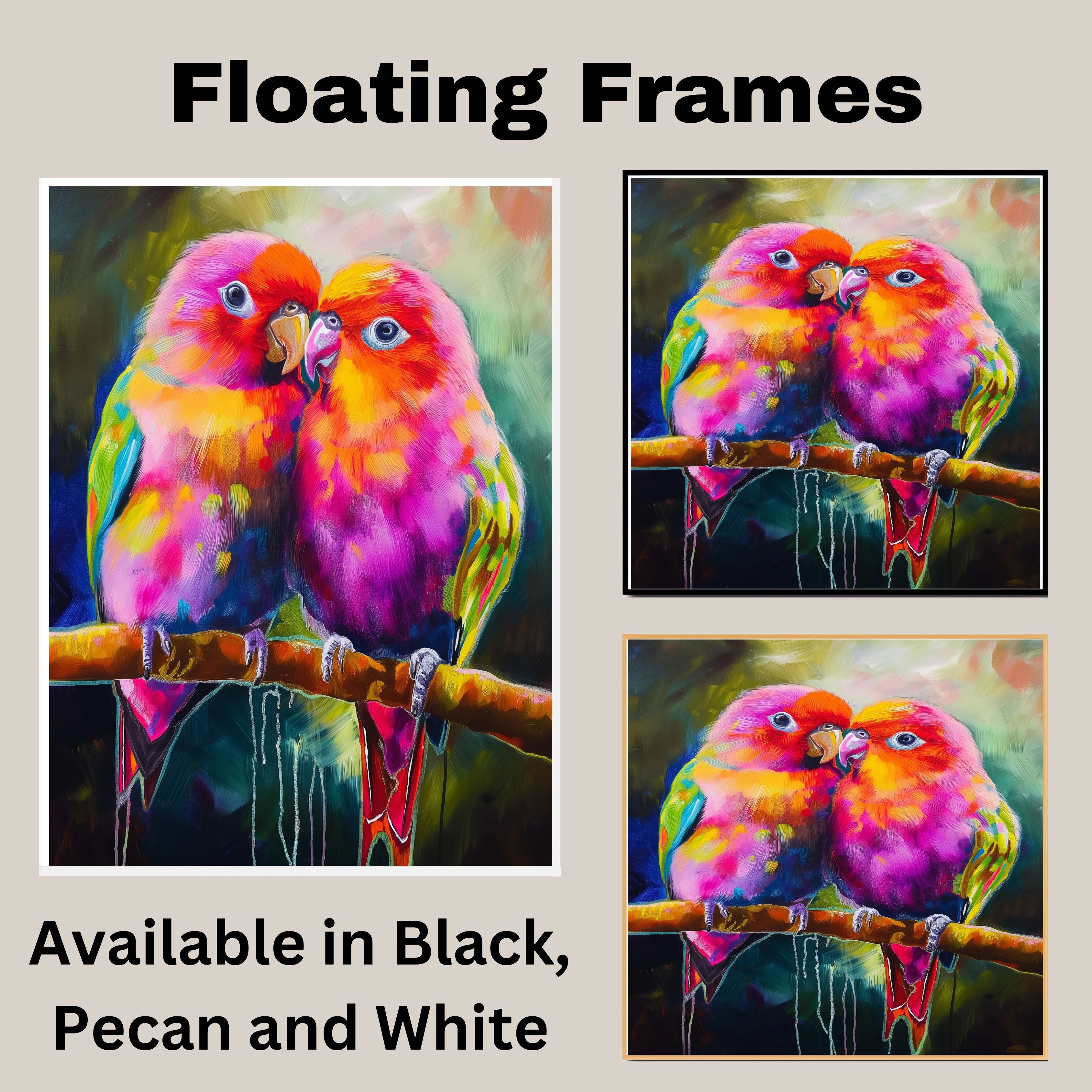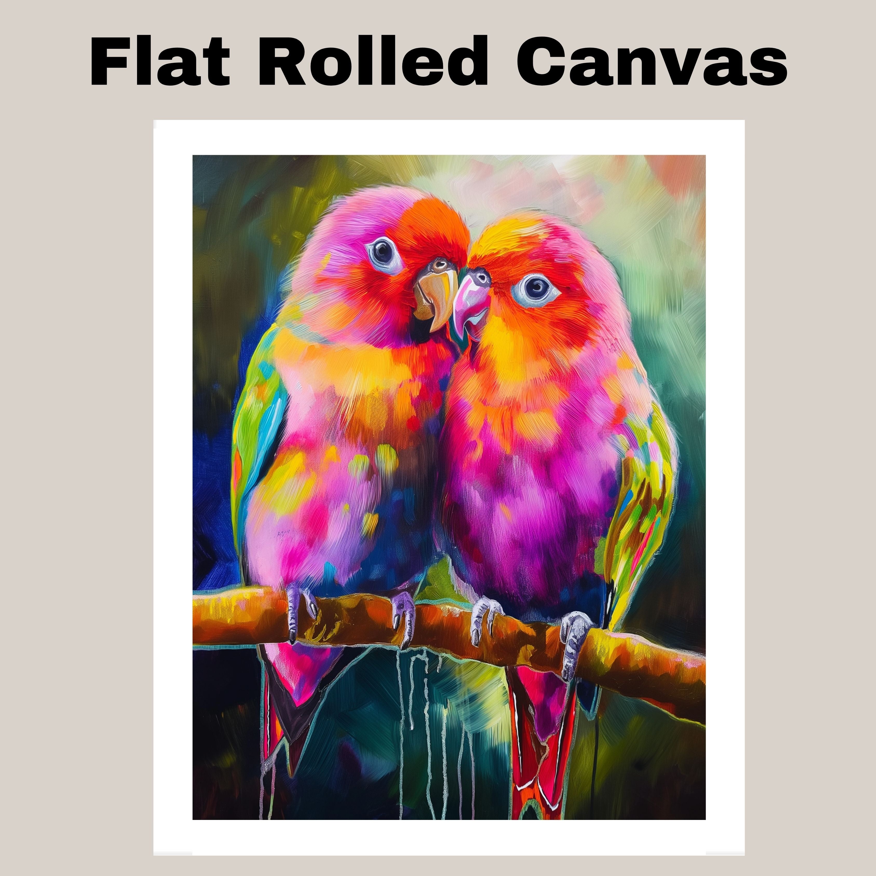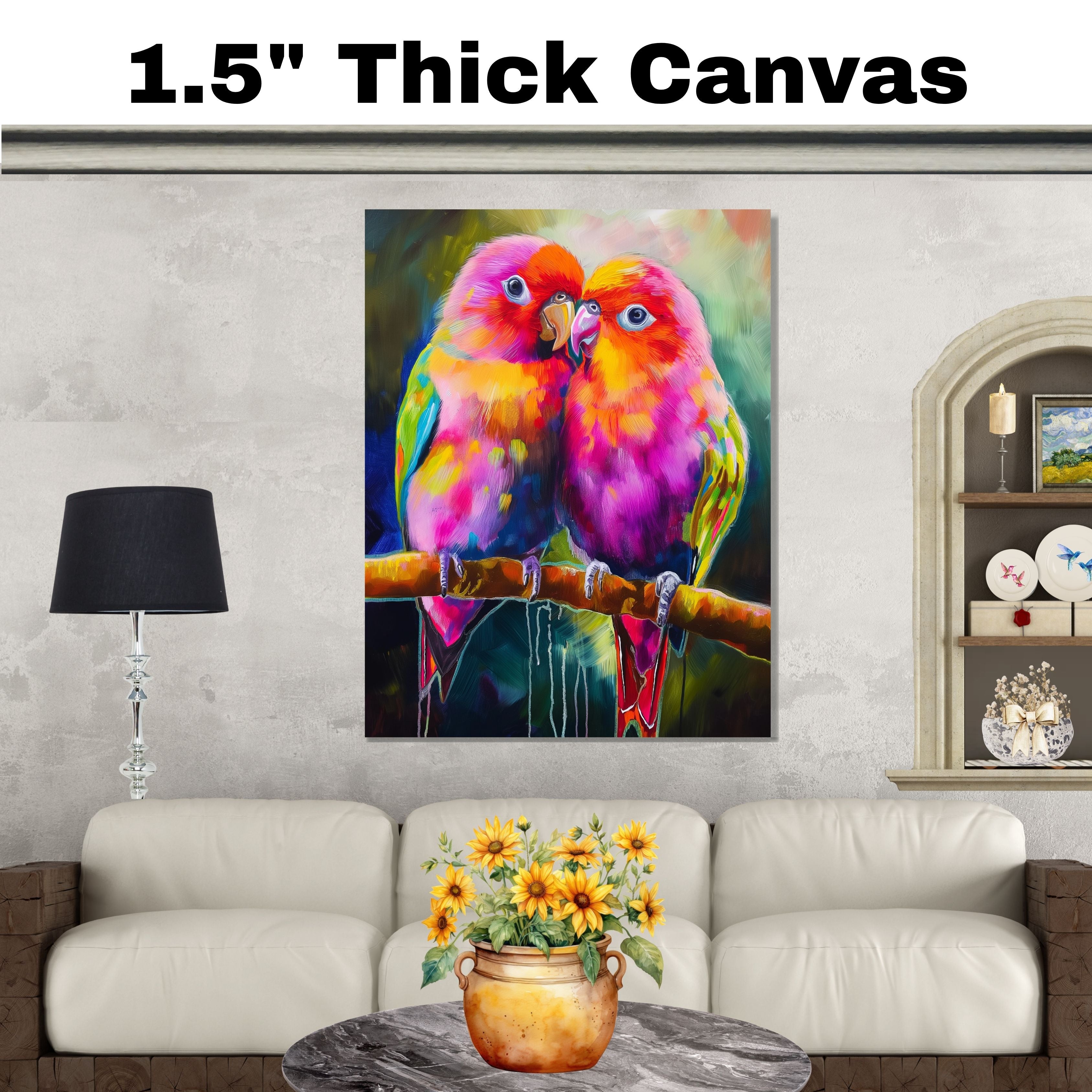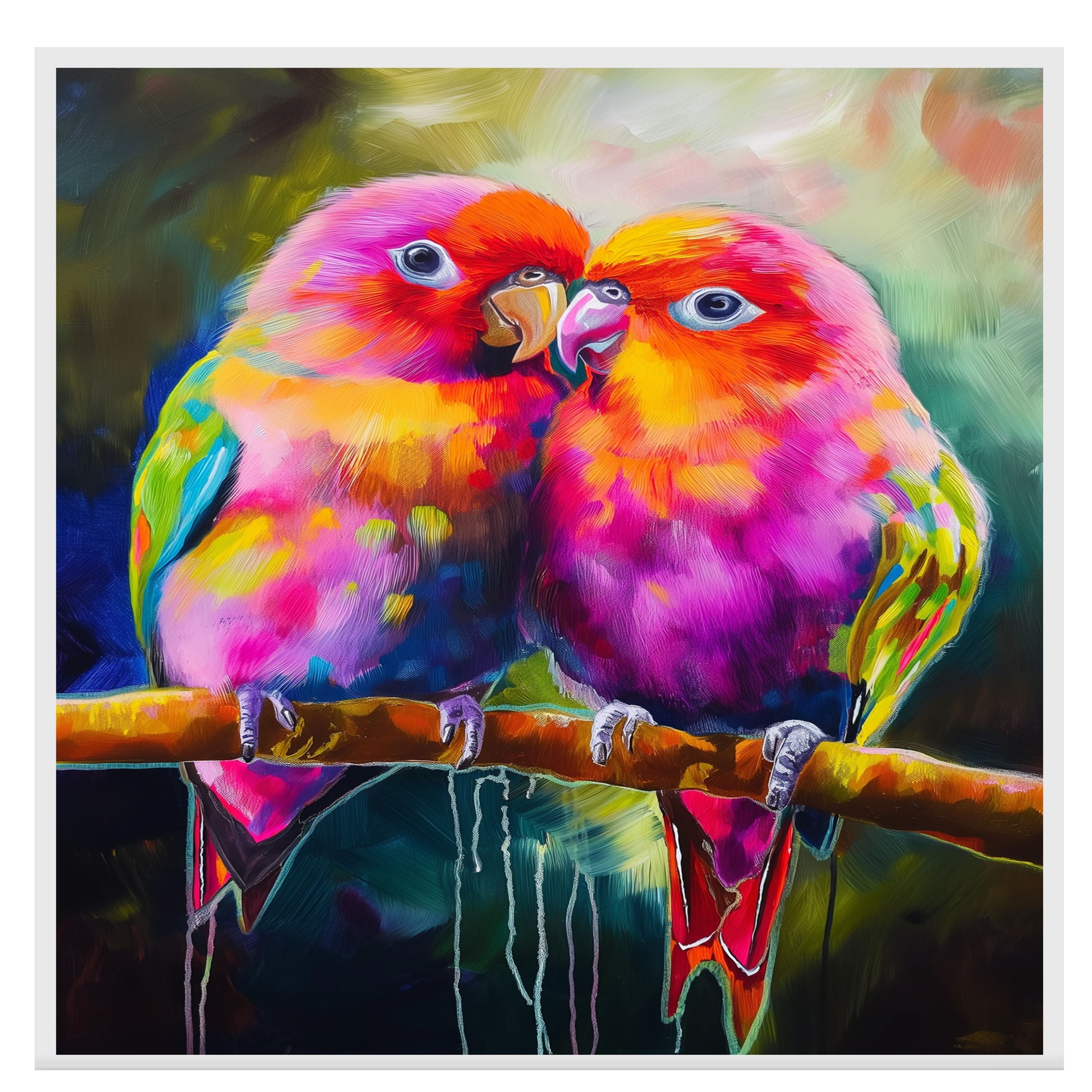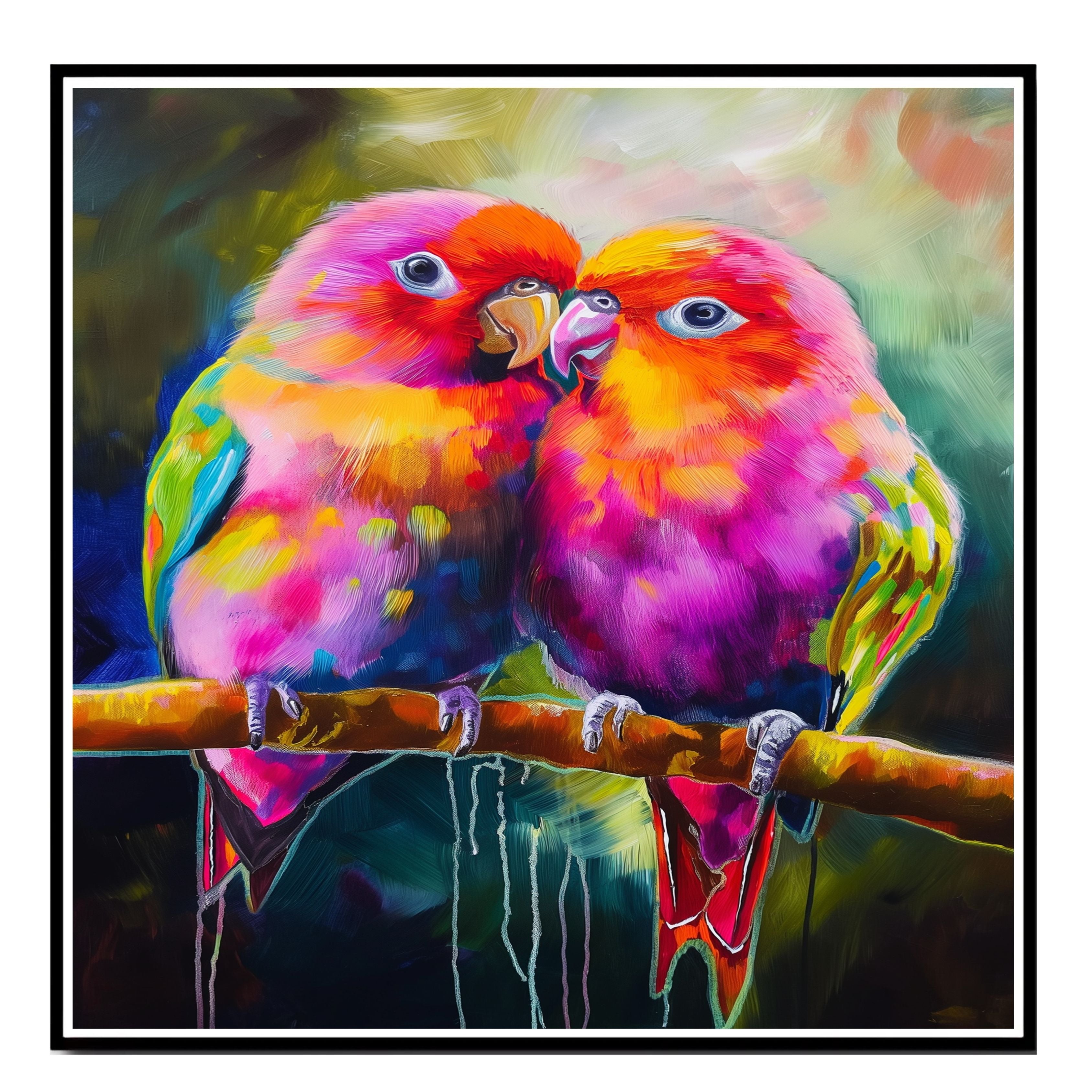 This dazzling artwork features a pair of lovebirds in rich pink, orange, yellow, and blue hues, nestled together on a branch. The vibrant colors and expressive brushstrokes create an emotional and eye-catching composition, ideal for anyone who appreciates bold, joyful art and avian beauty.
