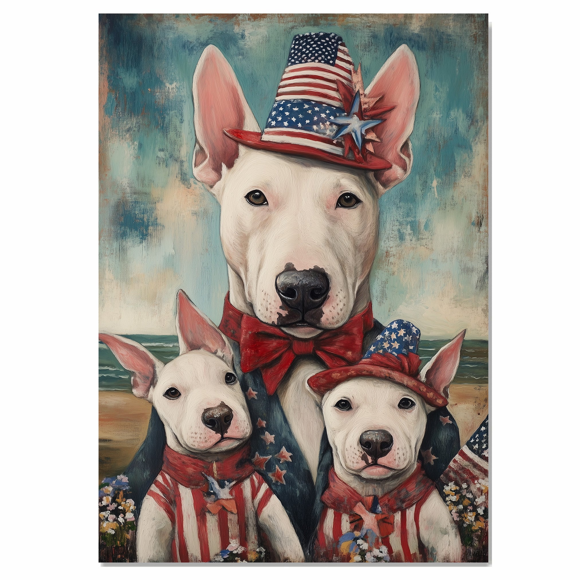 Celebrate the charm of Bull Terriers and patriotic spirit with this oil painting of a proud Bull Terrier mother and her two adorable pups dressed in red, white, and blue. Standing in front of a serene beach backdrop, this vintage-style artwork is a heartwarming tribute to canine companionship and American pride. A delightful piece for dog lovers and patriotic art collectors.
