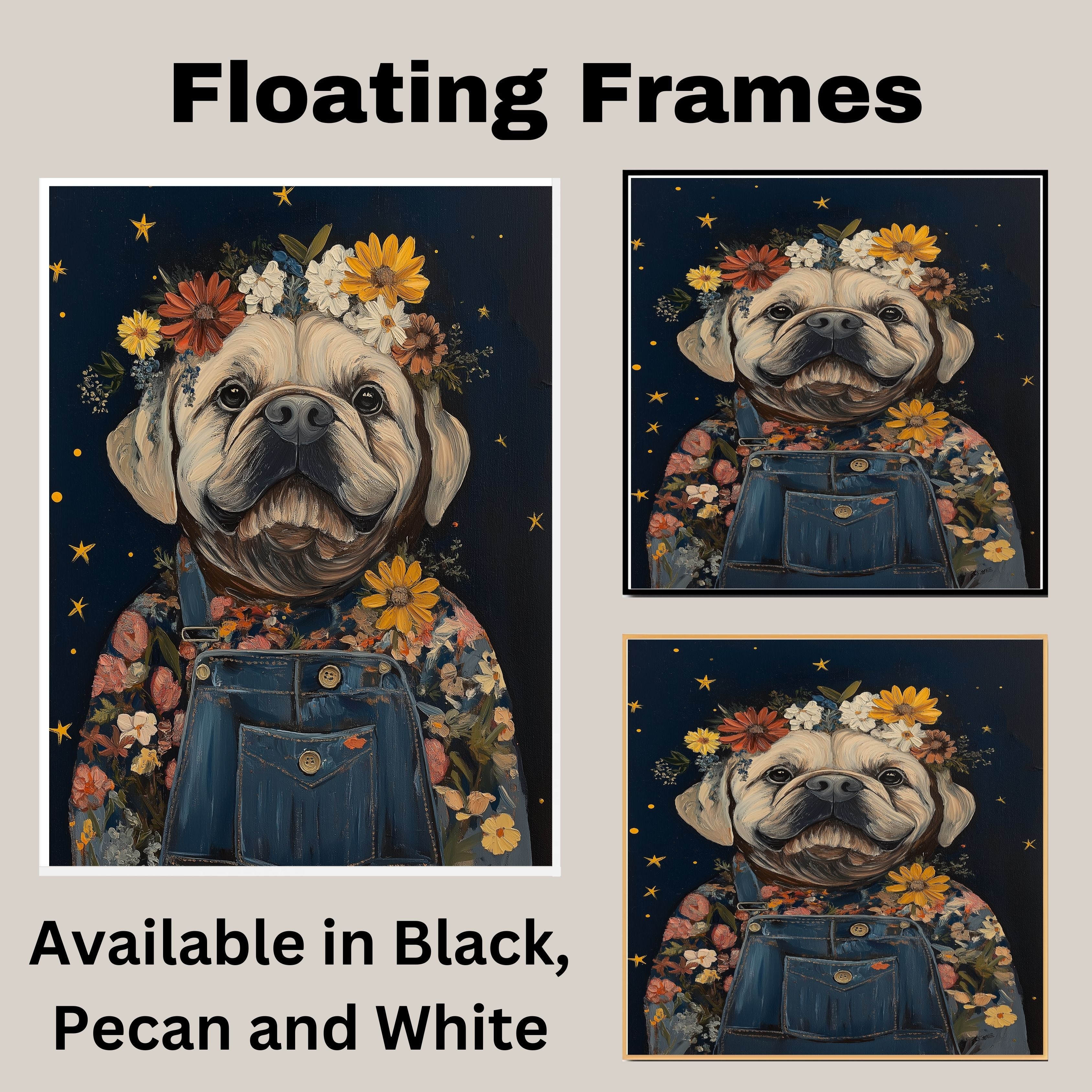 1.5" Thick Floating Framed Canvas: Available in Black, Pecan, and White Grain. Durable shrink-resistant frame. Comes with easy-to-install hanging kits, ready for immediate display.