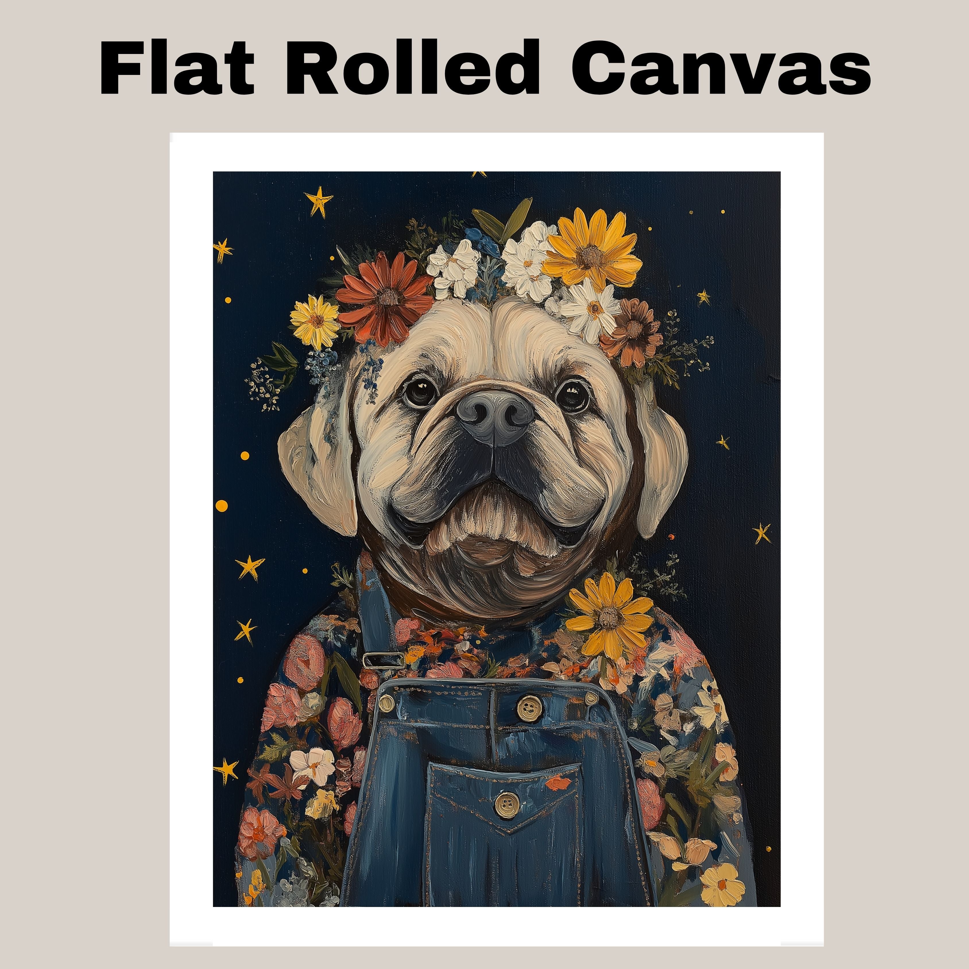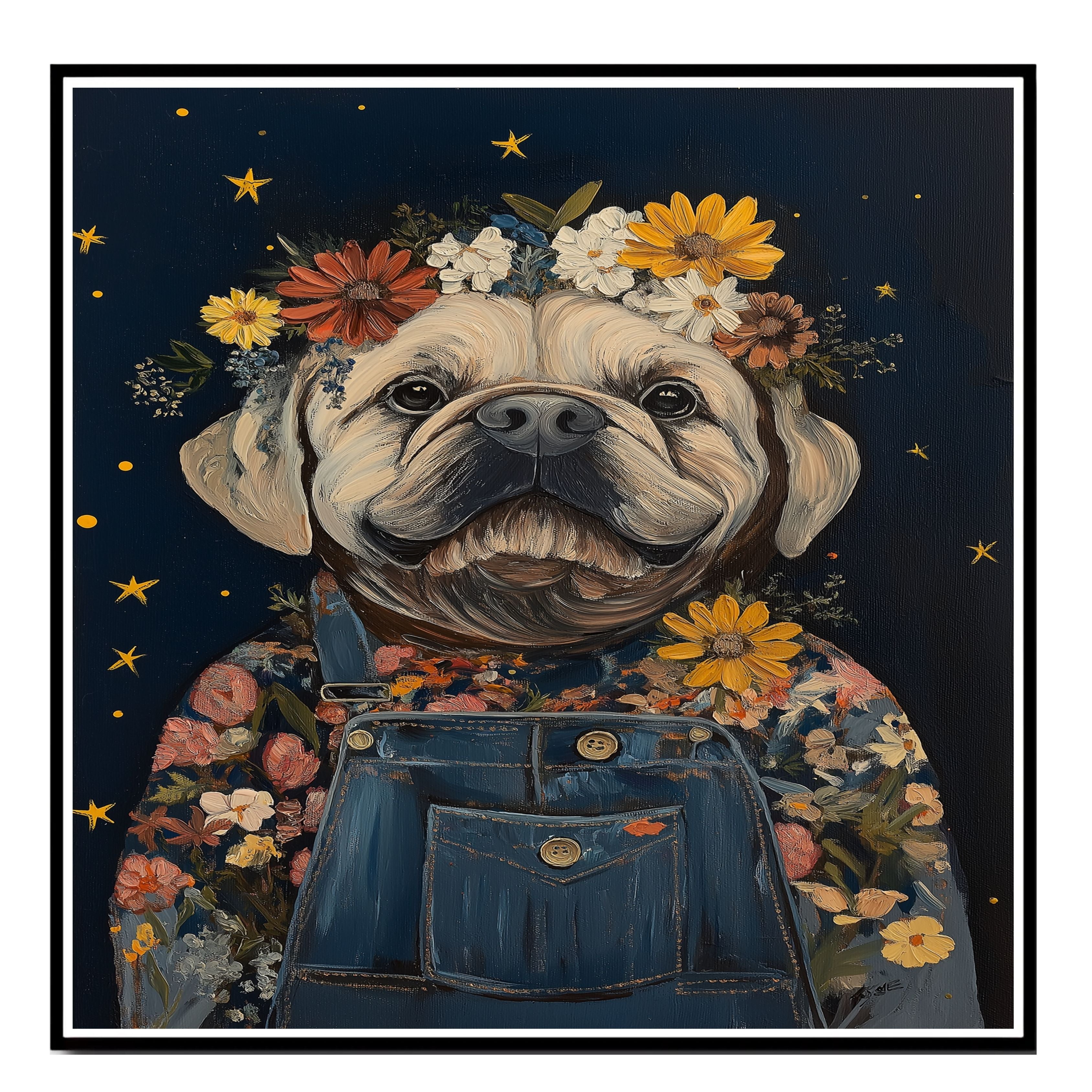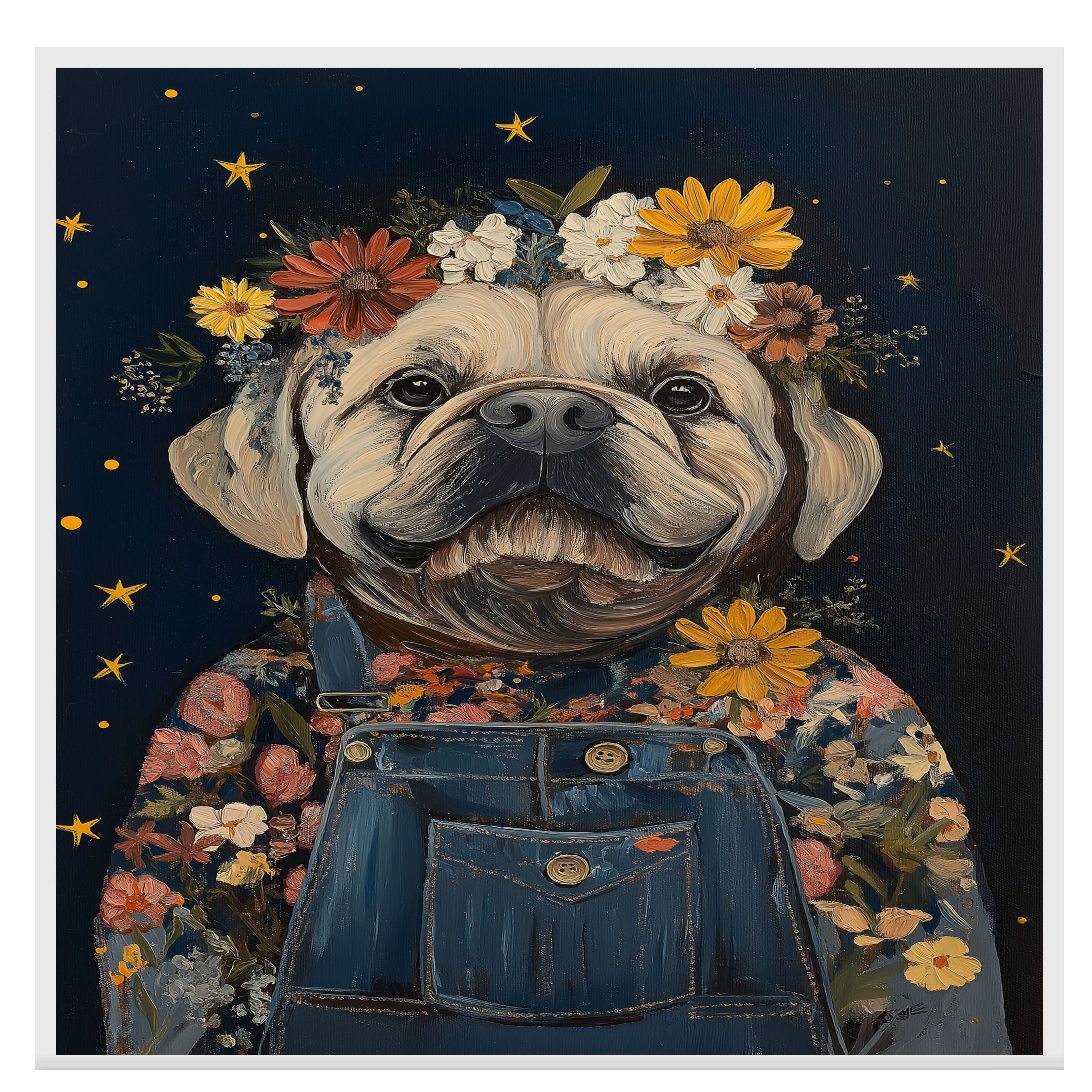 Add charm to any room with this sweet bulldog wall art featuring a vibrant floral crown and overalls Perfect for nursery farmhouse and cottage style decor.