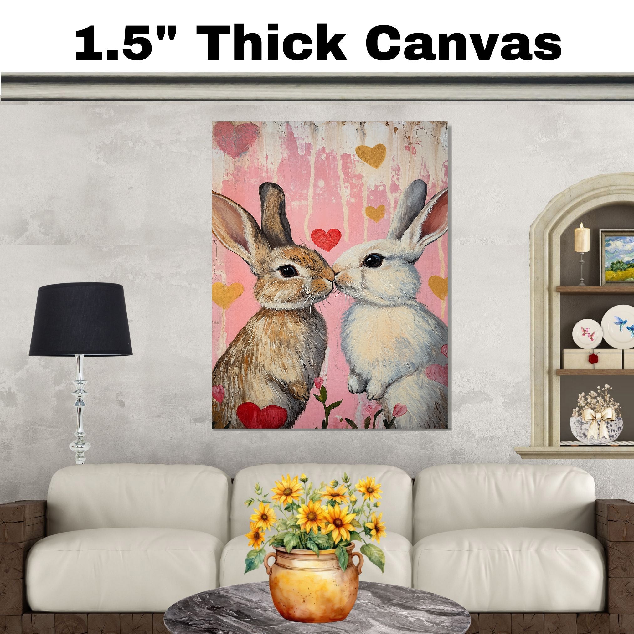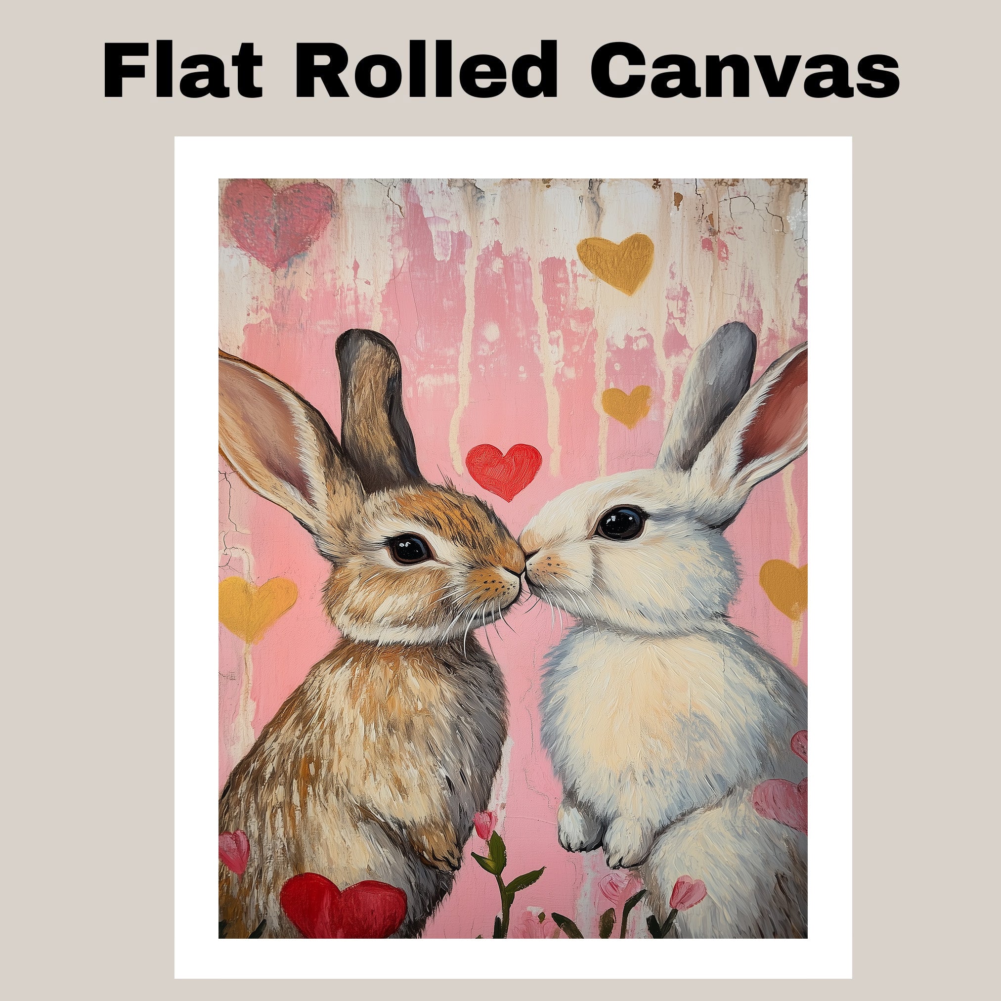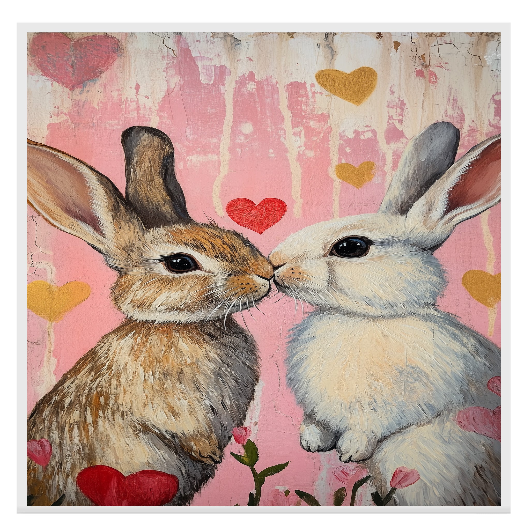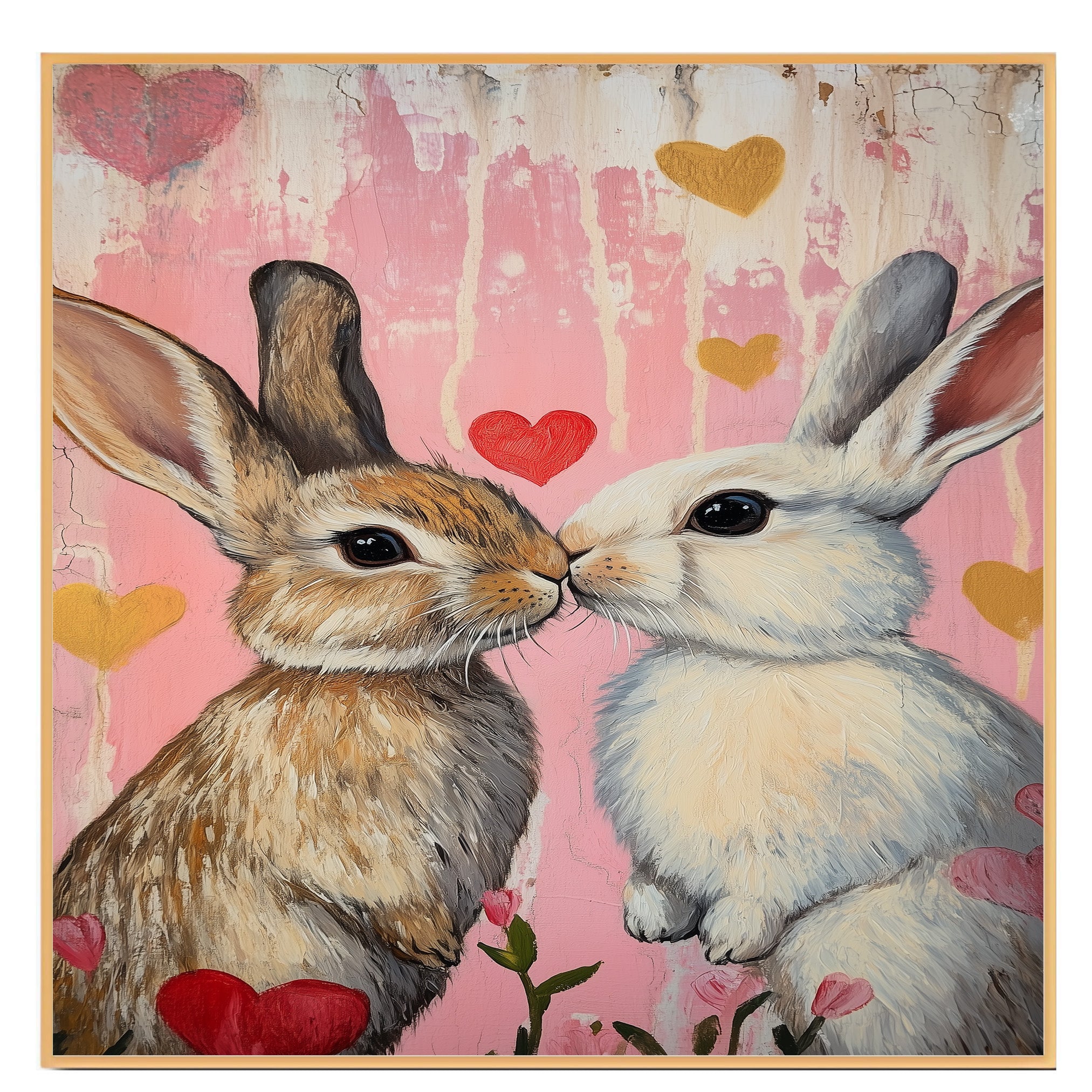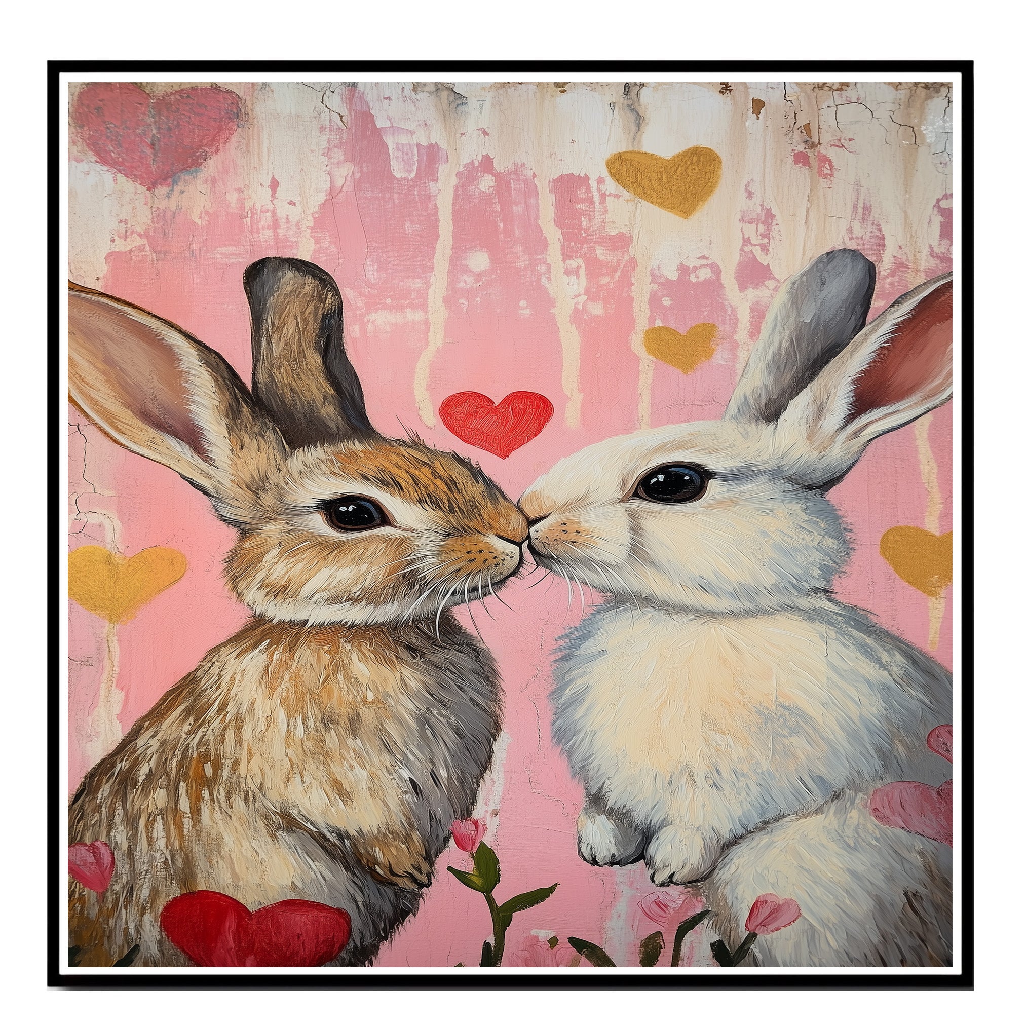 Celebrate tenderness and love with this delightful painting of a bunny couple touching noses, surrounded by hearts and soft floral accents. Set against a charming pink background with golden and red hearts, this artwork brings warmth and romance to any room. Perfect for animal lovers, couples, or special gift occasions.
