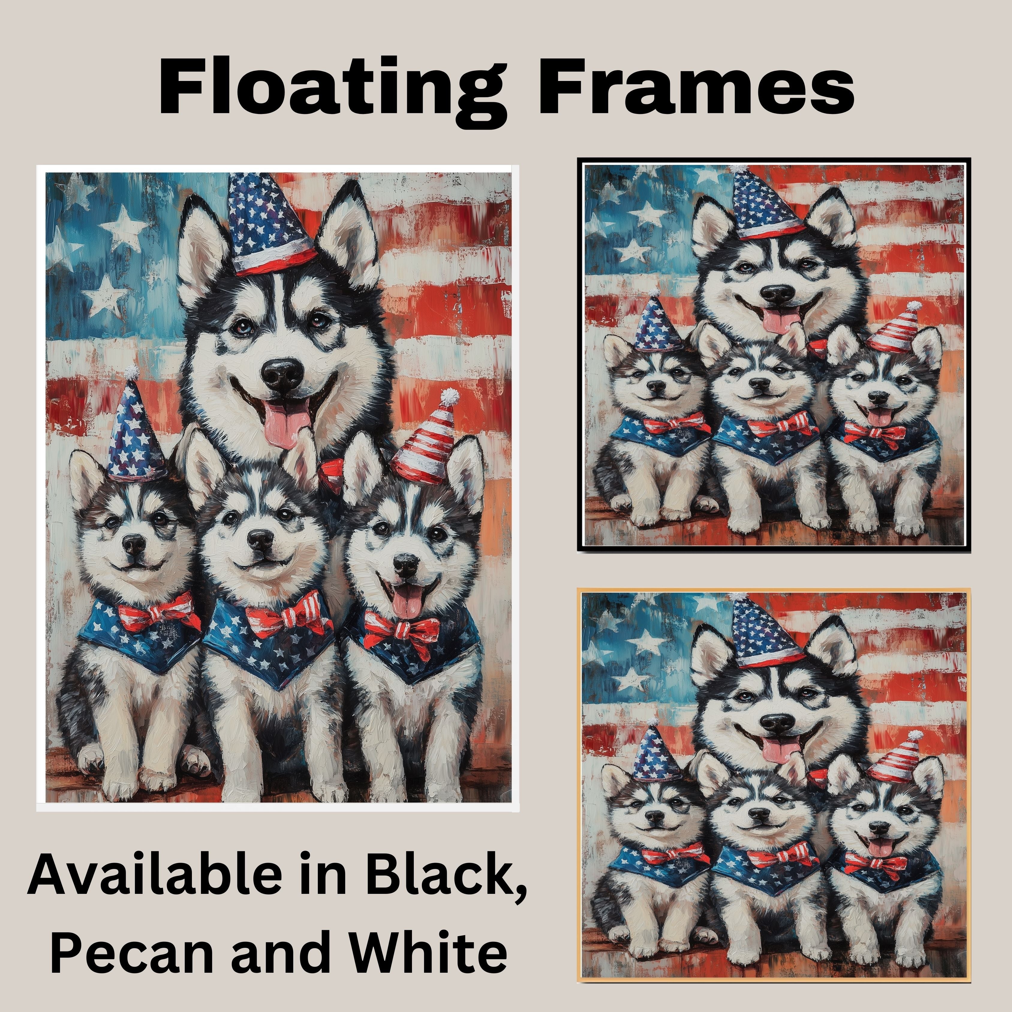 Perfect for Husky lovers and proud pet parents, this eye-catching wall art is available as a gallery-style 1.5" canvas wrap, a beautifully finished floating framed canvas, or a rolled print for your own custom framing. Bring a spark of joy and Americana charm to your home décor just in time for the holiday!
