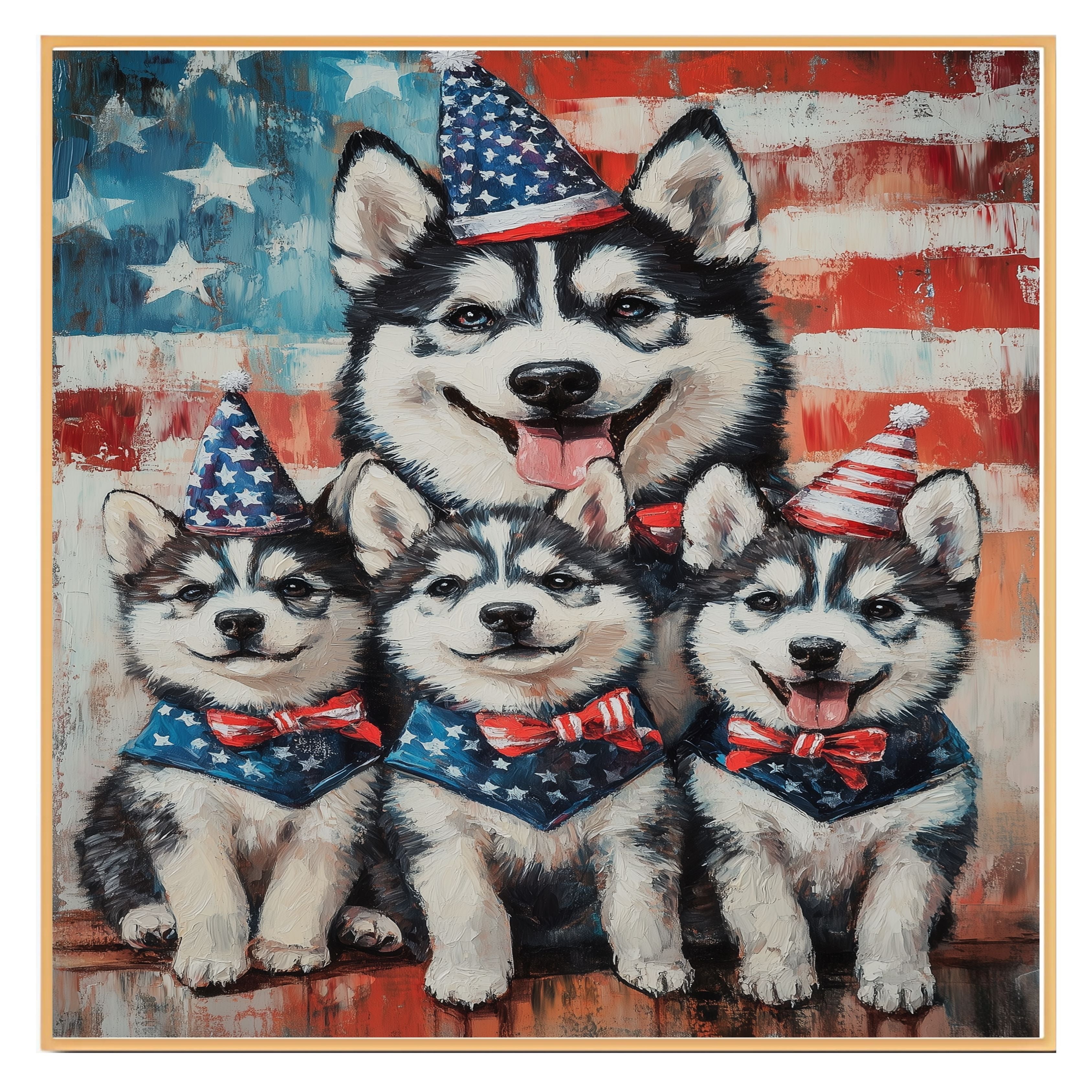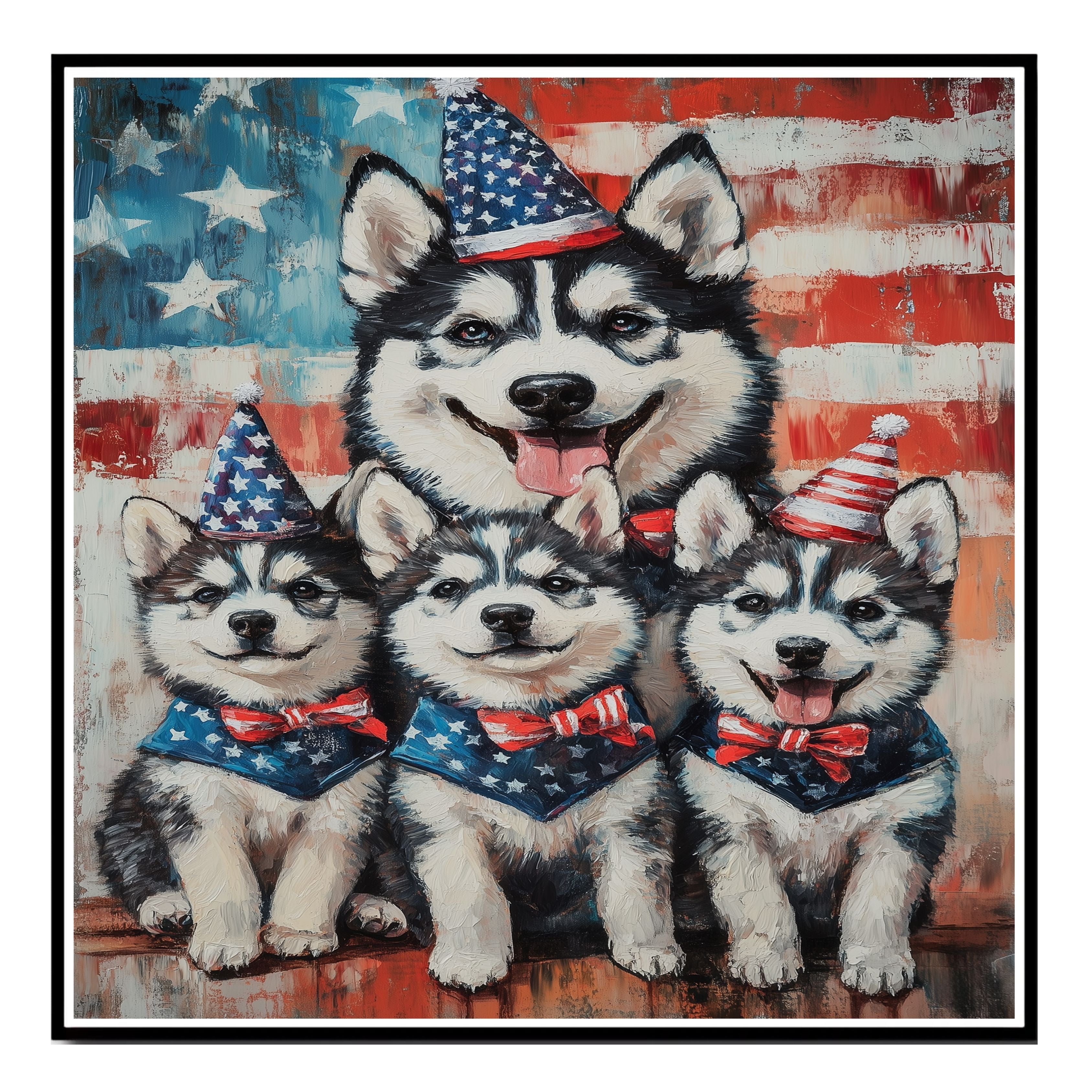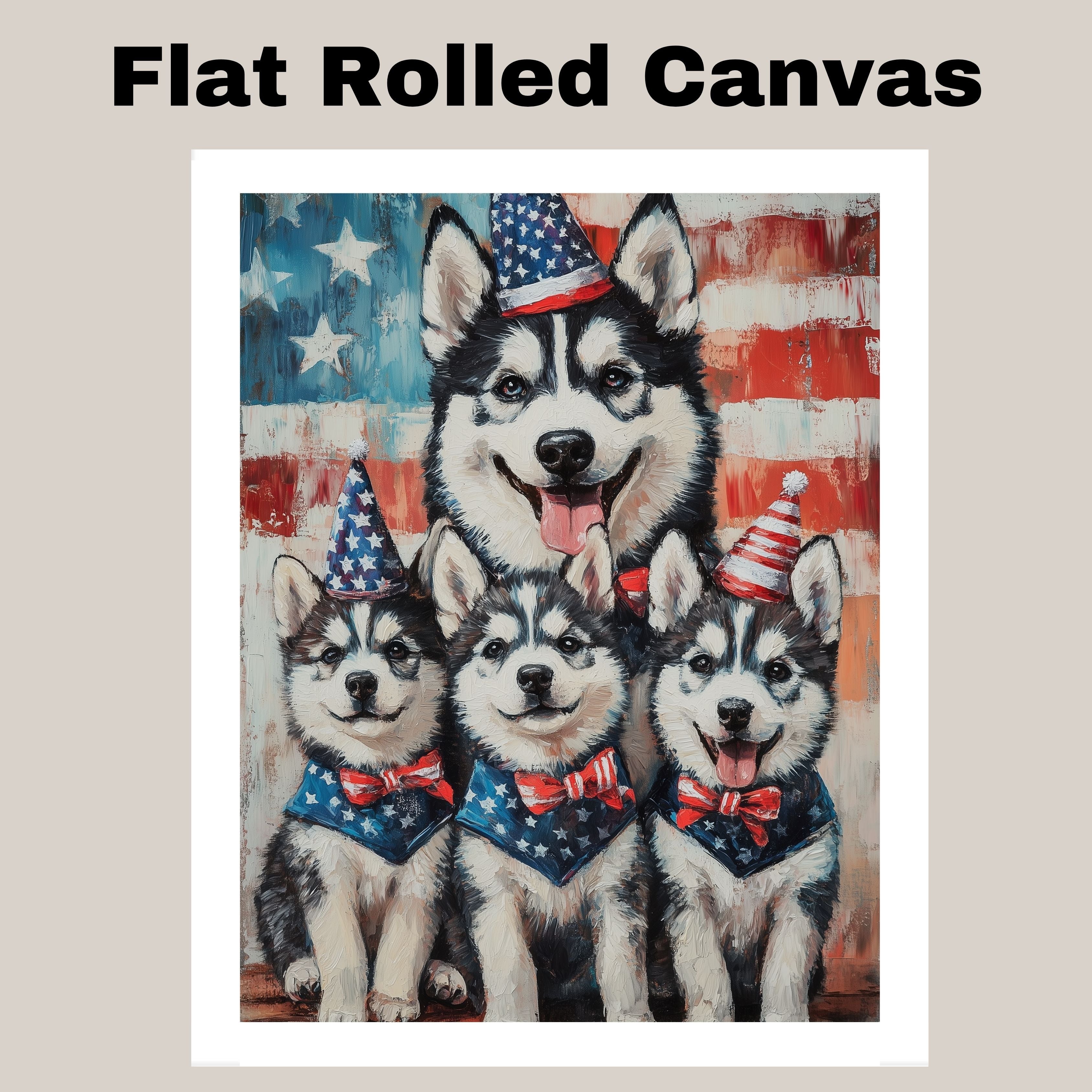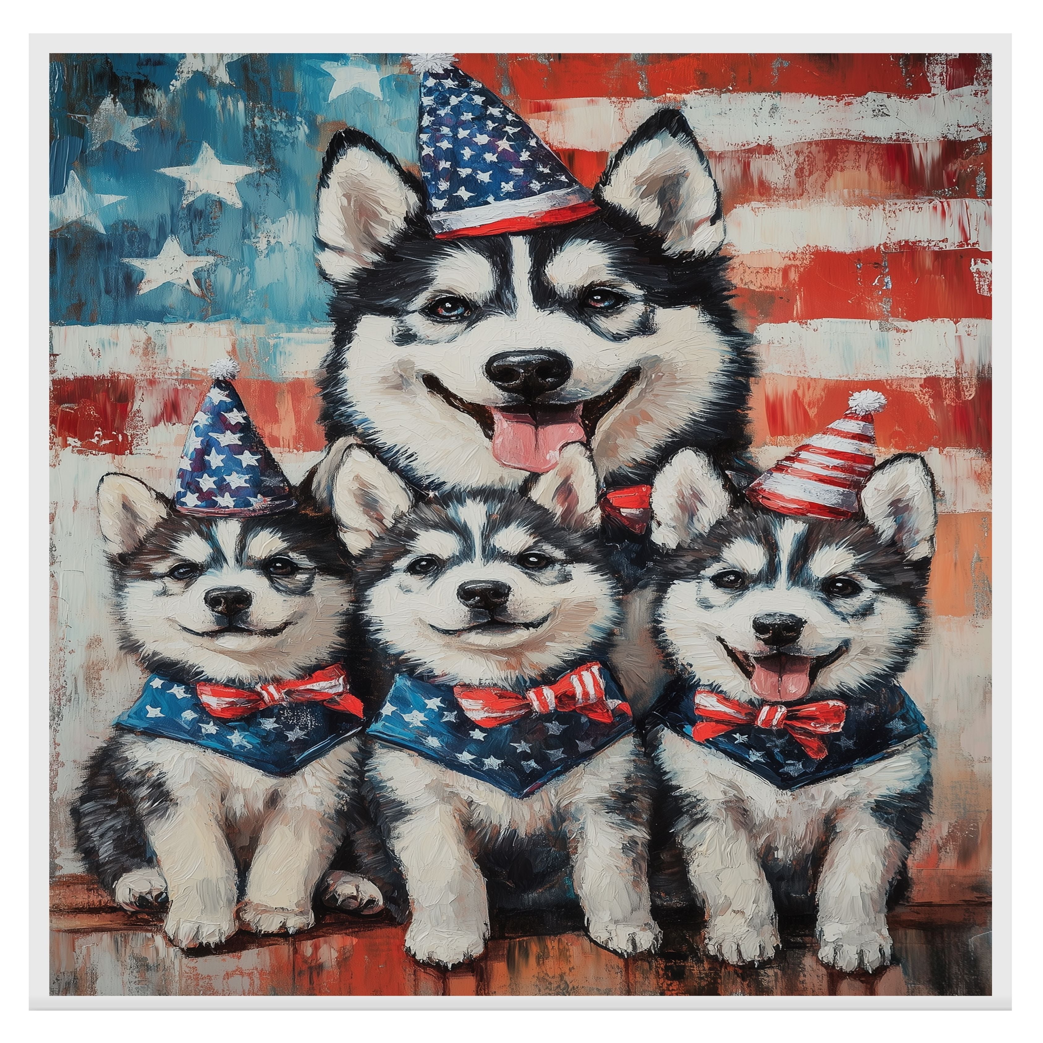 Stars & Stripes Siberian Style: Husky Mom with Cute 4th of July Puppies on Ready to Hang 1.5" Canvas Wrap, Floating Frame, or Rolled Canvas Print