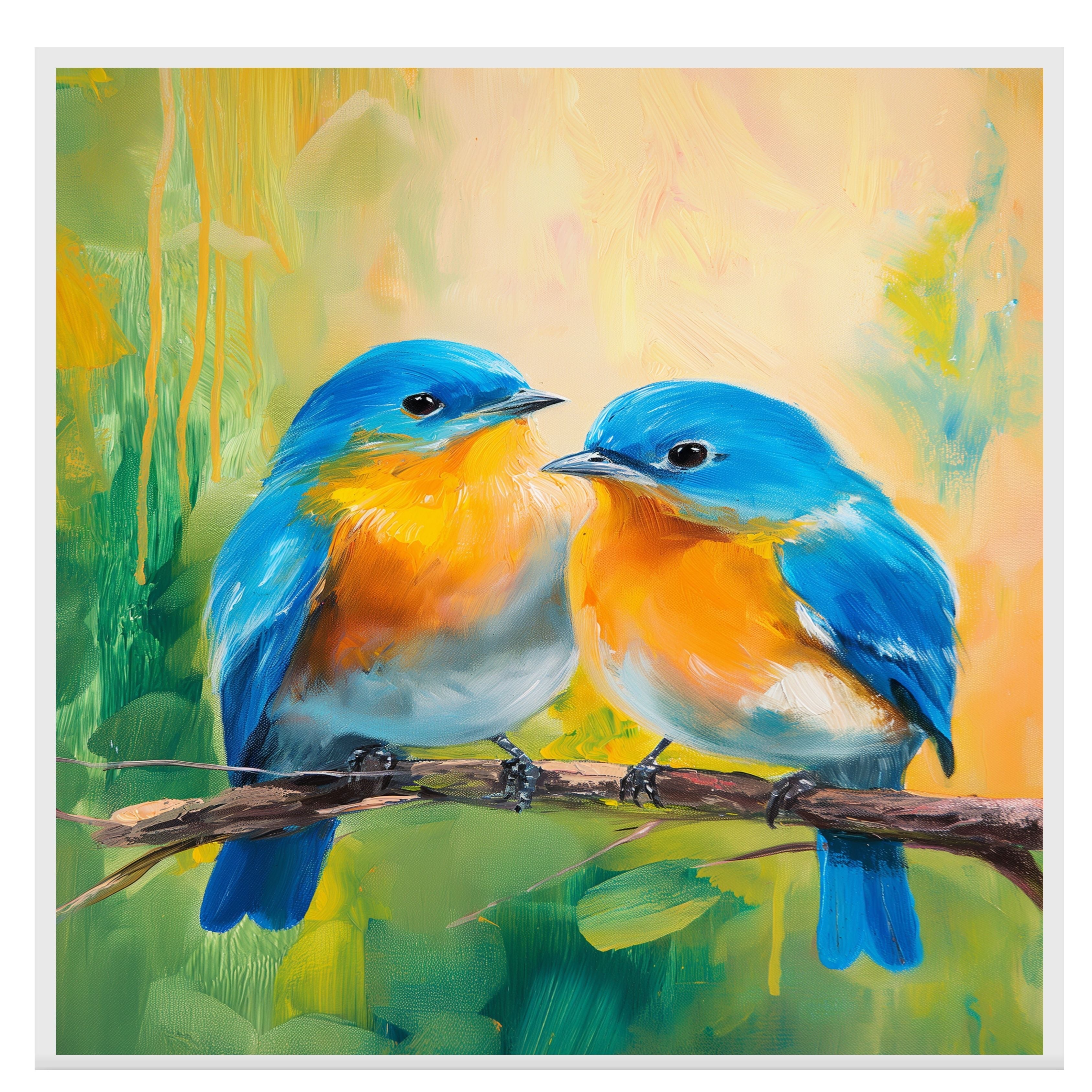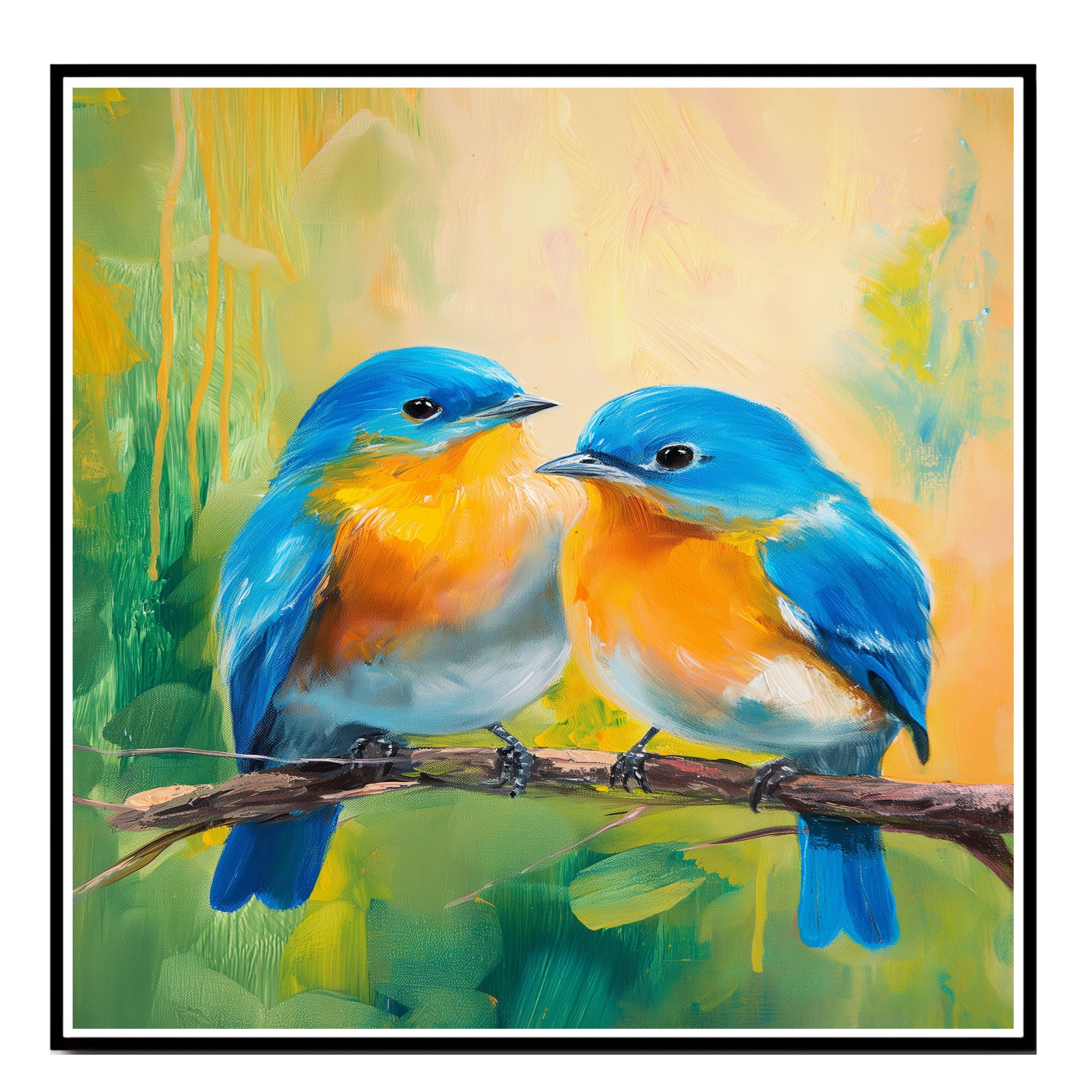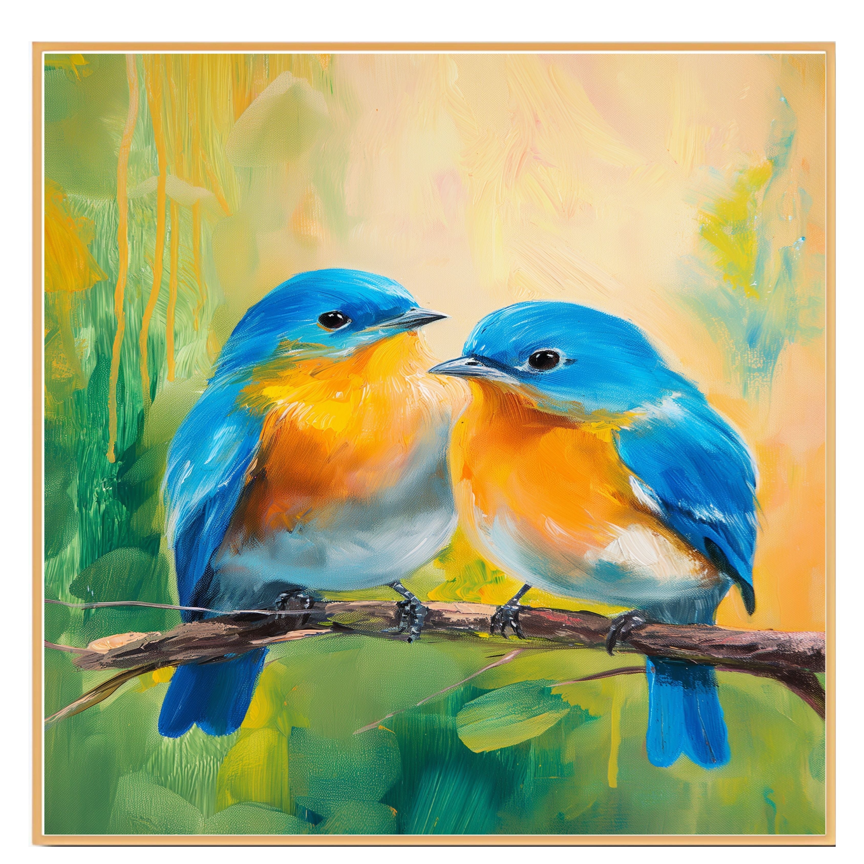 This delightful artwork features a pair of bluebirds with vivid blue wings and warm orange chests perched closely on a branch. Set against a softly textured background of green and yellow tones, the piece radiates warmth, nature, and charm—perfect for bird lovers or adding a cheerful accent to any space.