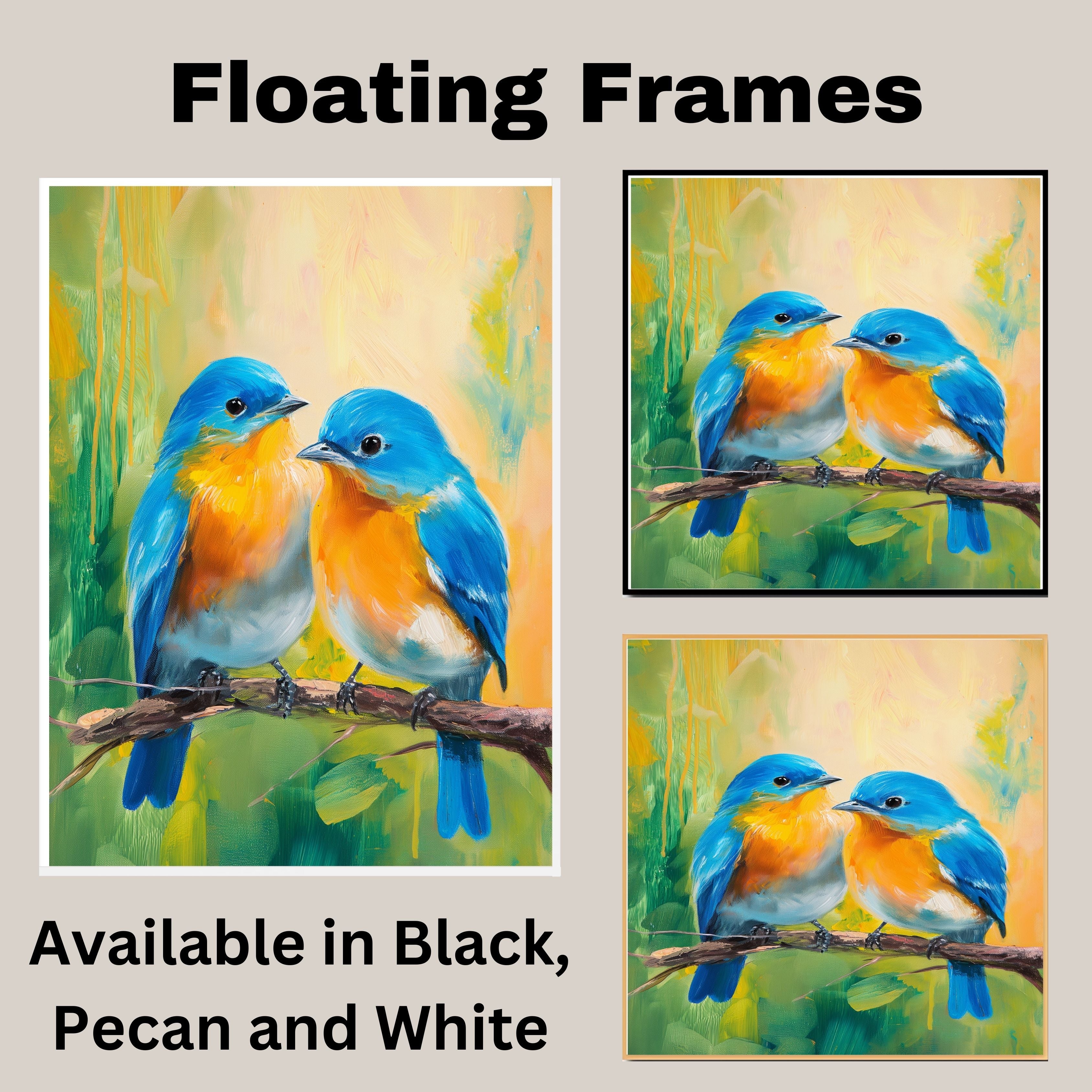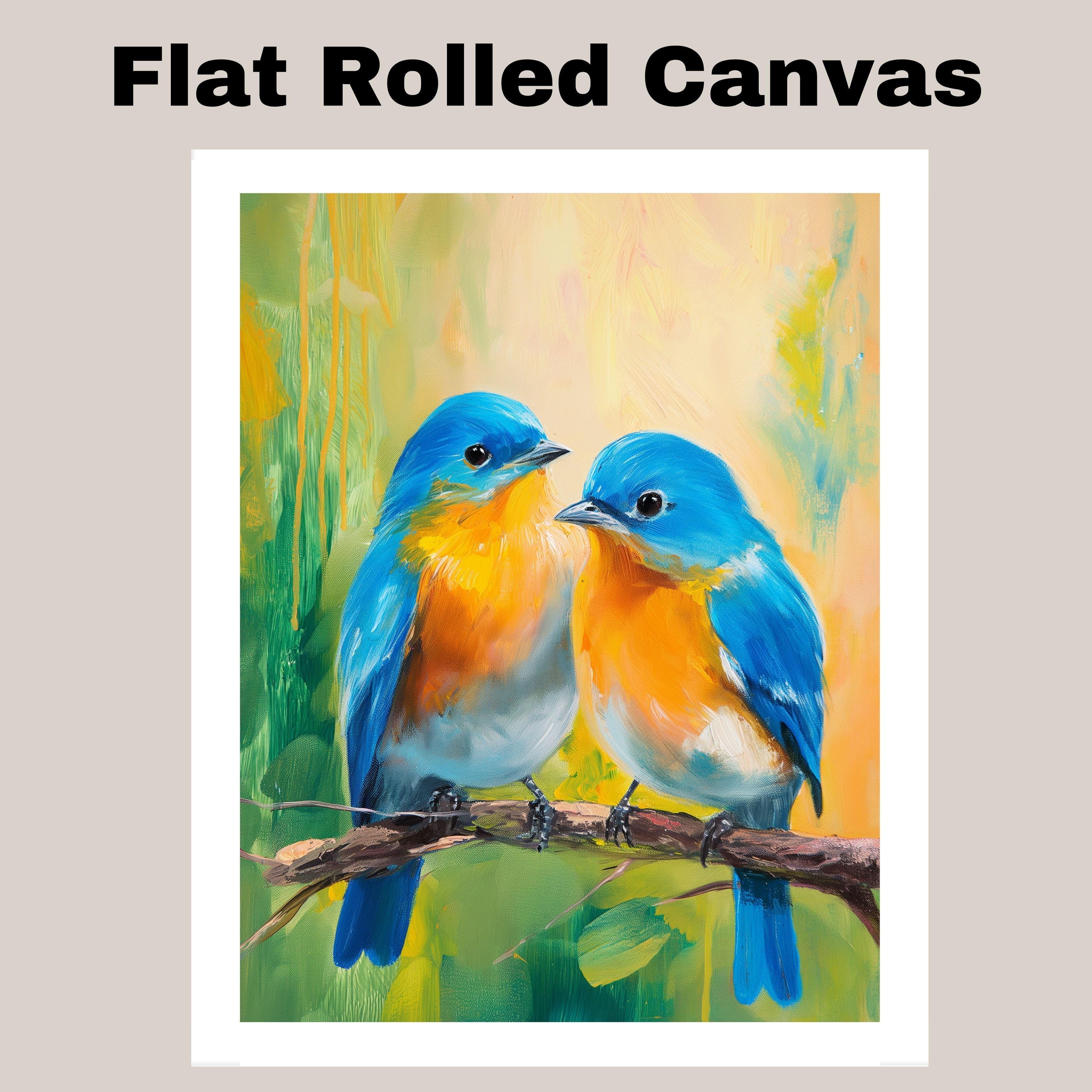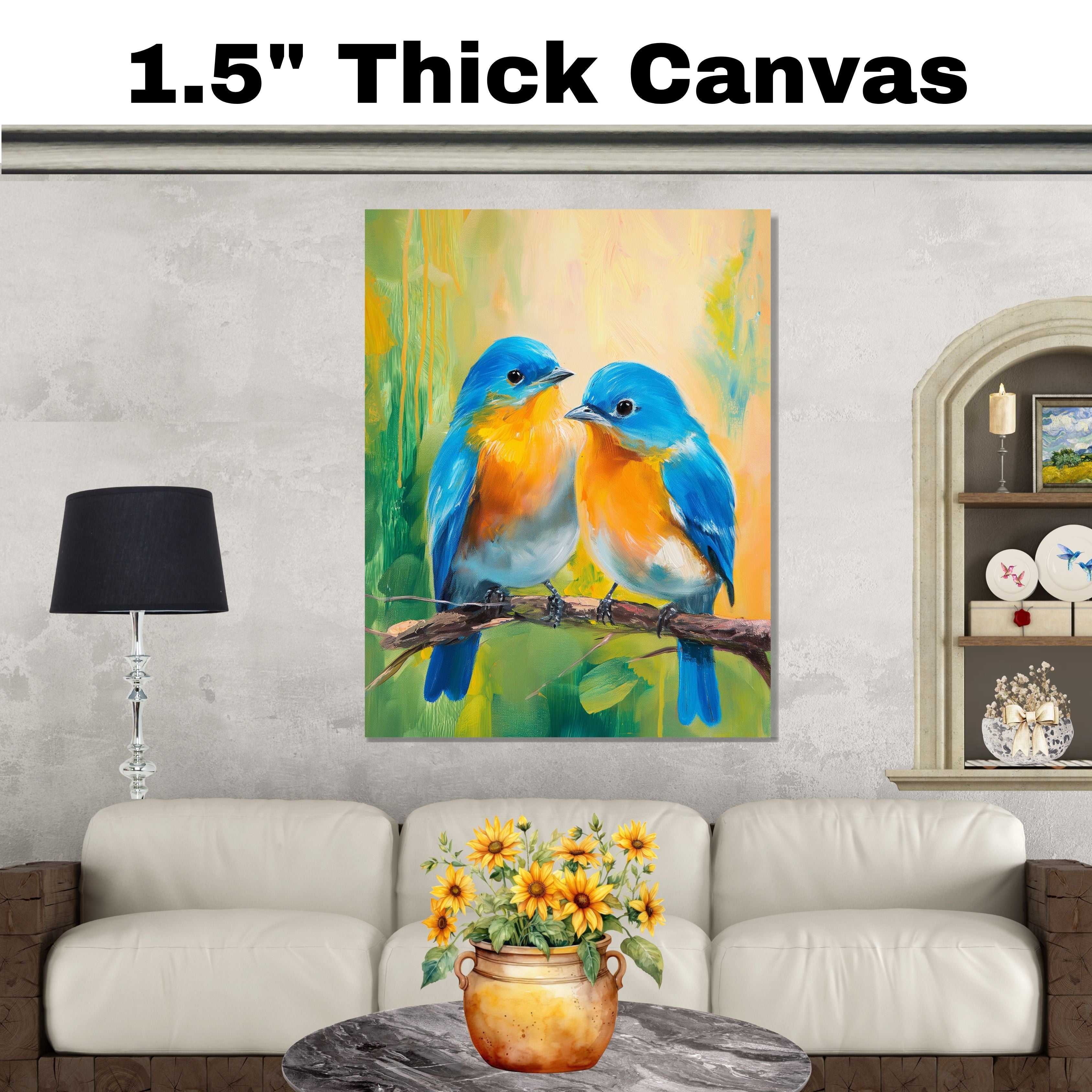 This delightful artwork features a pair of bluebirds with vivid blue wings and warm orange chests perched closely on a branch. Set against a softly textured background of green and yellow tones, the piece radiates warmth, nature, and charm—perfect for bird lovers or adding a cheerful accent to any space.