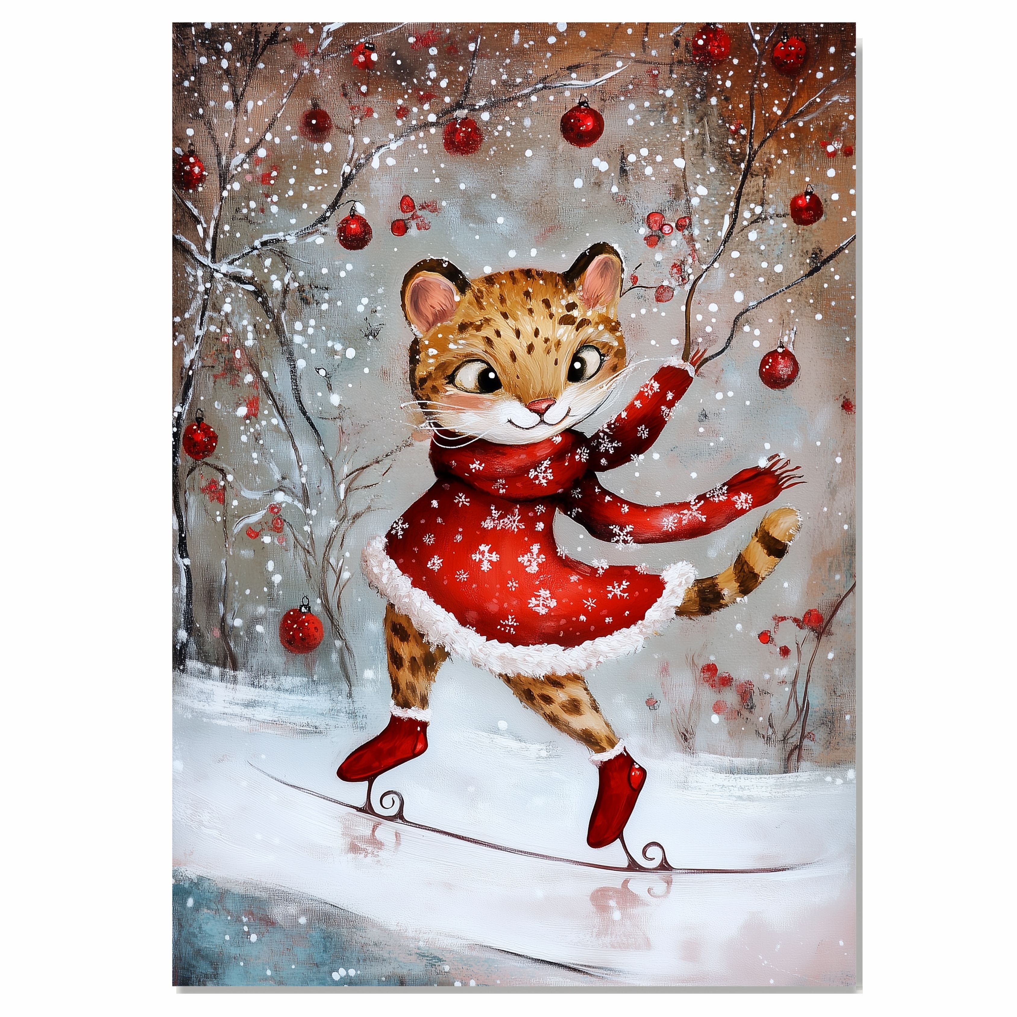 Celebrate the holidays with this heartwarming illustration of a playful cougar ice skating in a red snowflake dress. Surrounded by snowy trees and festive red ornaments, this whimsical piece radiates joy and charm—perfect for winter decor, animal lovers, and fans of magical seasonal art. A delightful addition to any cozy Christmas collection.