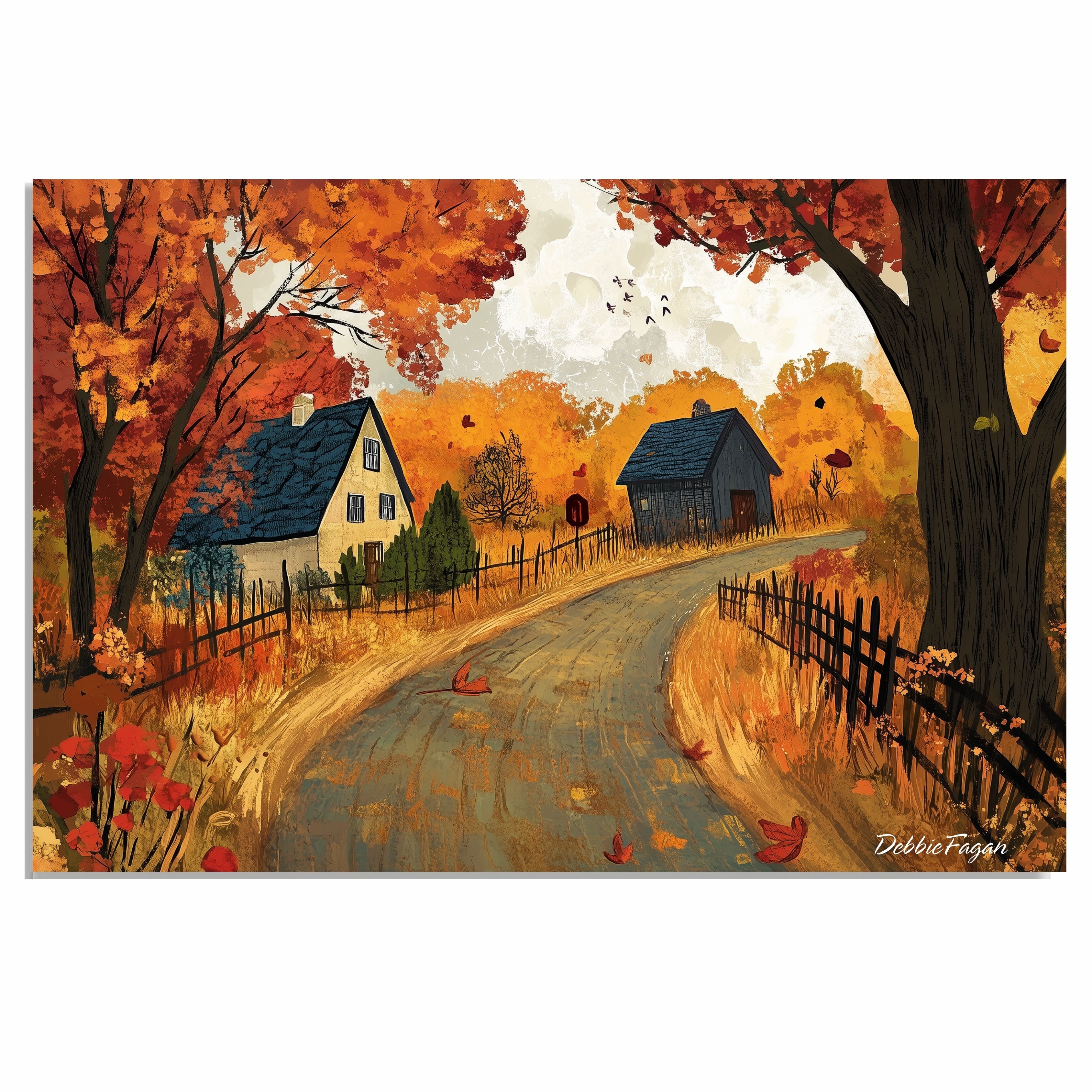 This inviting folk art painting captures a peaceful autumn day on a winding country road flanked by cozy cottages. Surrounded by brilliant orange and red trees, rustic fences, and falling leaves, the scene radiates warmth, nostalgia, and seasonal charm. A perfect piece for fall-inspired decor.