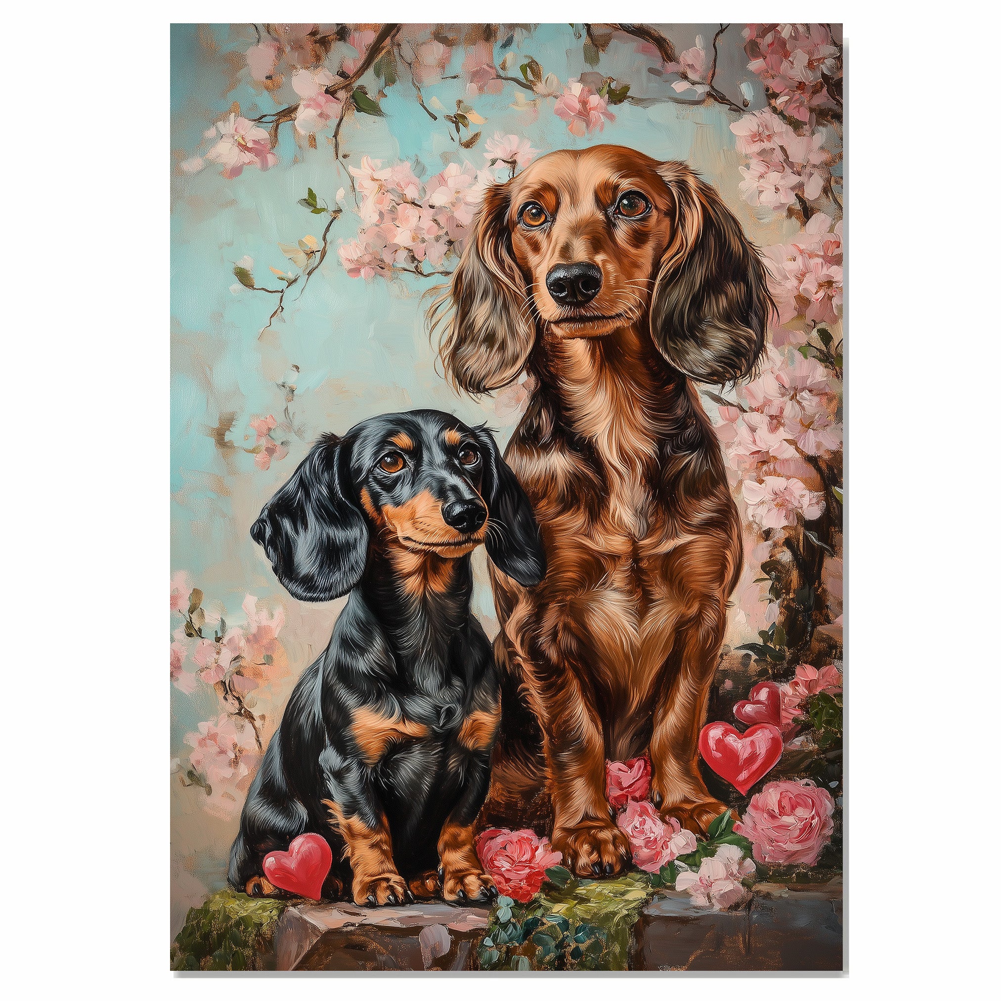 Celebrate loyalty and affection with this stunning painting featuring a dachshund couple surrounded by delicate pink flowers and soft hearts. Set against a serene light blue background, this heartwarming artwork brings elegance and love into any space. Perfect for dog lovers, romantic decor, and special gifts.