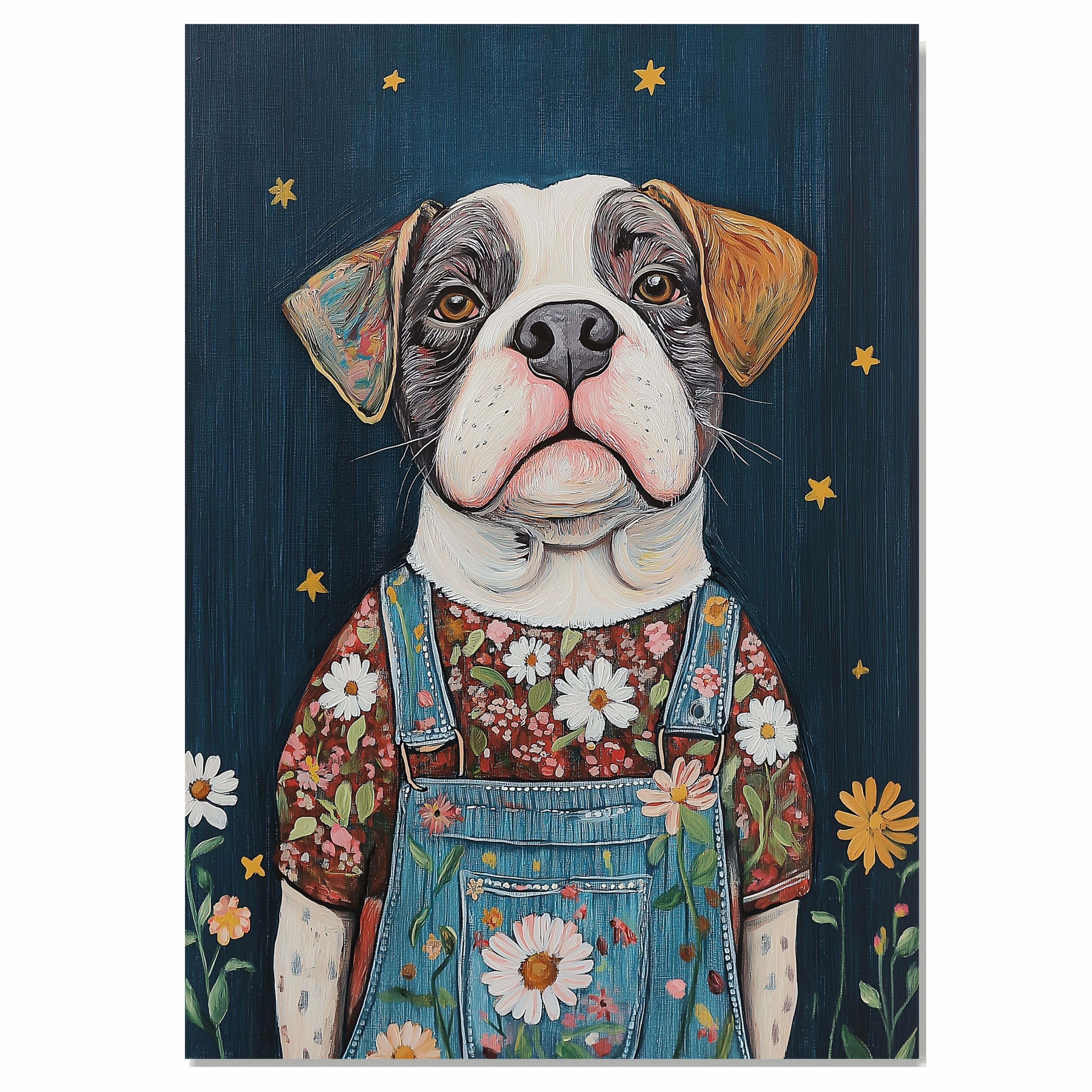 Add playful charm to your space with this adorable plump dog wearing overalls and a floral shirt under a starry night sky perfect for farmhouse nursery and gifts.