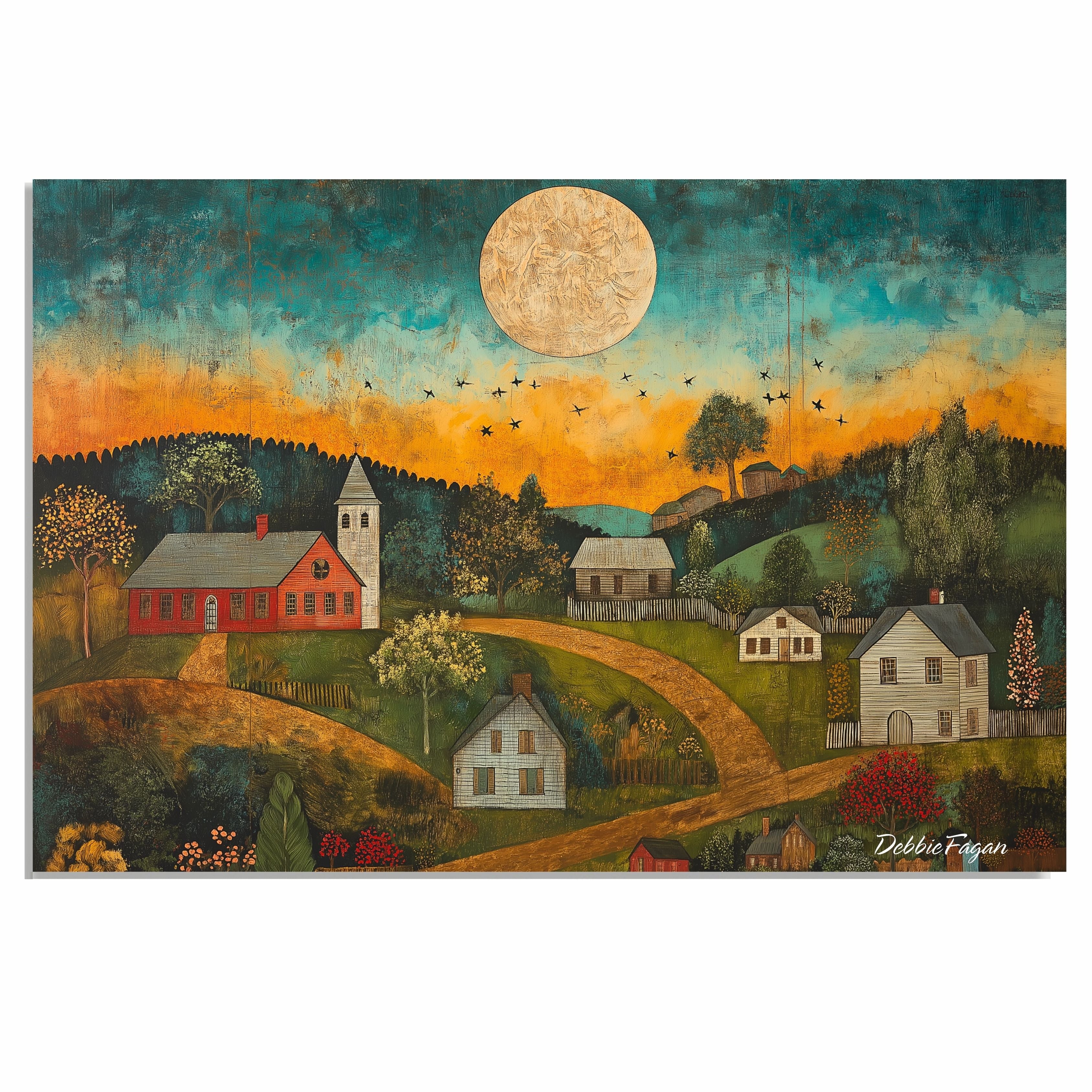 This beautifully detailed folk art painting showcases a peaceful countryside village under a glowing full moon and vivid sunset sky. Quaint homes, winding roads, and birds in flight capture the essence of rustic Americana charm and nostalgia.
