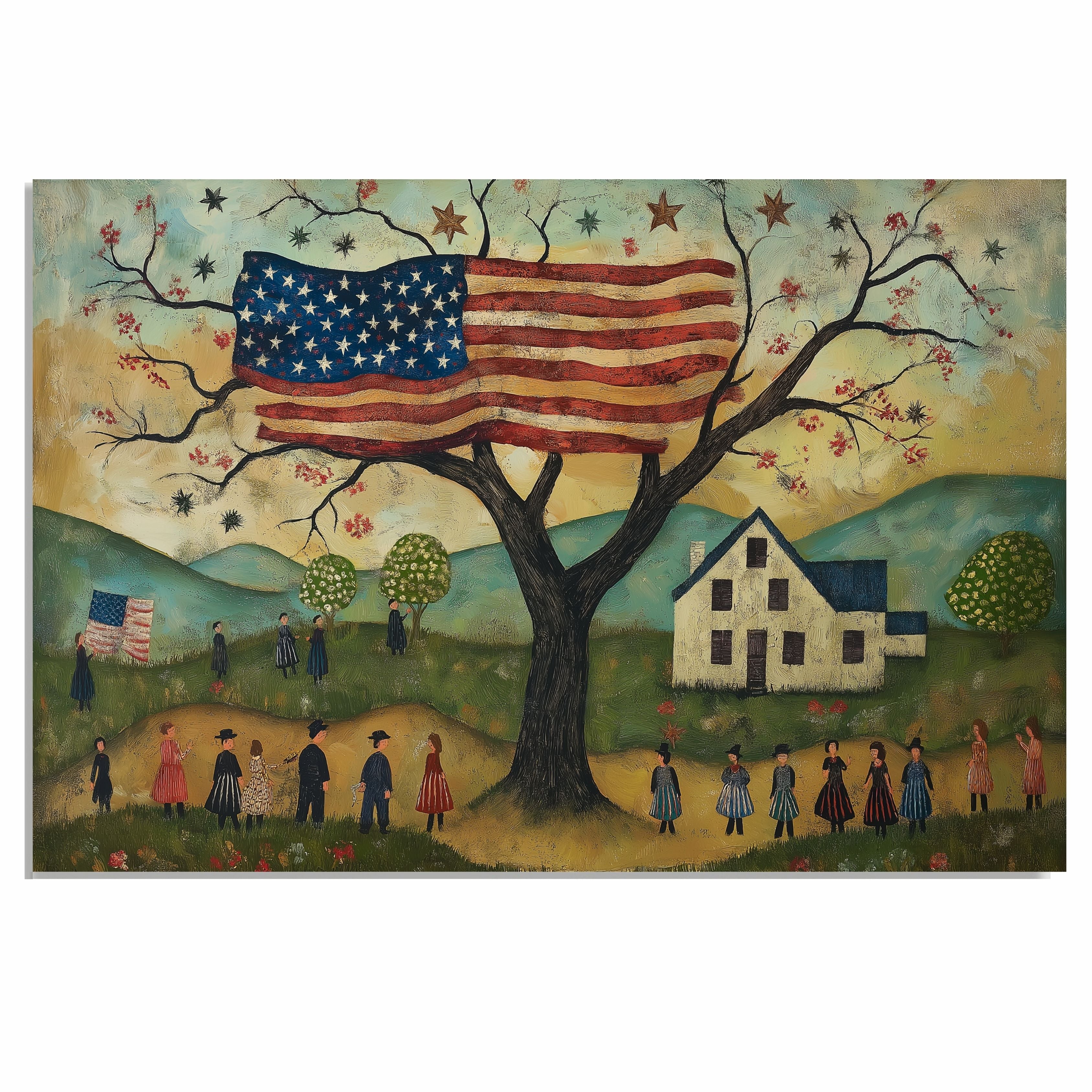 Capture the nostalgic spirit of Americana with this delightful folk art painting featuring villagers gathered under a large American flag blooming from a tree. With a rolling countryside, colonial-style home, and parade of figures dressed in historic attire, this whimsical 4th of July scene celebrates tradition, freedom, and community. A beautiful piece for lovers of rustic, patriotic charm.