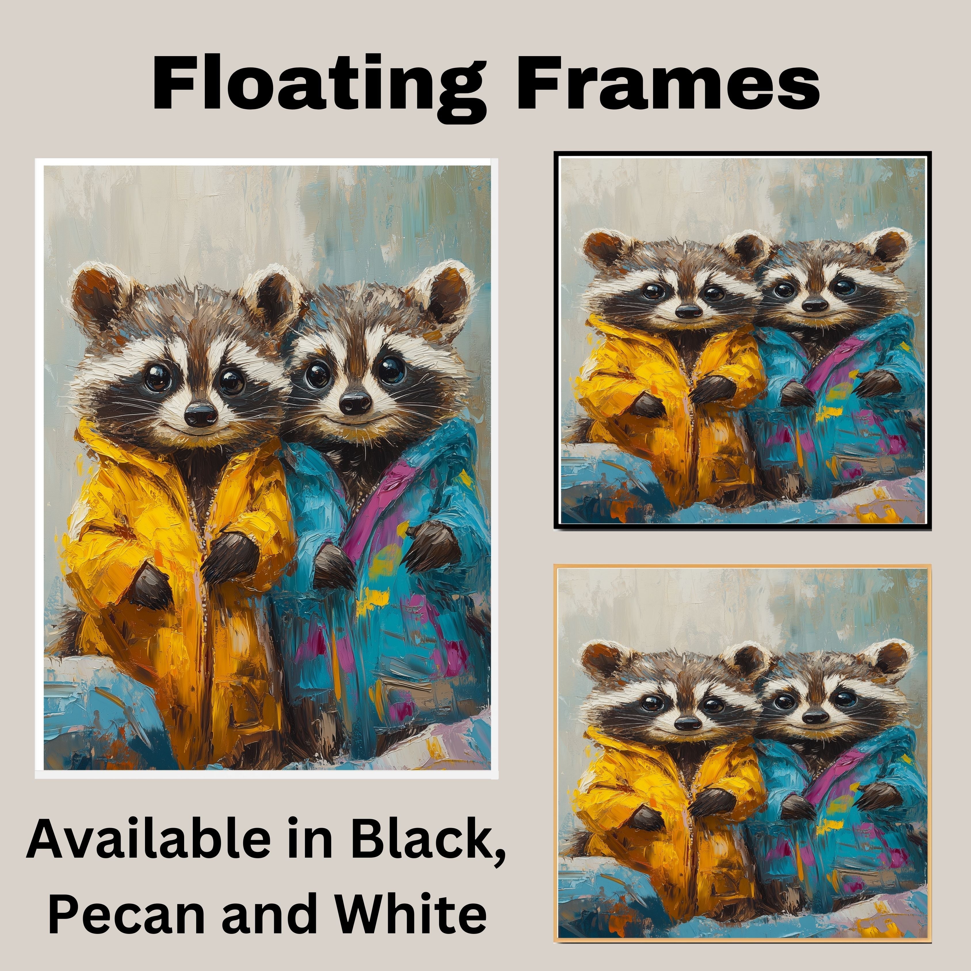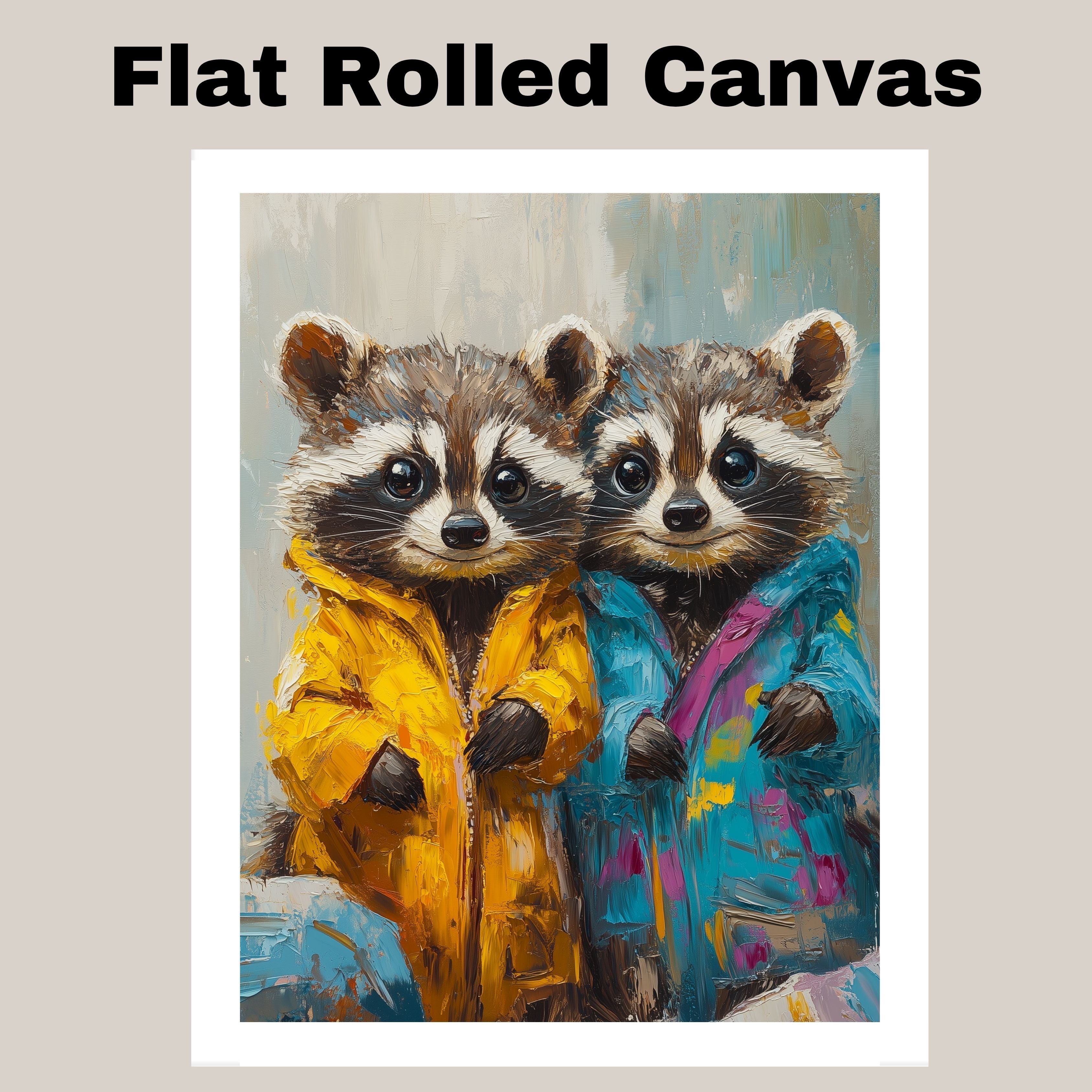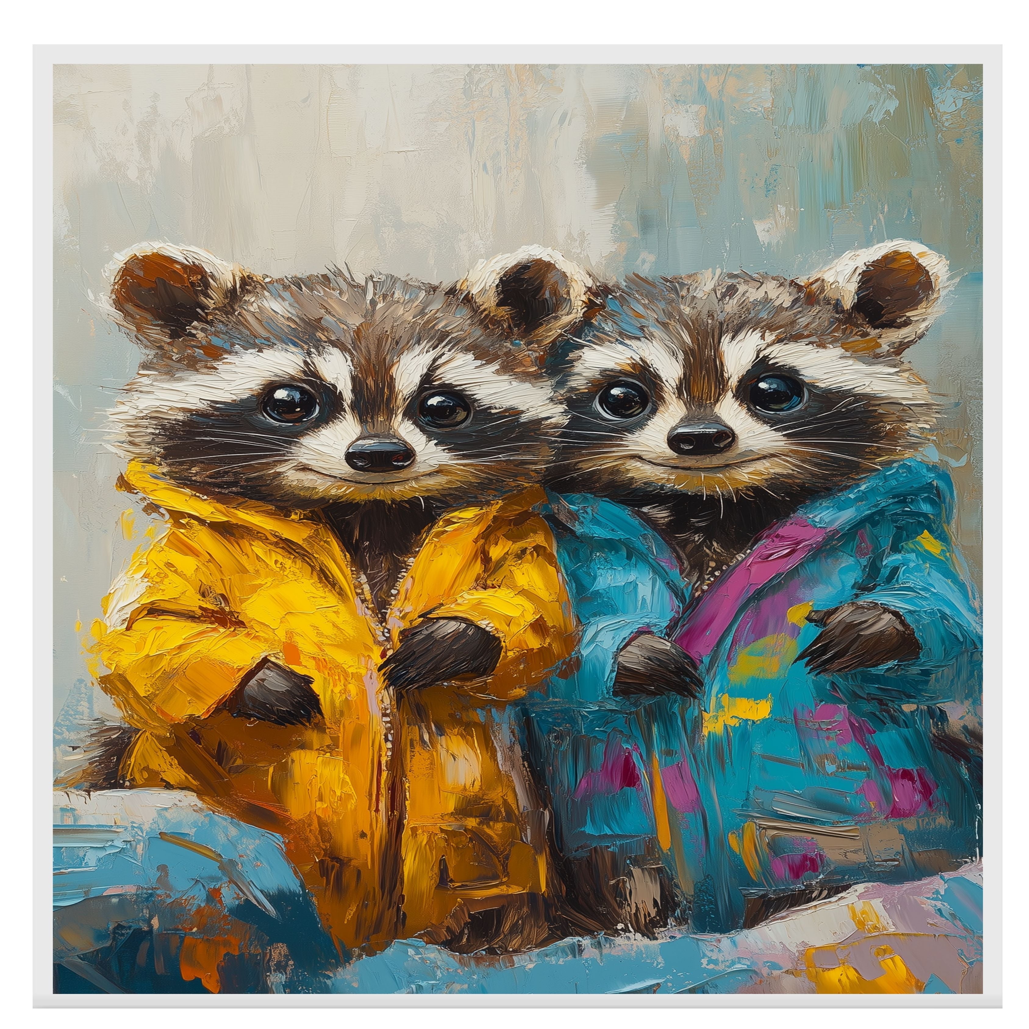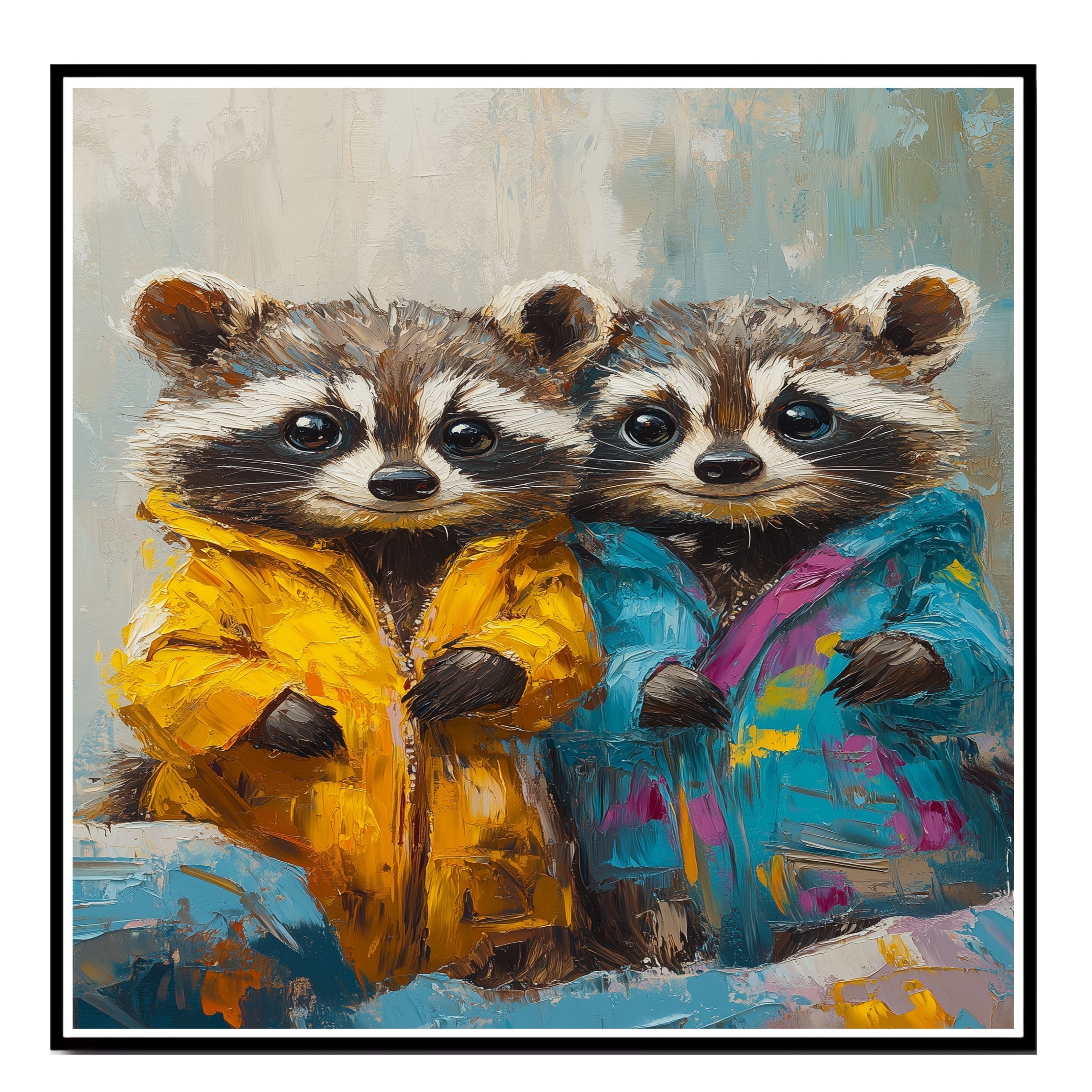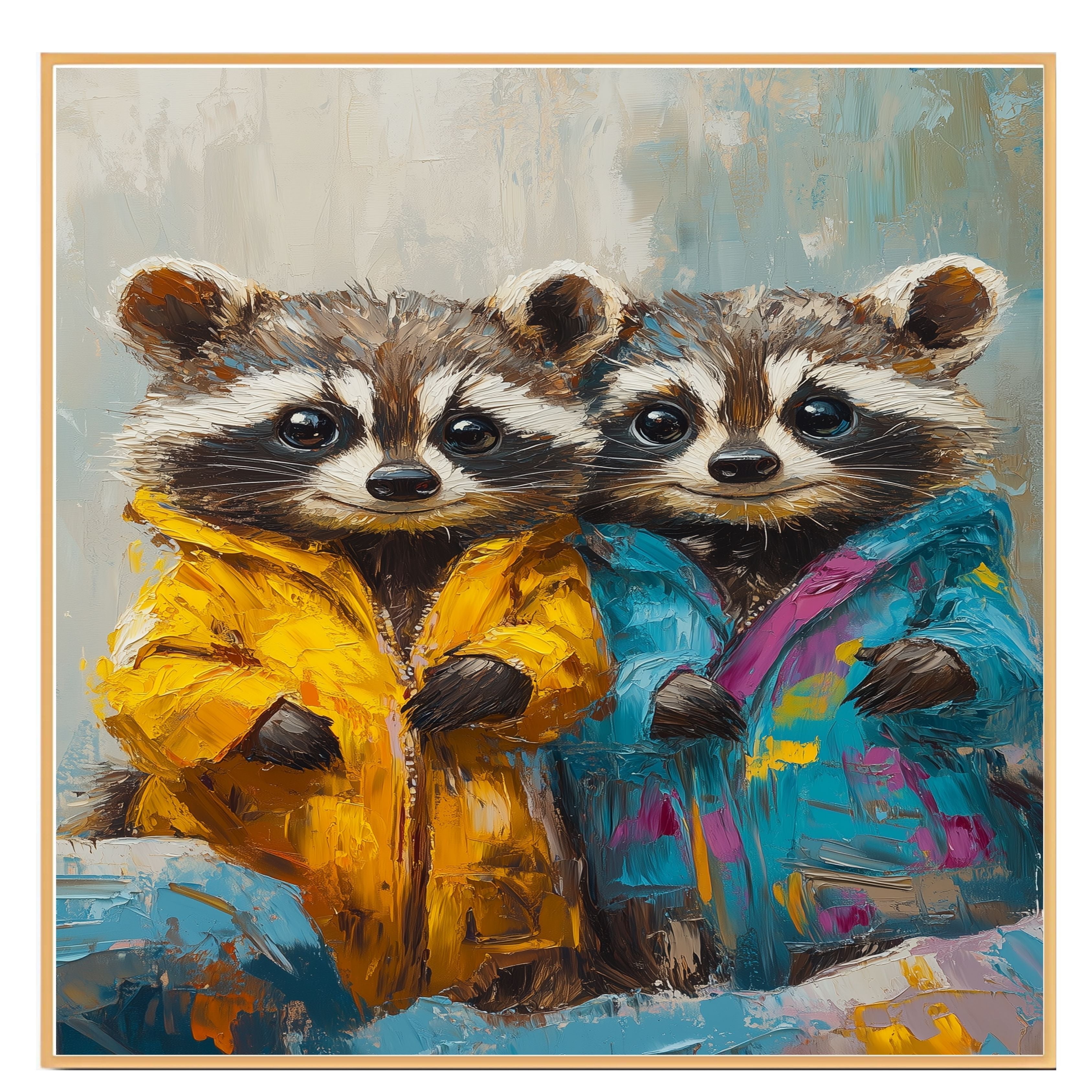 This delightful painting captures two sweet raccoons dressed in playful, colorful jackets. Their bright eyes and charming expressions make them perfect for adding a heartwarming touch to any room. Ideal for nurseries, children’s spaces, or as a gift for animal lovers who enjoy imaginative, whimsical artwork.